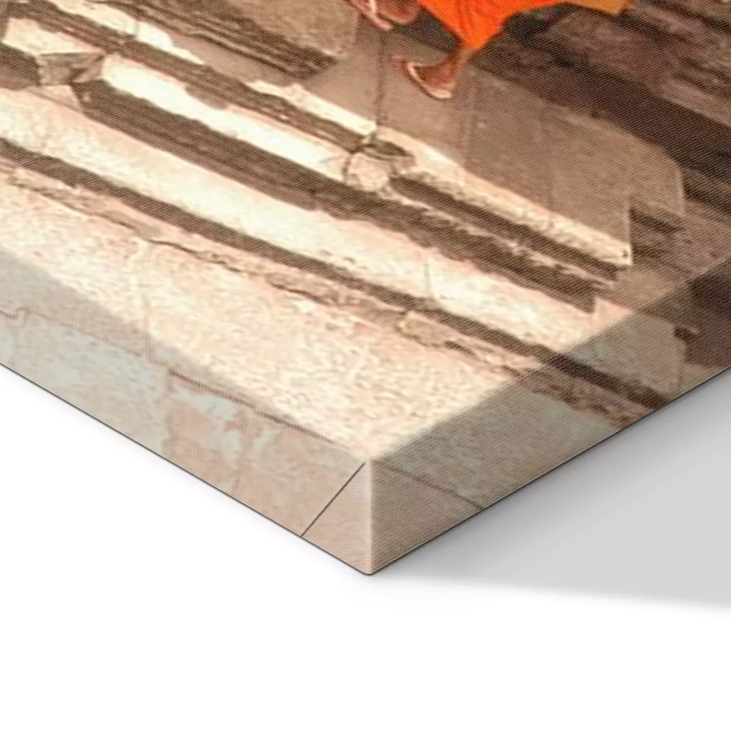 De print wordt aangebracht op hoogwaardig canvas dat op een schildersweefgetouw (spieraam) wordt gespannen. Omdat de print de zijranden bedekt, hoeft het ontwerp niet met een extra kader te worden omlijst. Wij raden ook composities aan die uit meerdere foto's bestaan en zo een coherente compositie vormen.