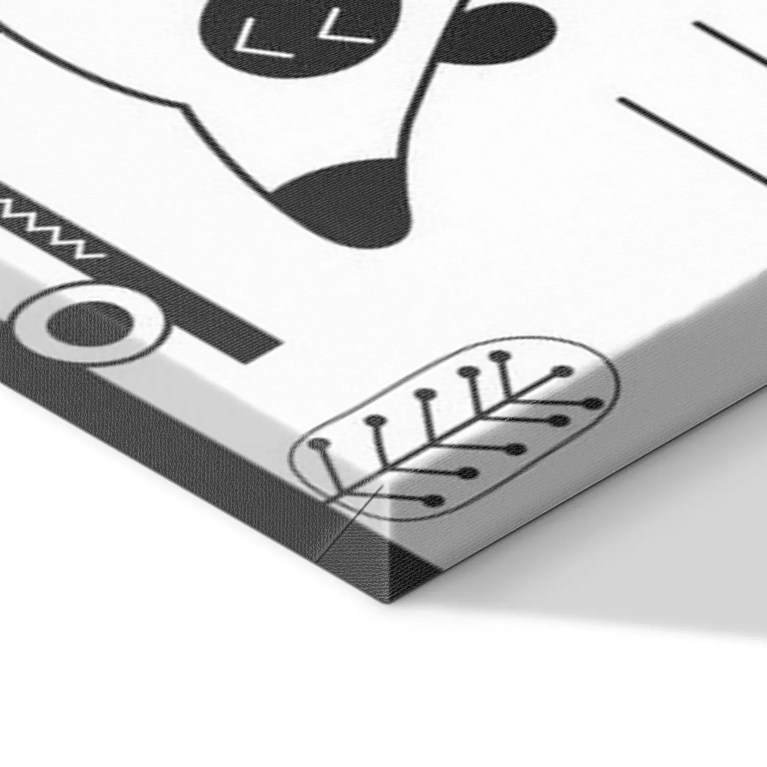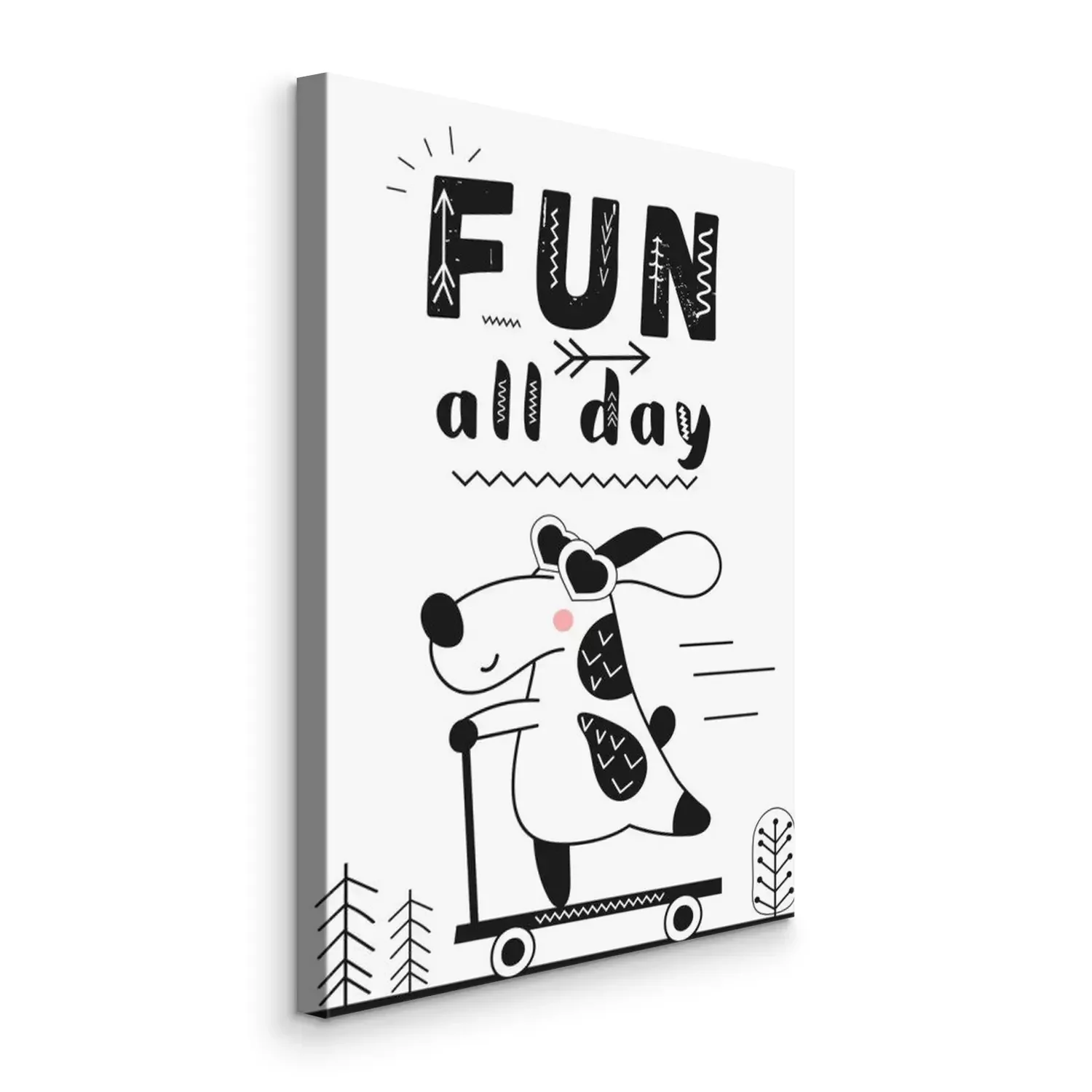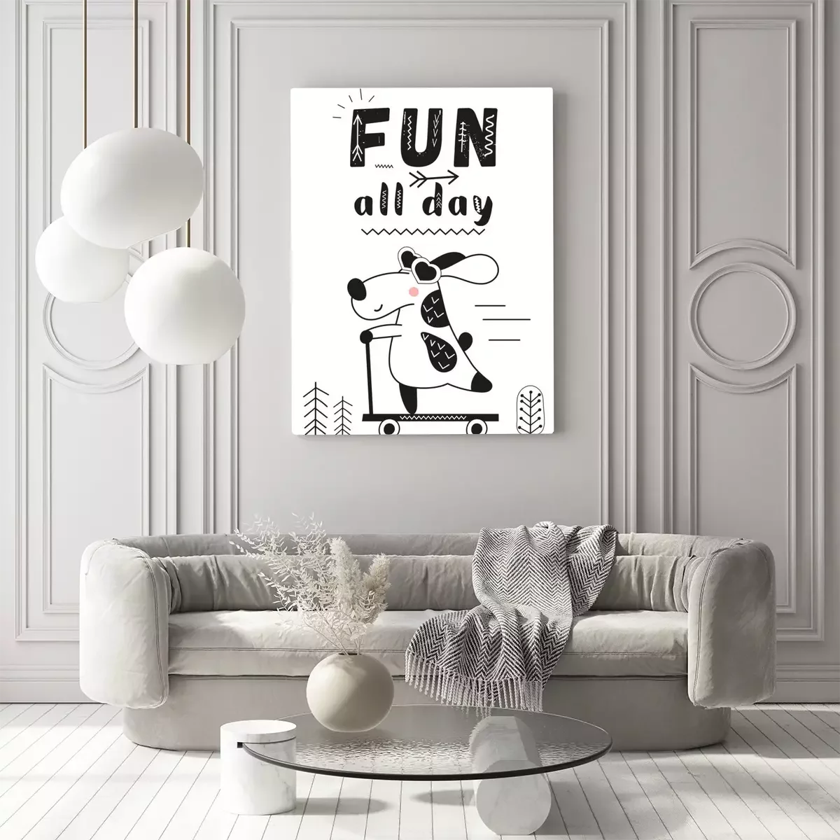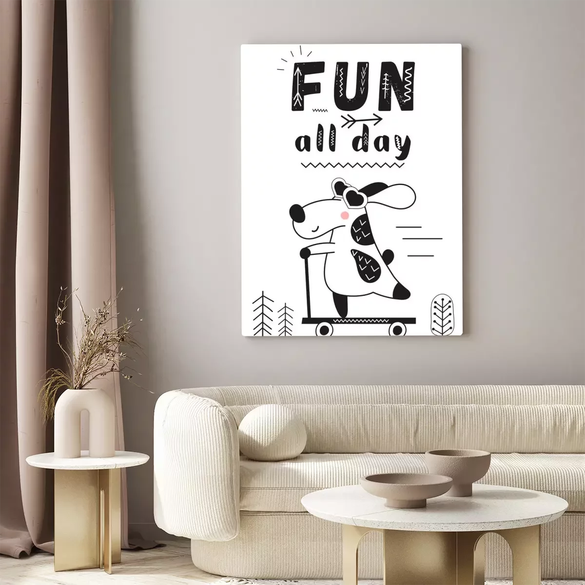 Canvas: Monochrome poster for nursery scandi design with cute dog on scooter in Scandinavian style. Vector Illustration. Kids illustration for baby clothes, greeting card, wrapper. Fun all day.