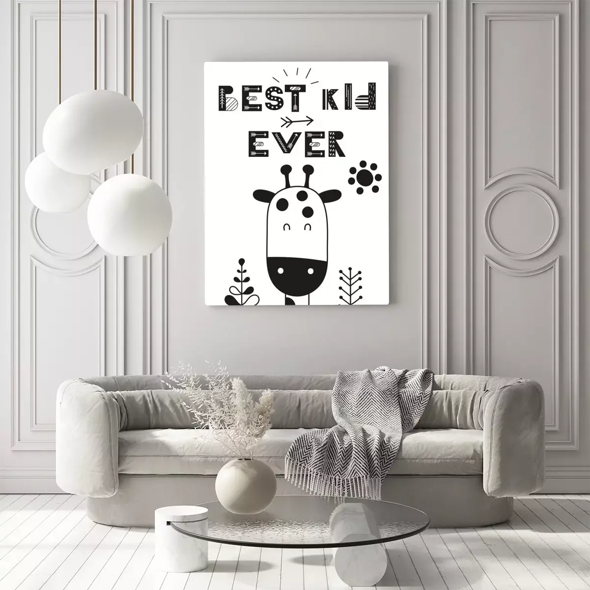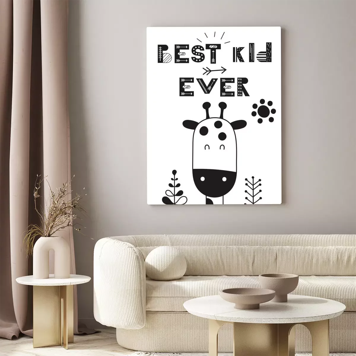 Canvas: Monochrome poster for nursery scandi design with cute giraffe in Scandinavian style. Vector Illustration. Kids illustration for baby clothes, greeting card, wrapping paper. Best kid ever.