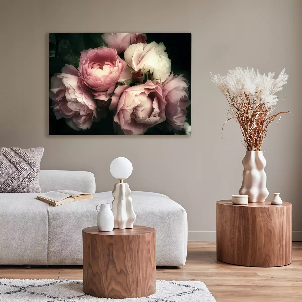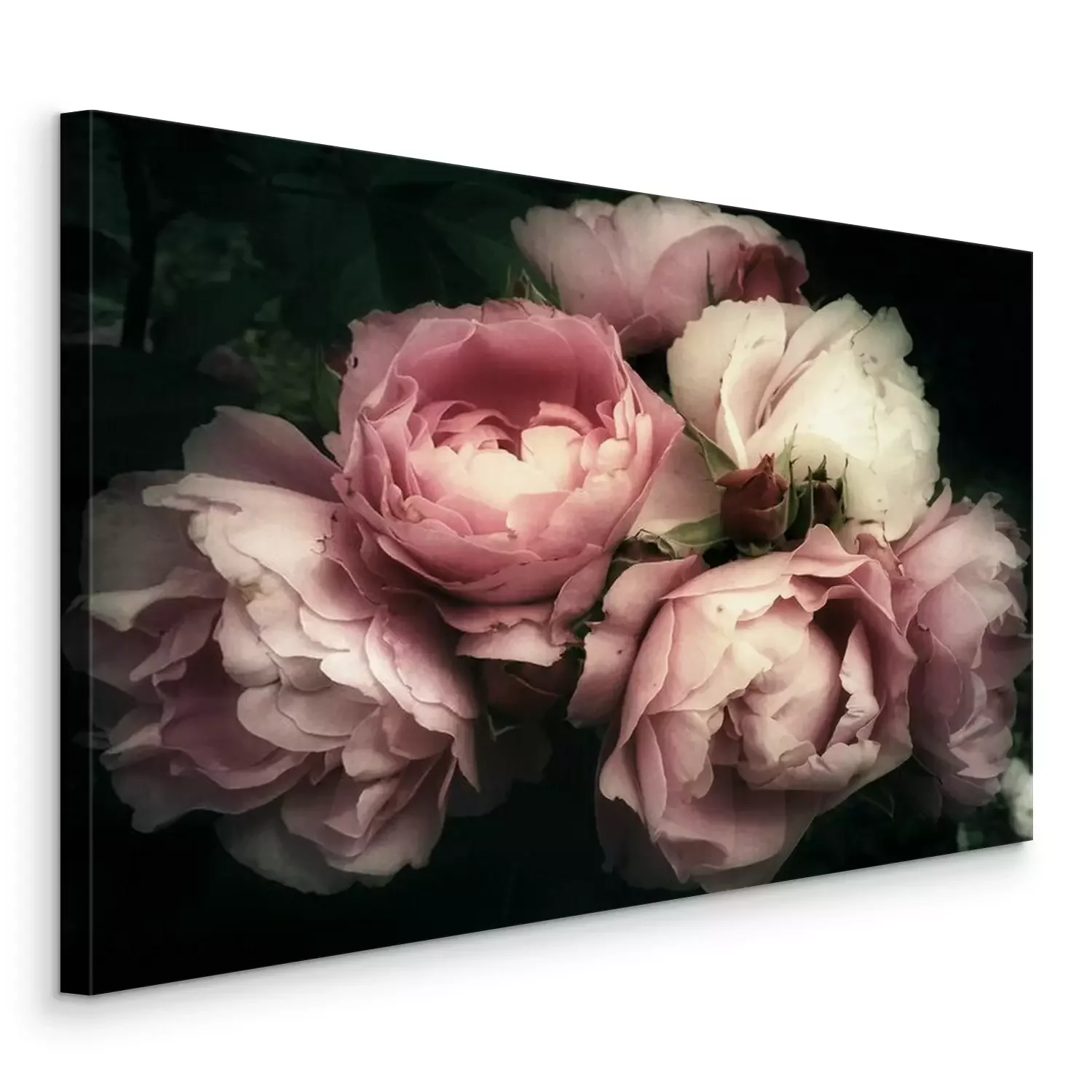 Canvas: Mooi boeket roze rozen, bloemen op een donkere achtergrond, zacht en romantisch vintage filter, lijkt op een oud schilderij