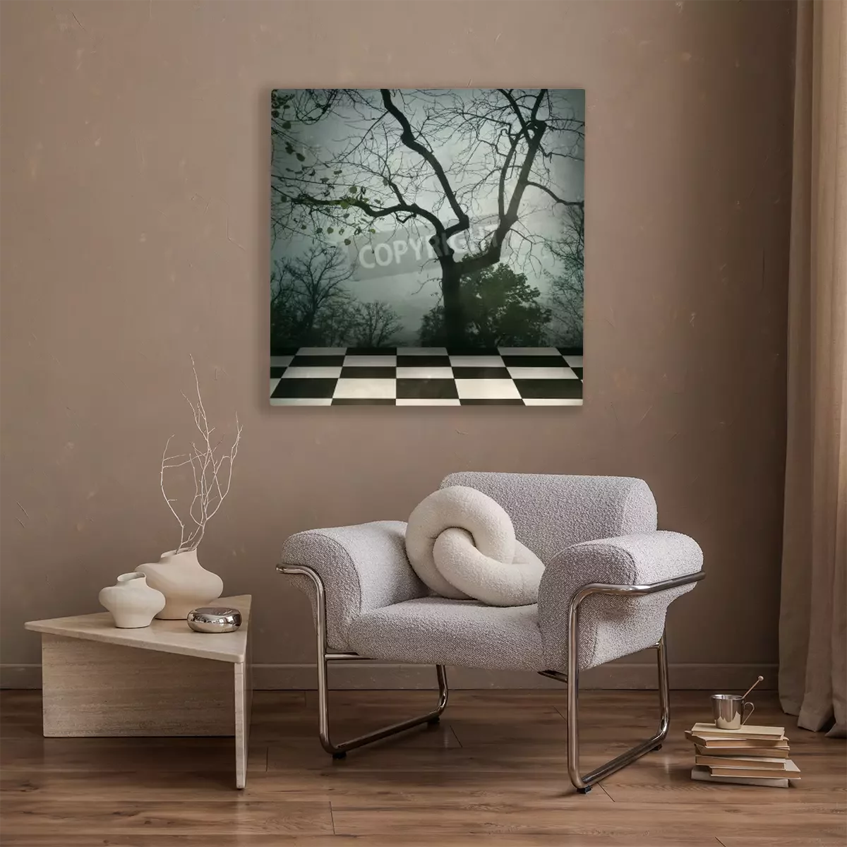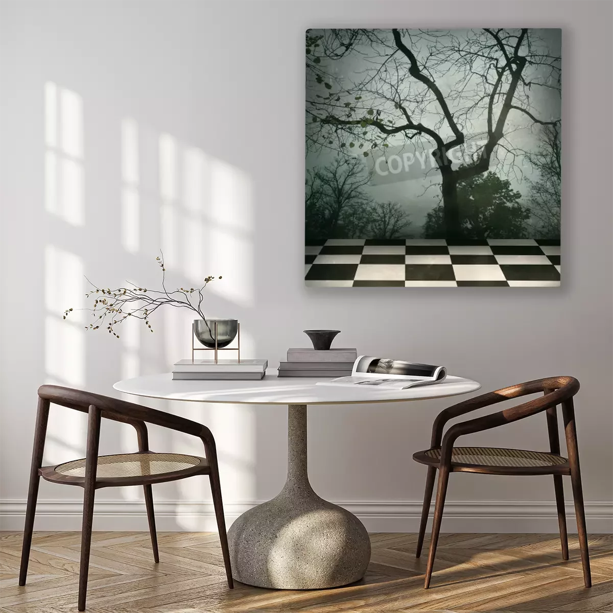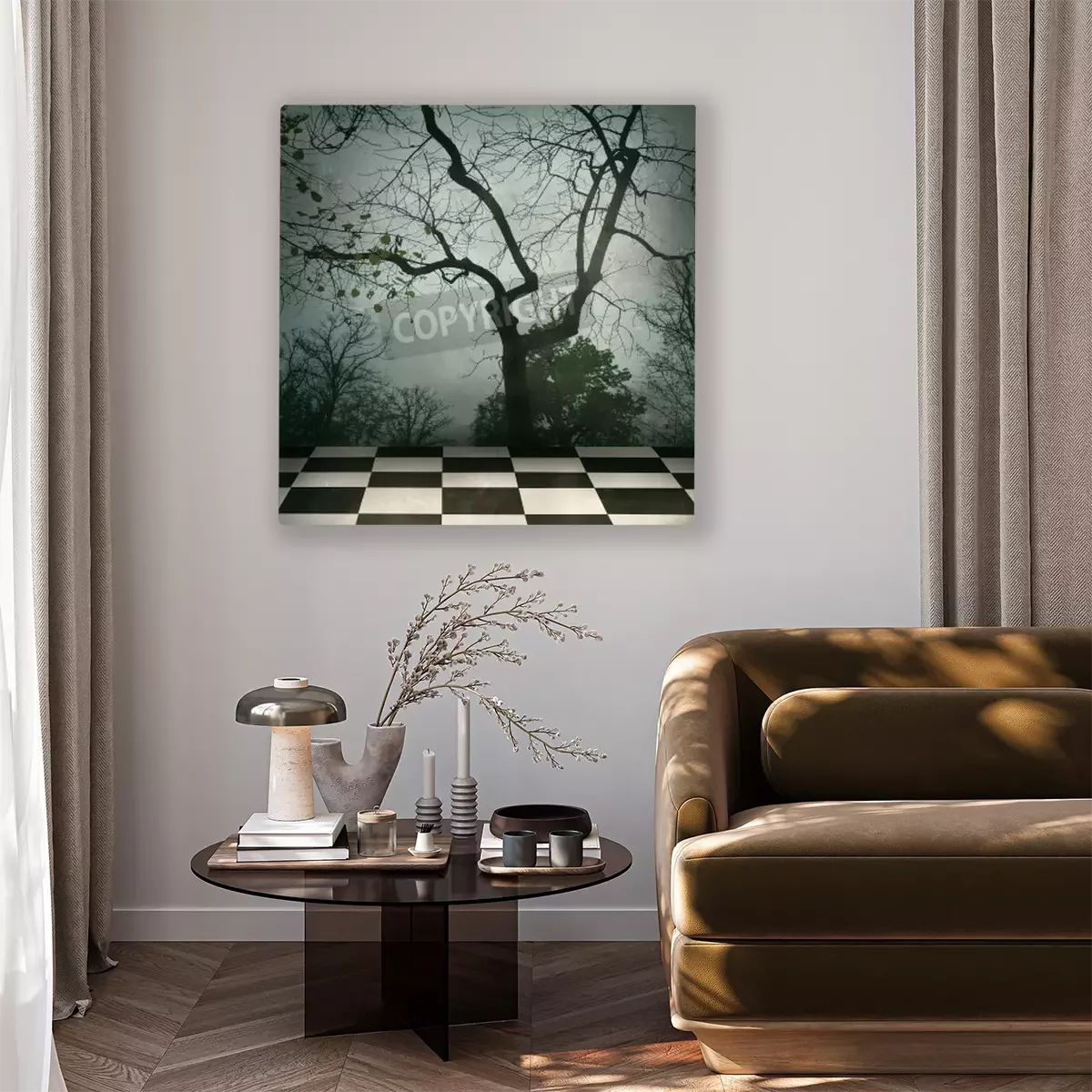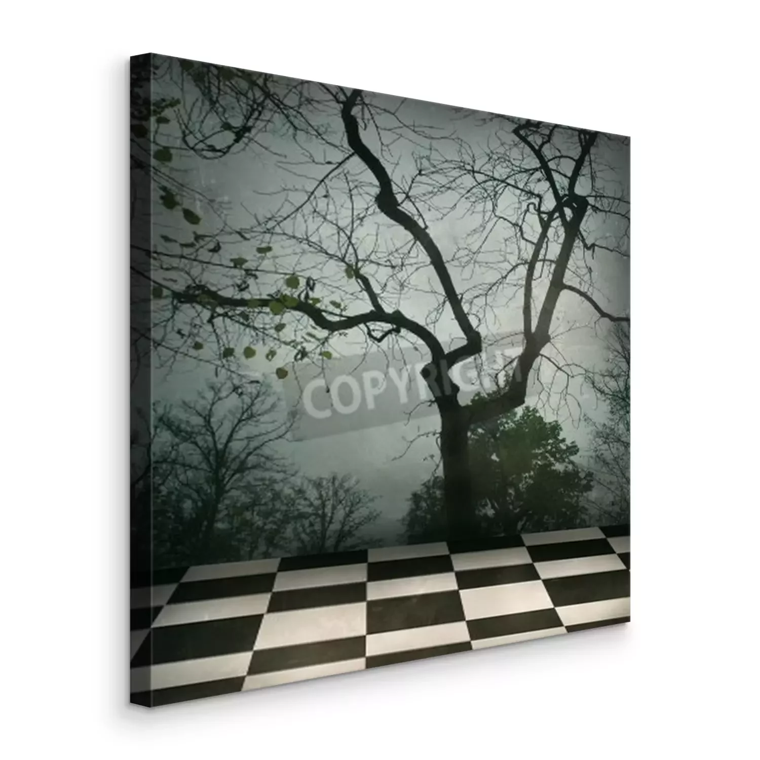 Canvas: Mooie surrealistische achtergrond van bomen en wit geblokte vloer in zwart en een grungy stijl