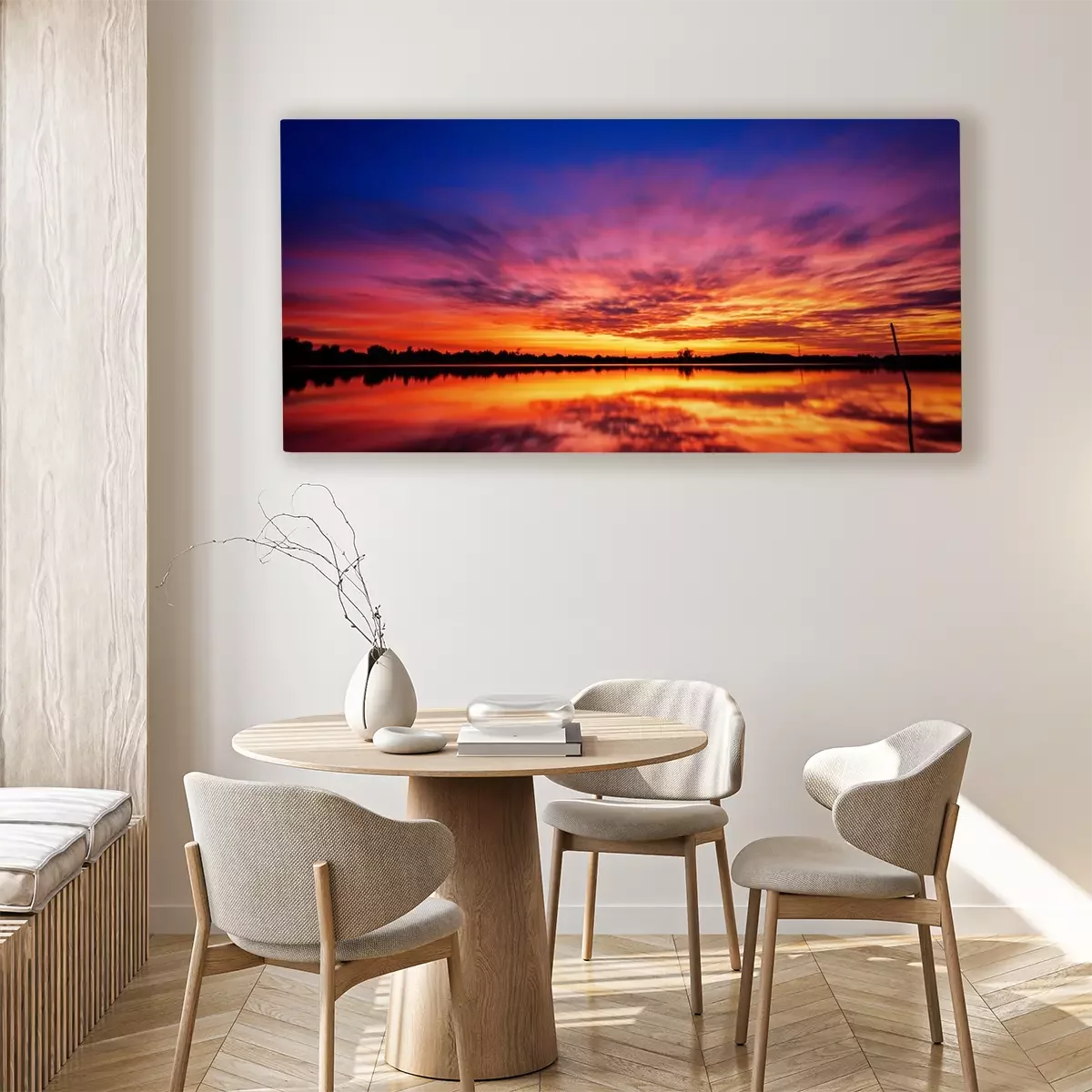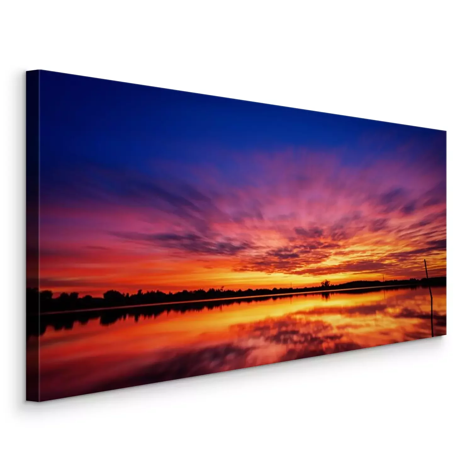 Canvas Mooie zonsonderganghemel met gouden dramatisch licht over berg en riviermening.