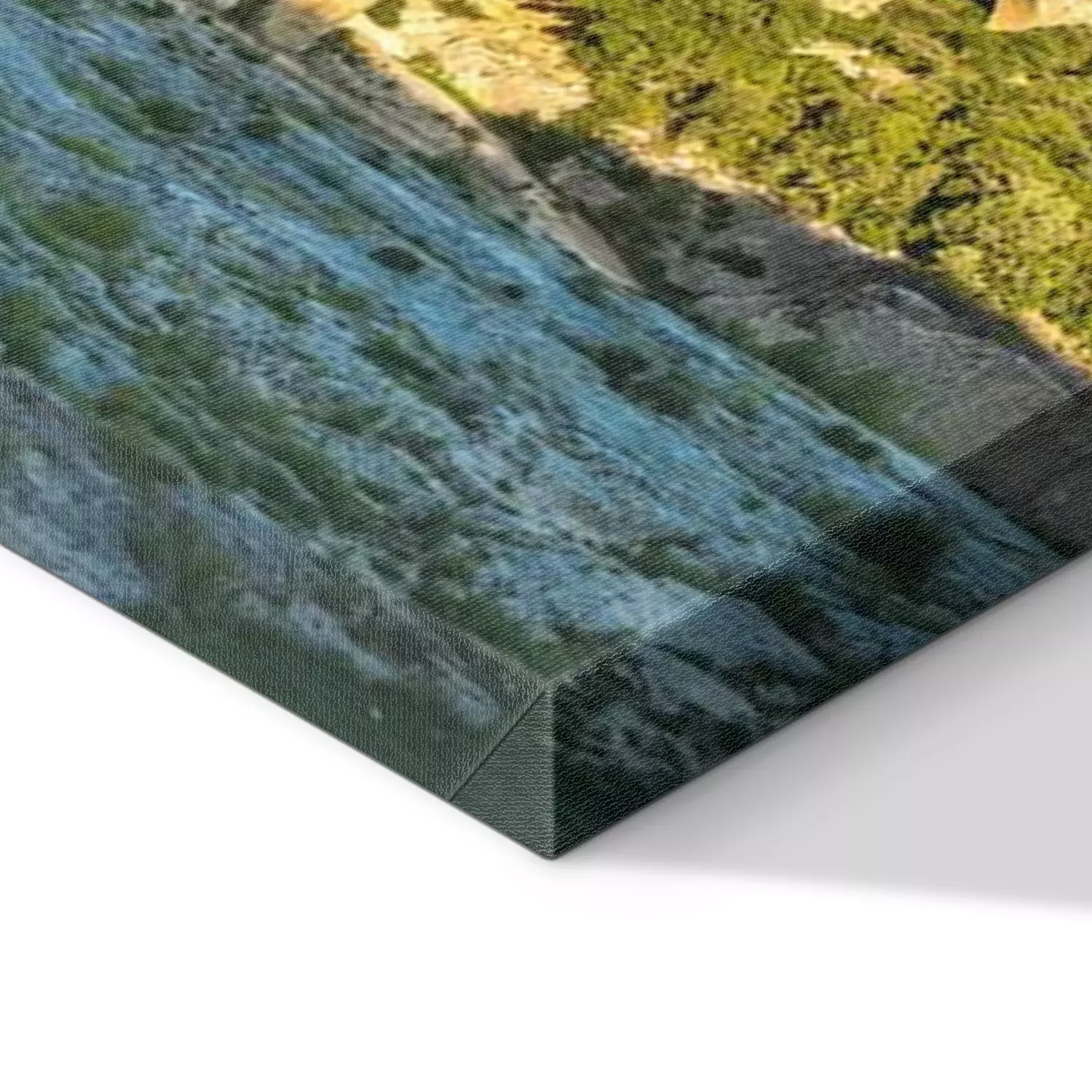 De print wordt aangebracht op hoogwaardig canvas dat op een schildersweefgetouw (spieraam) wordt gespannen. Omdat de print de zijranden bedekt, hoeft het ontwerp niet met een extra kader te worden omlijst. Wij raden ook composities aan die uit meerdere foto's bestaan en zo een coherente compositie vormen.
