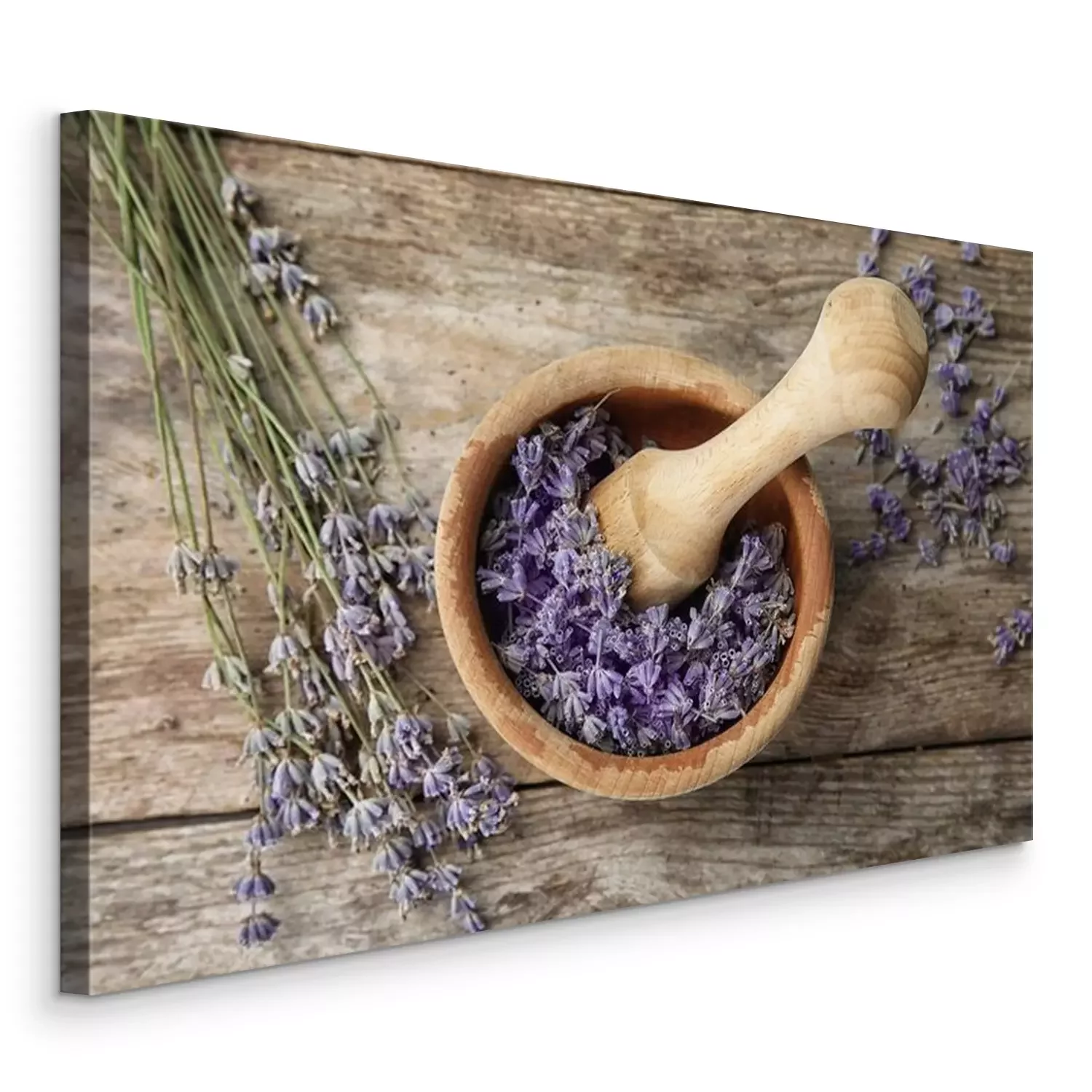 Canvas: Mortar with lavender flowers on table, top view. Ingredient for natural cosmetic