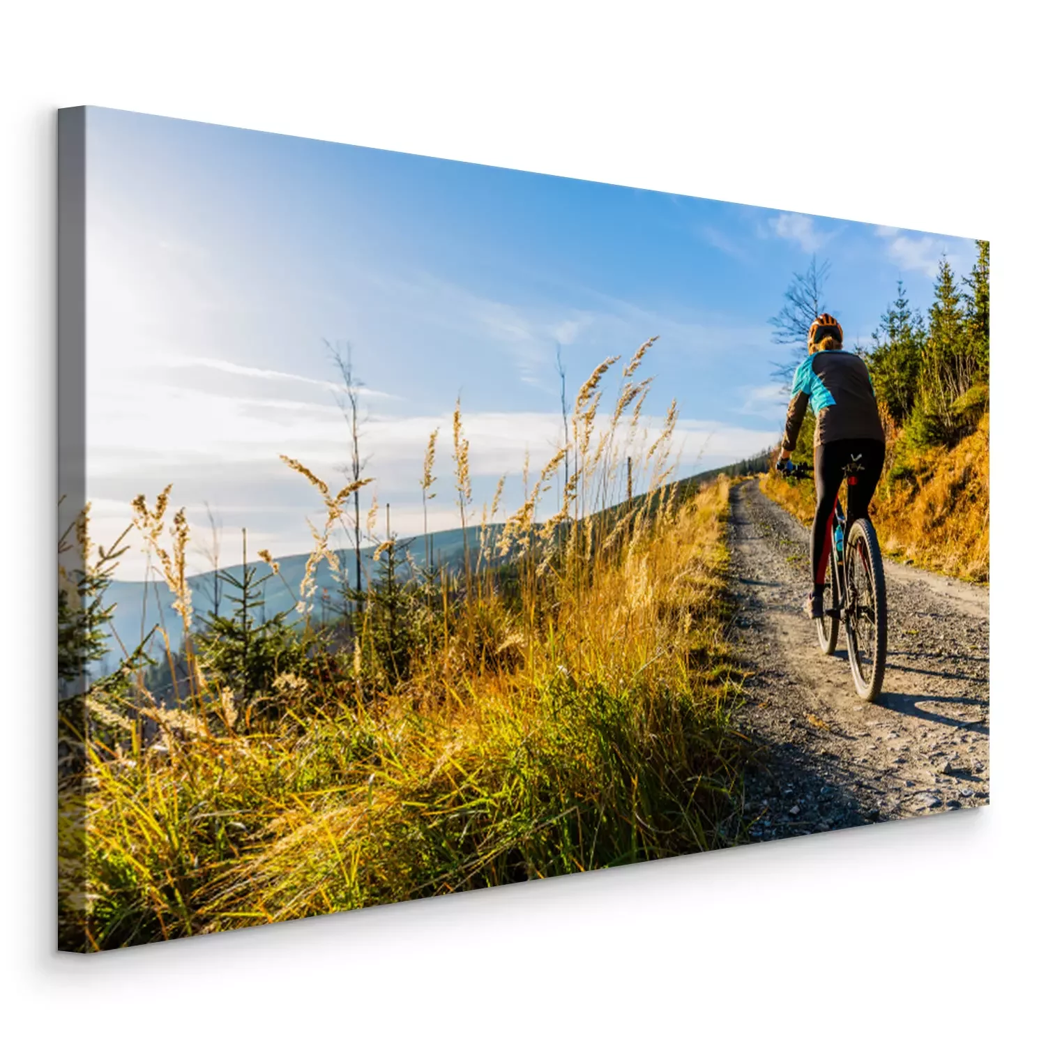 Canvas: Mountain biking woman riding on bike in summer mountains forest landscape. Woman cycling MTB flow trail track. Outdoor sport activity.