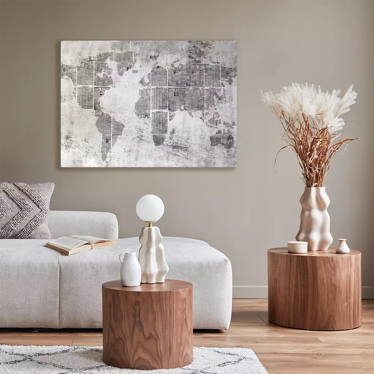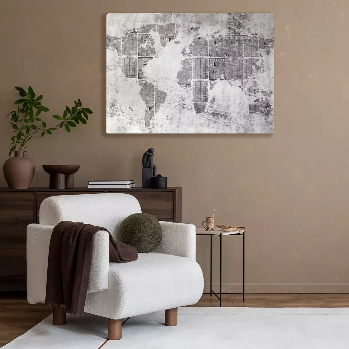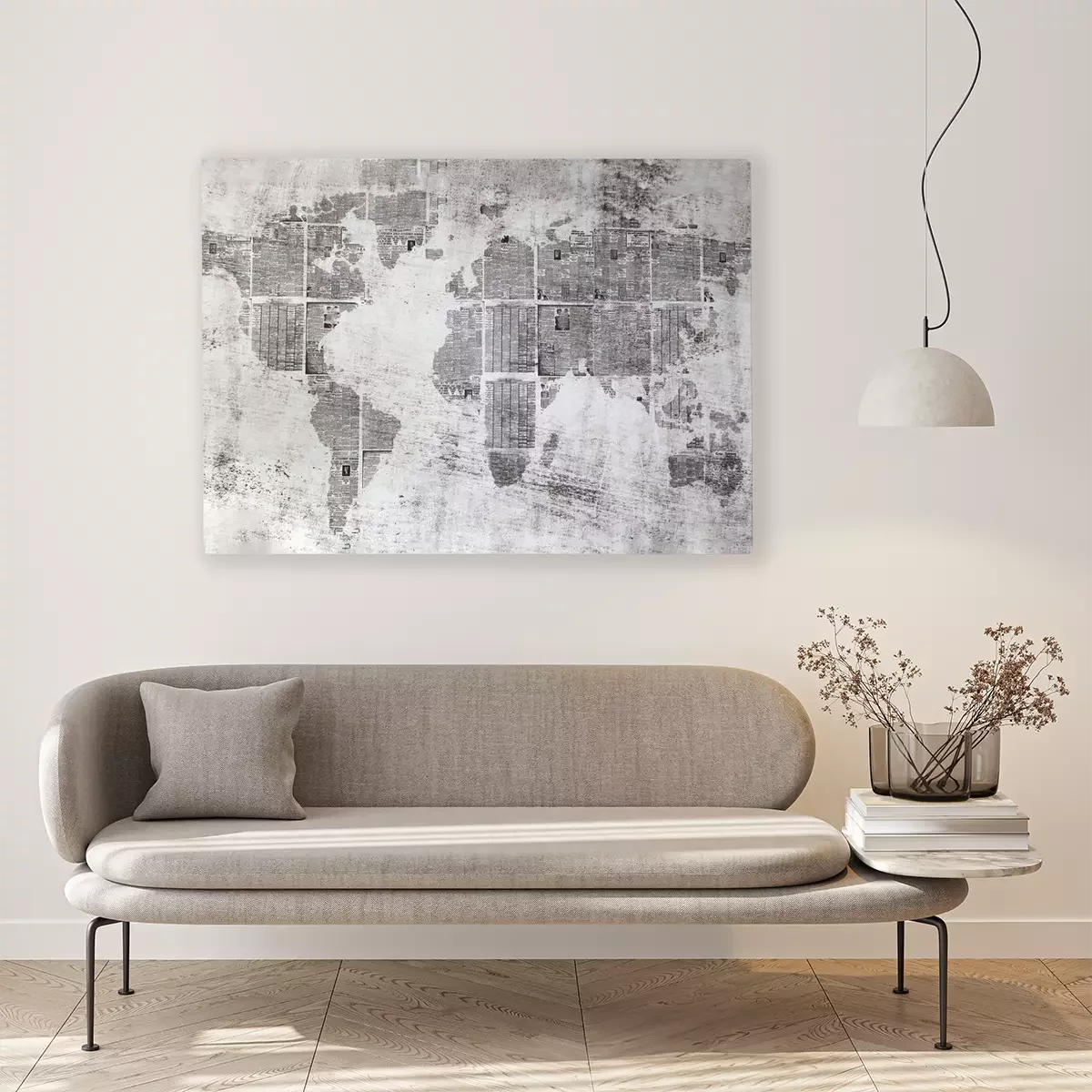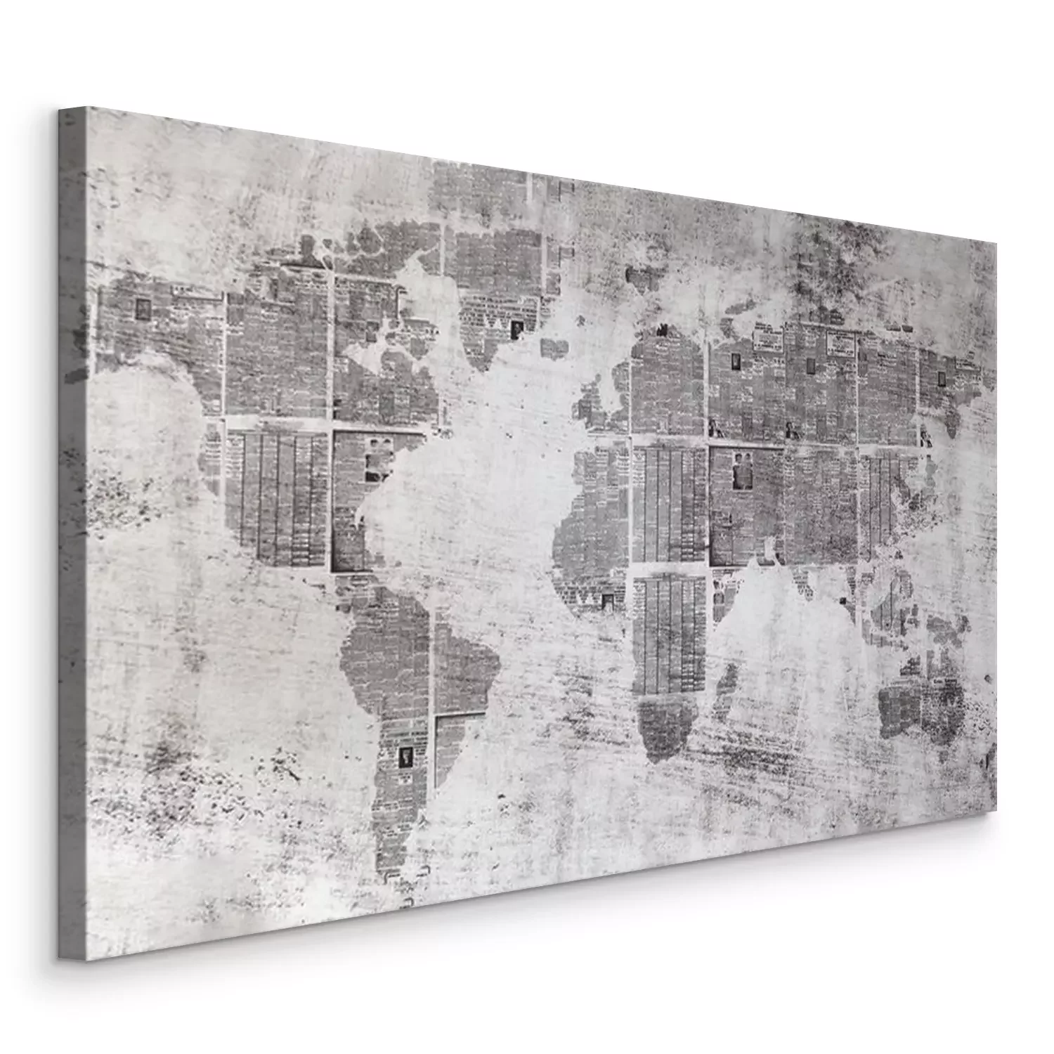 Canvas: Muro grigio con collage di fogli di Giornali een forma del mondo