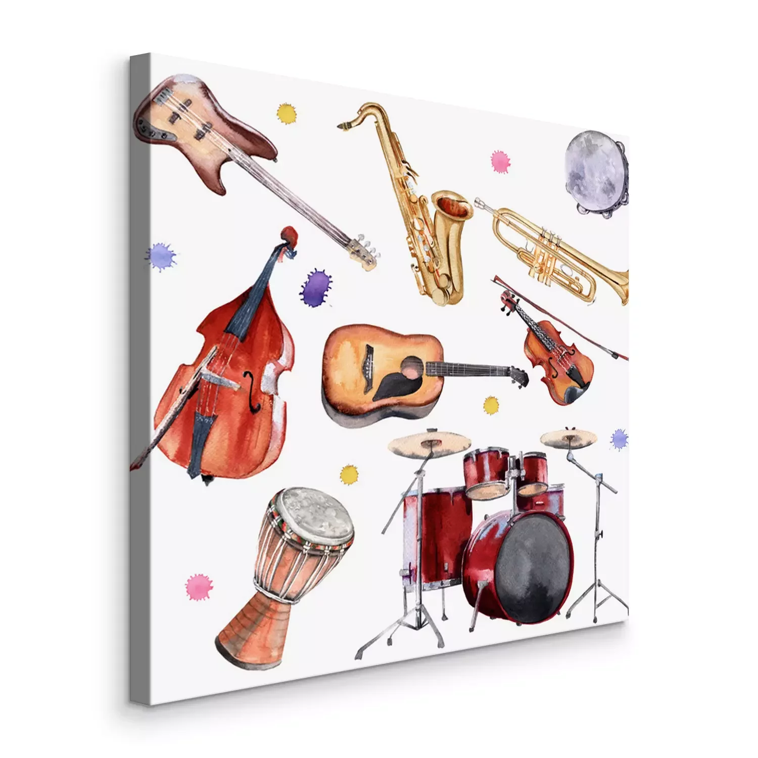 Canvas Muziekinstrumenten. Saxofoon, drums, contrabas, gitaren, viool en trompet.