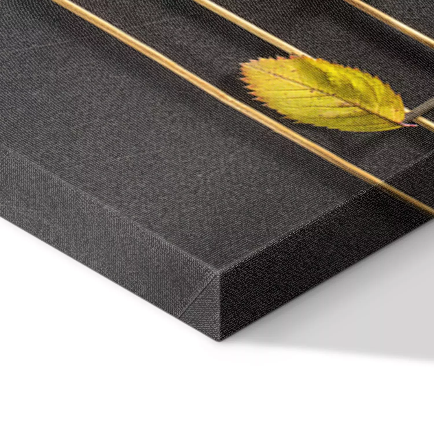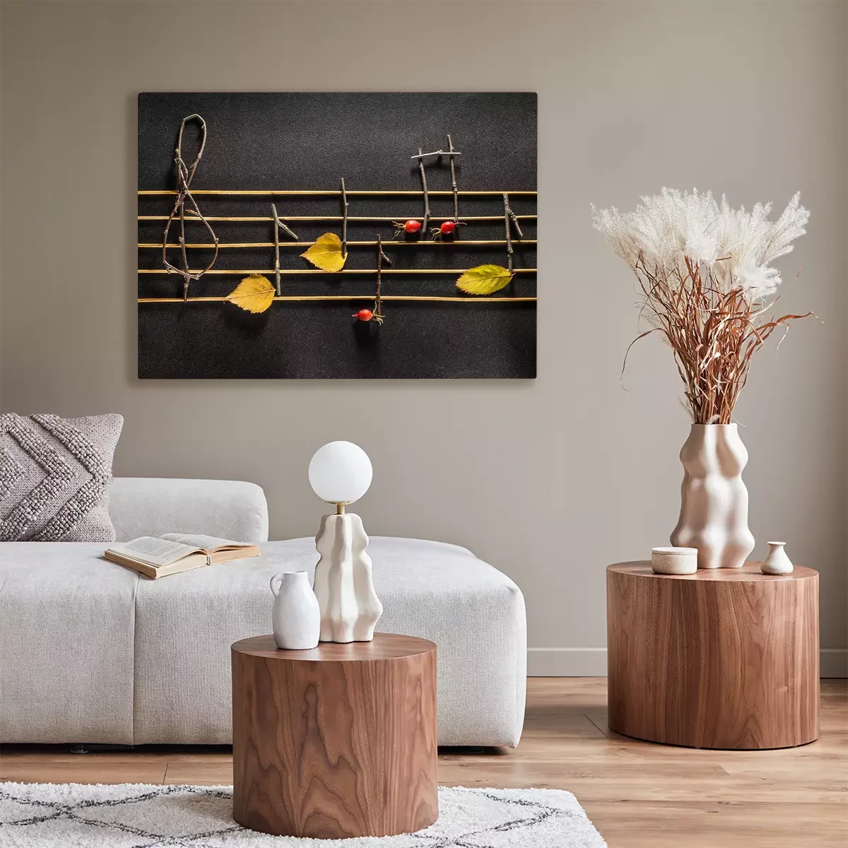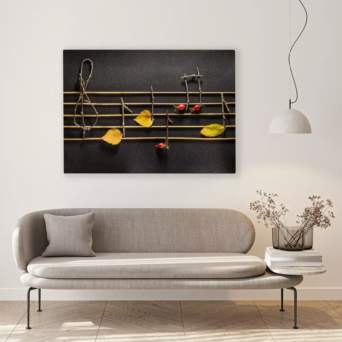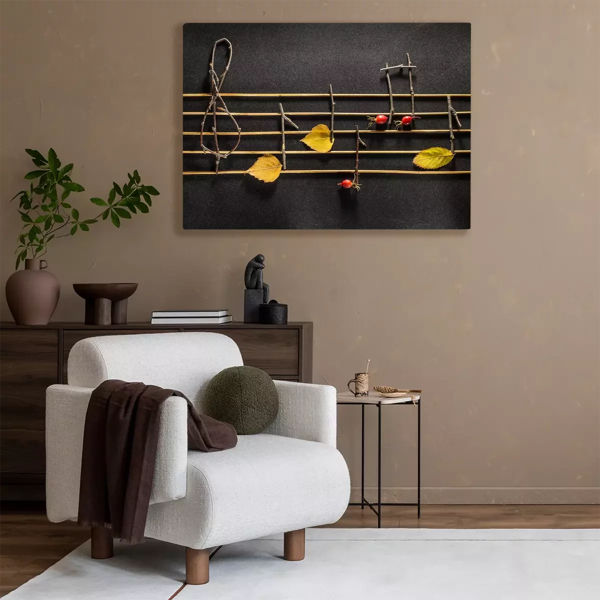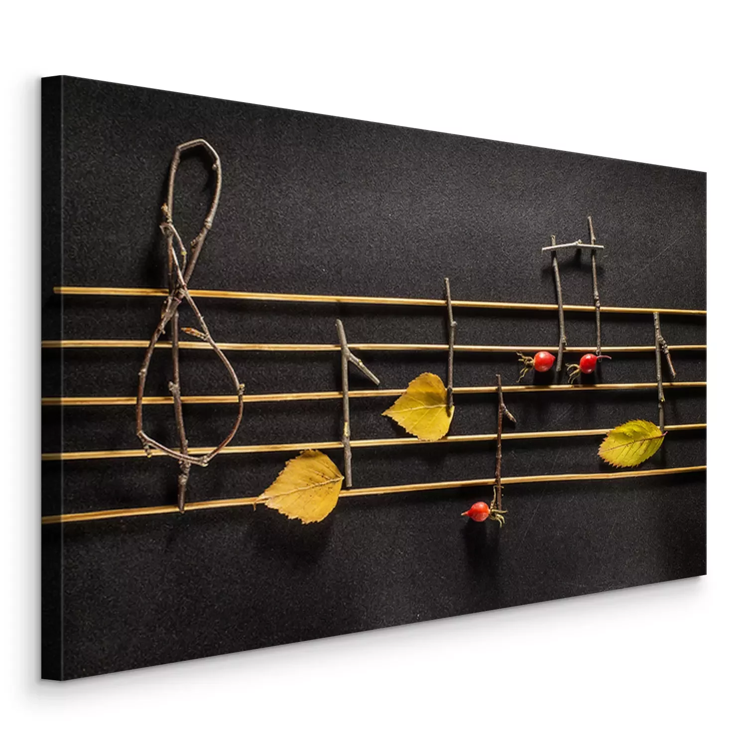Canvas: Muzieknotatie conceptie. Houten muzieknoten en bladeren.