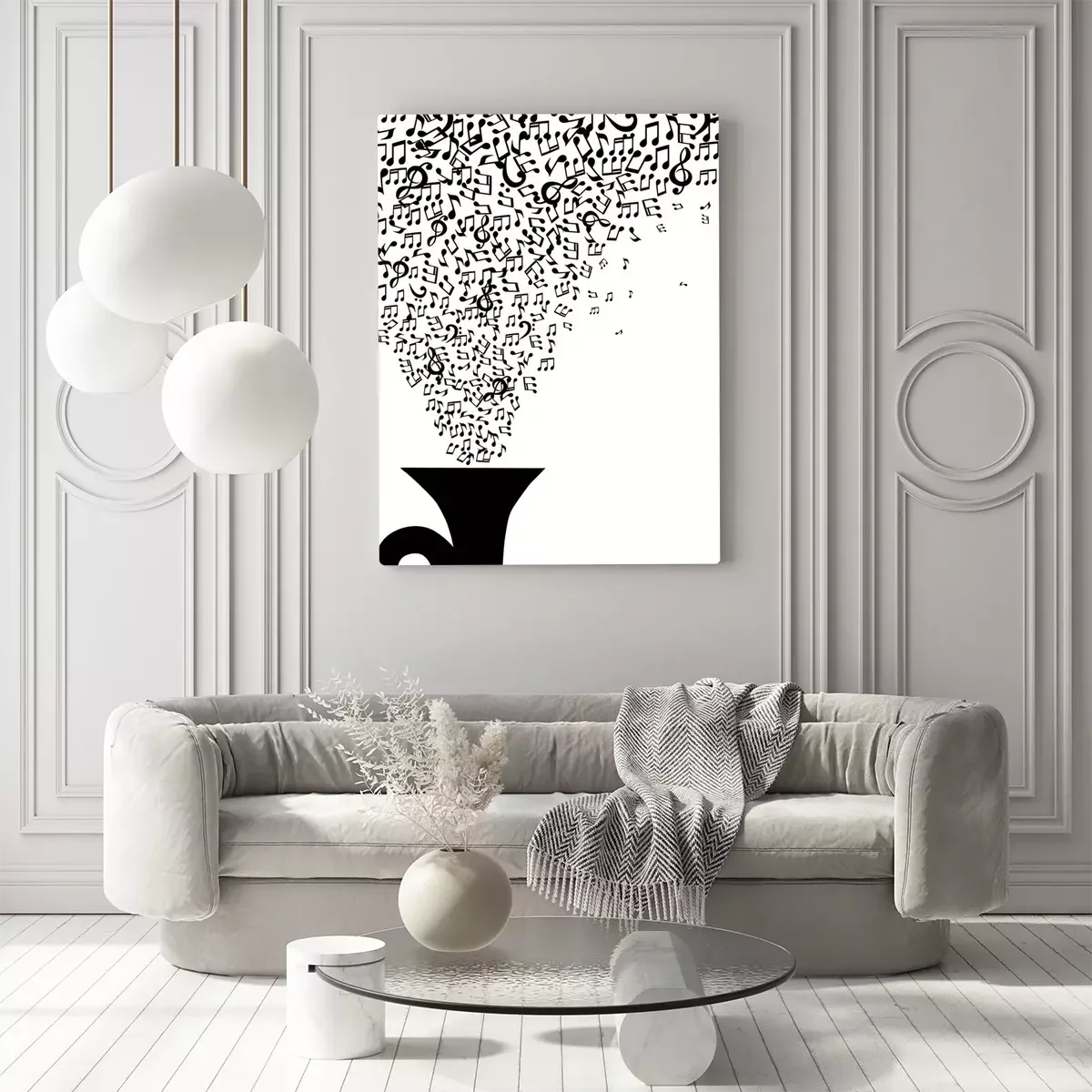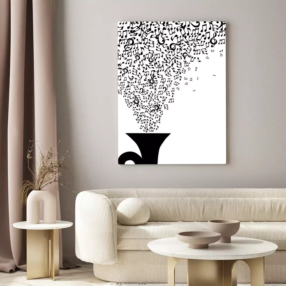 Canvas: Muzieknoten vliegen uit de pijp op een witte achtergrond