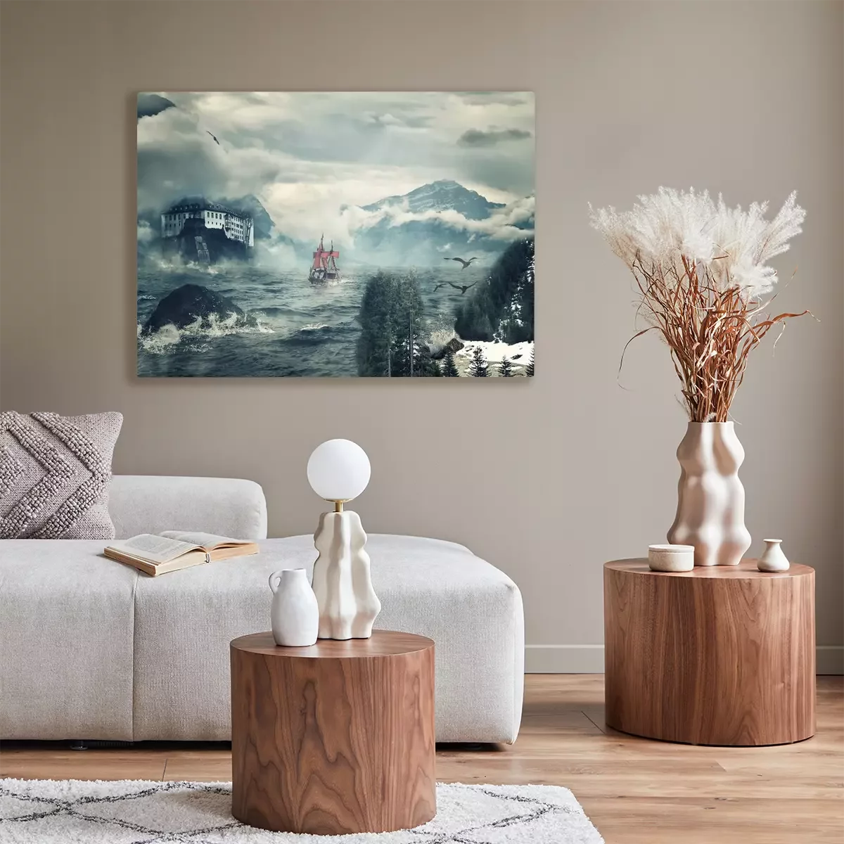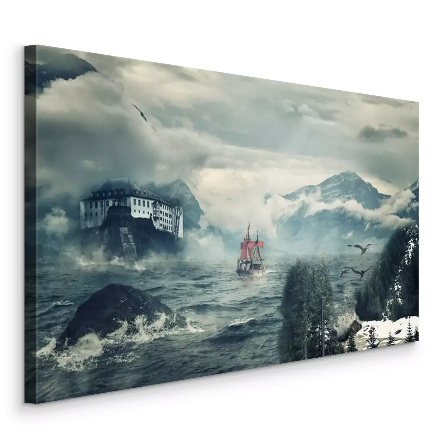 Canvas: Mystieke landschap met toppen van de bergen en de zee.