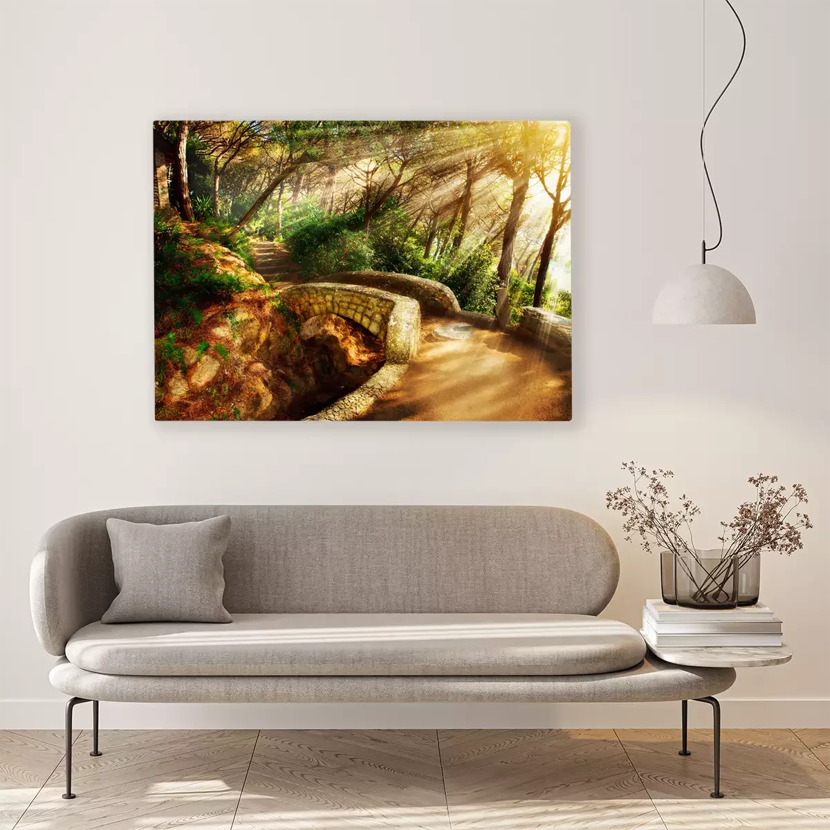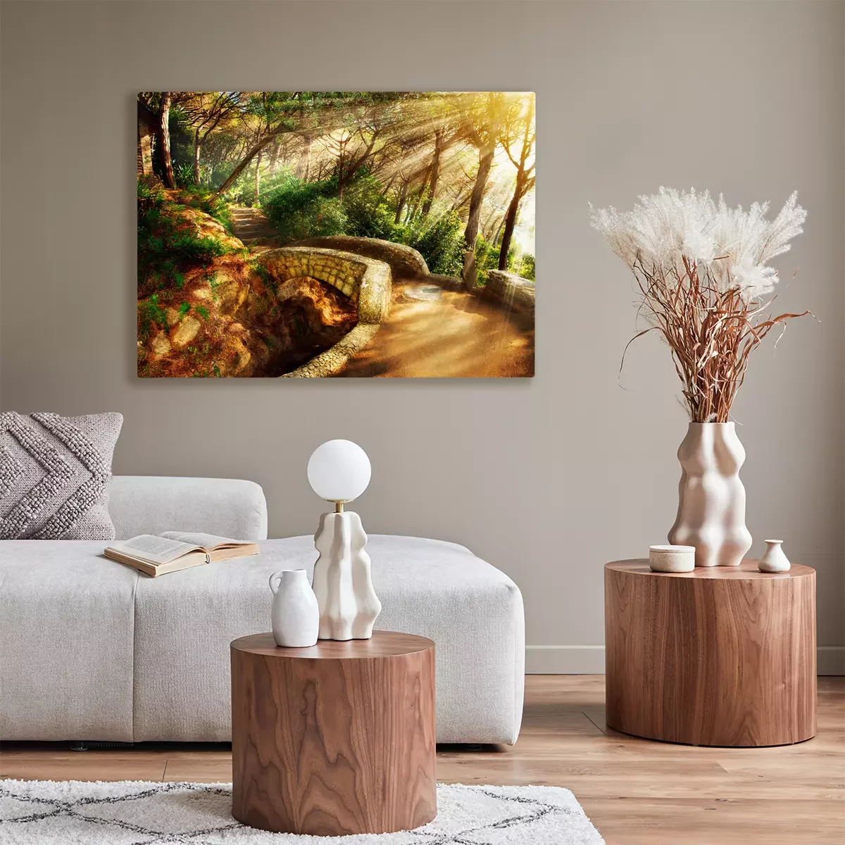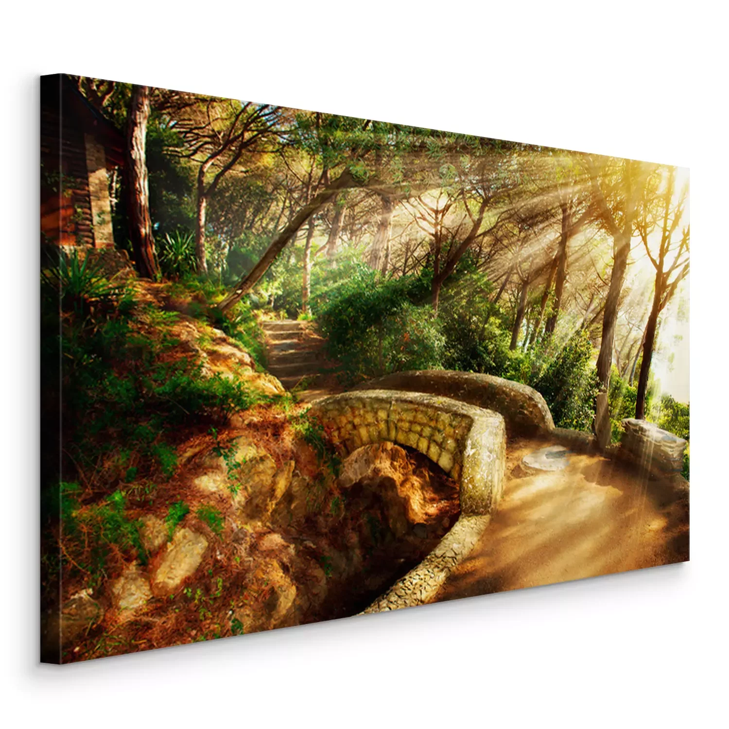 Canvas Mystieke Park. Oude bomen en oude stenen brug. Weg