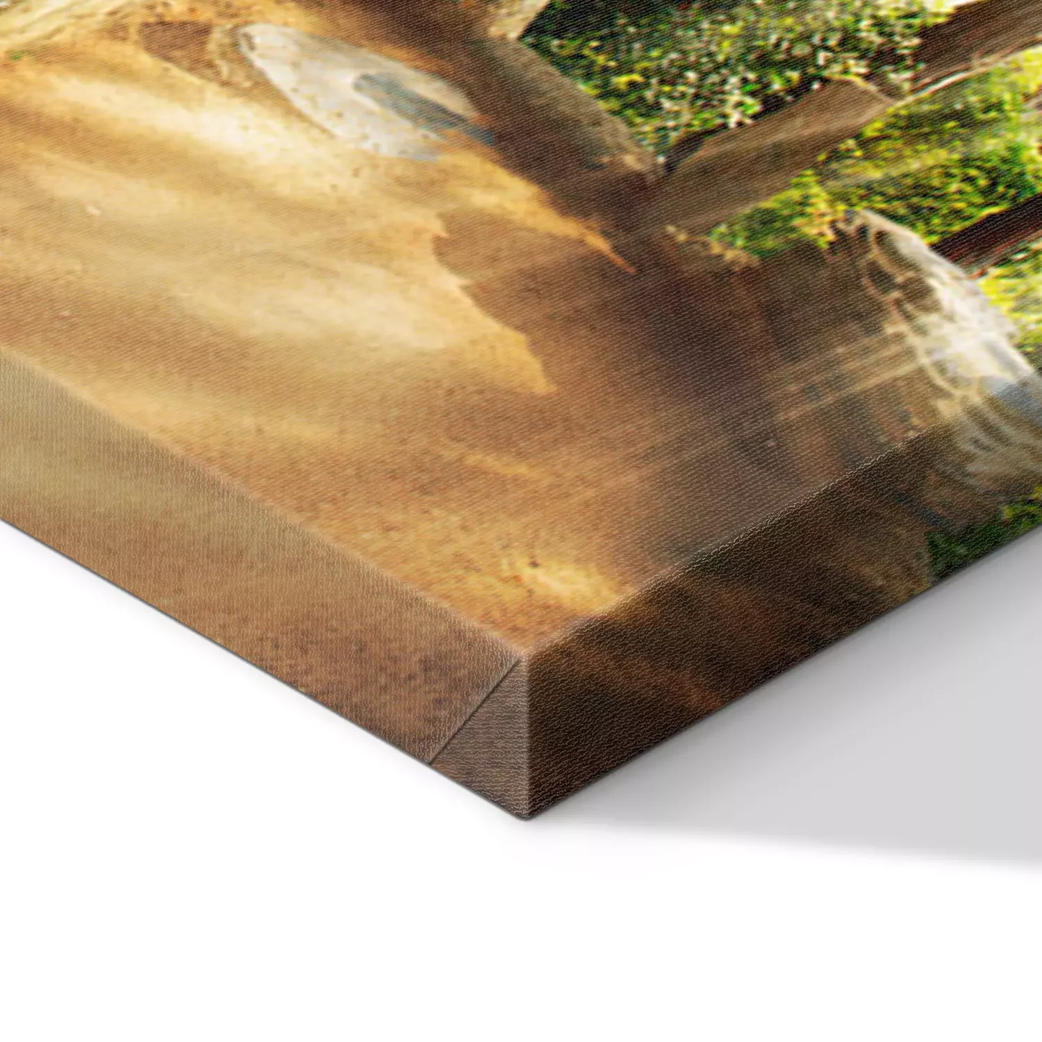 De print wordt aangebracht op hoogwaardig canvas dat op een schildersweefgetouw (spieraam) wordt gespannen. Omdat de print de zijranden bedekt, hoeft het ontwerp niet met een extra kader te worden omlijst. Wij raden ook composities aan die uit meerdere foto's bestaan en zo een coherente compositie vormen.