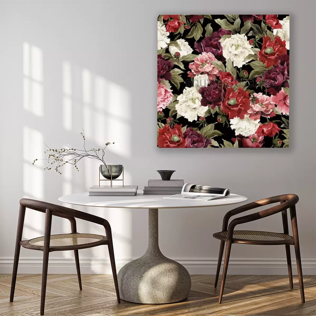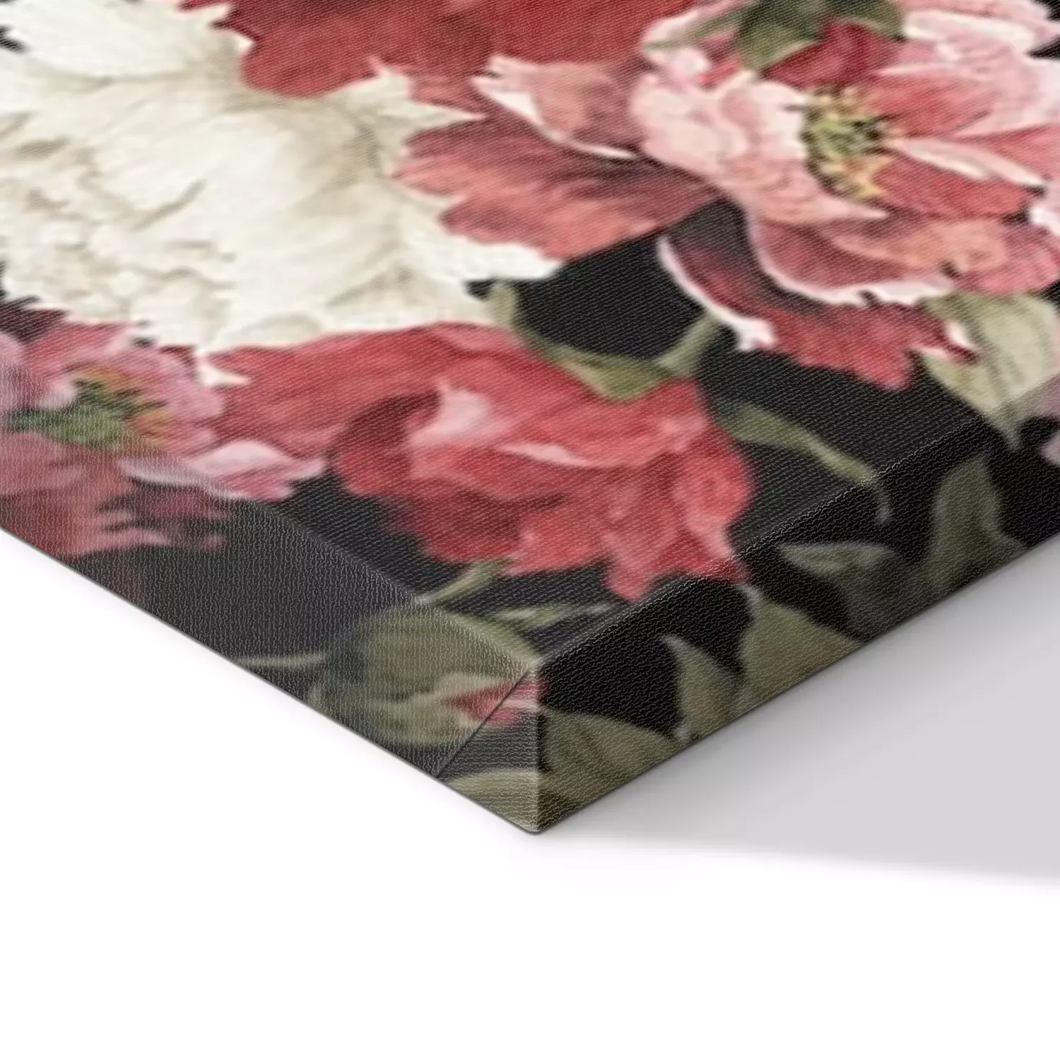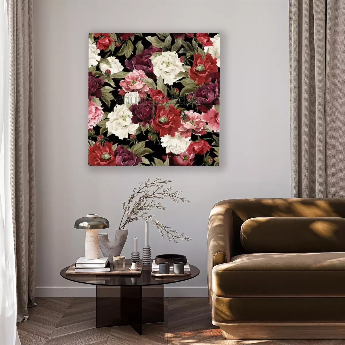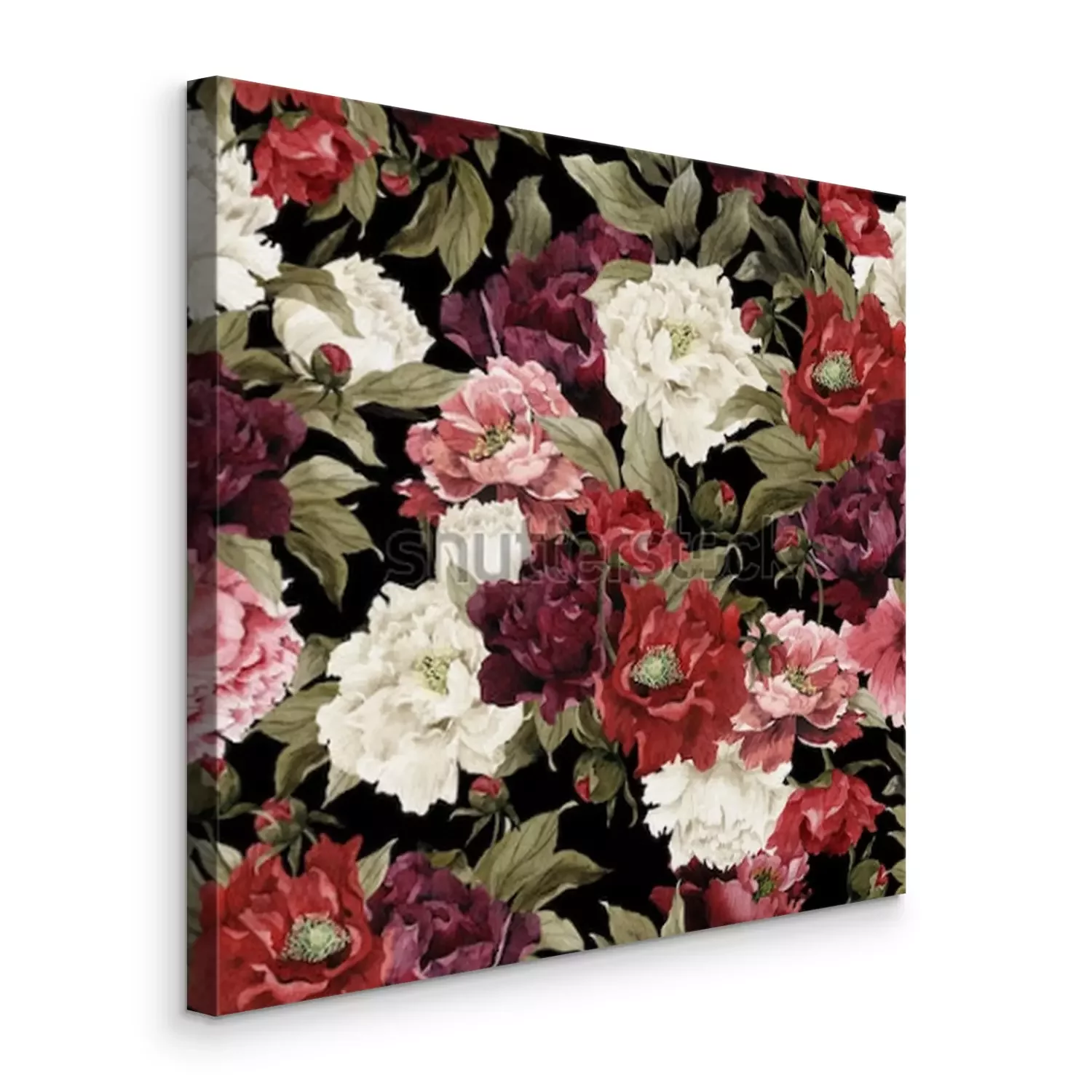 Canvas: Naadloos bloemenpatroon met rozen op zwarte achtergrond, waterverf.