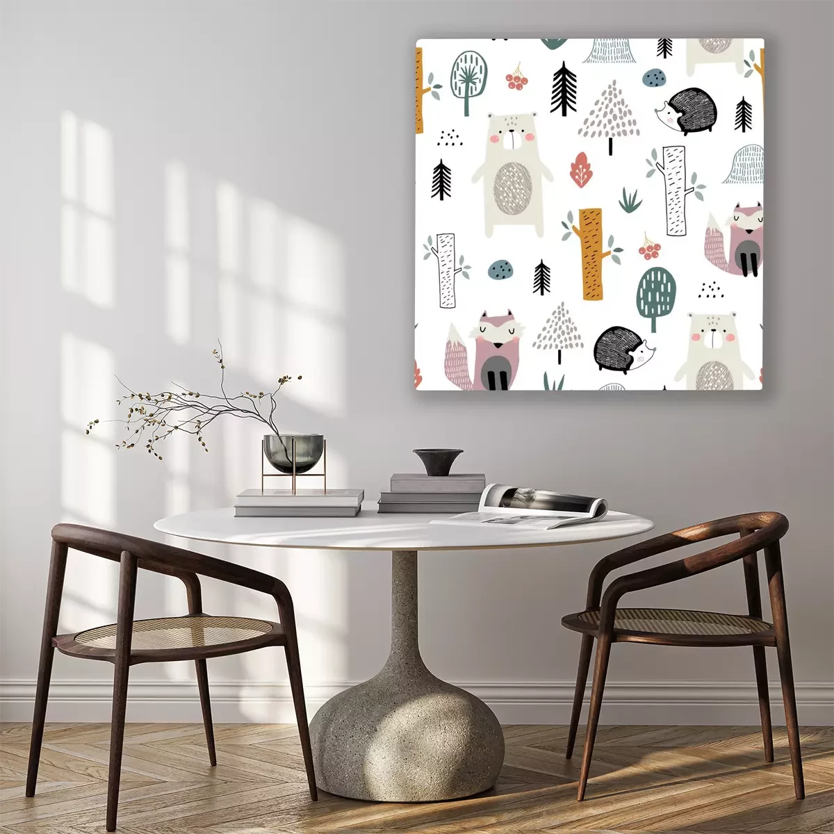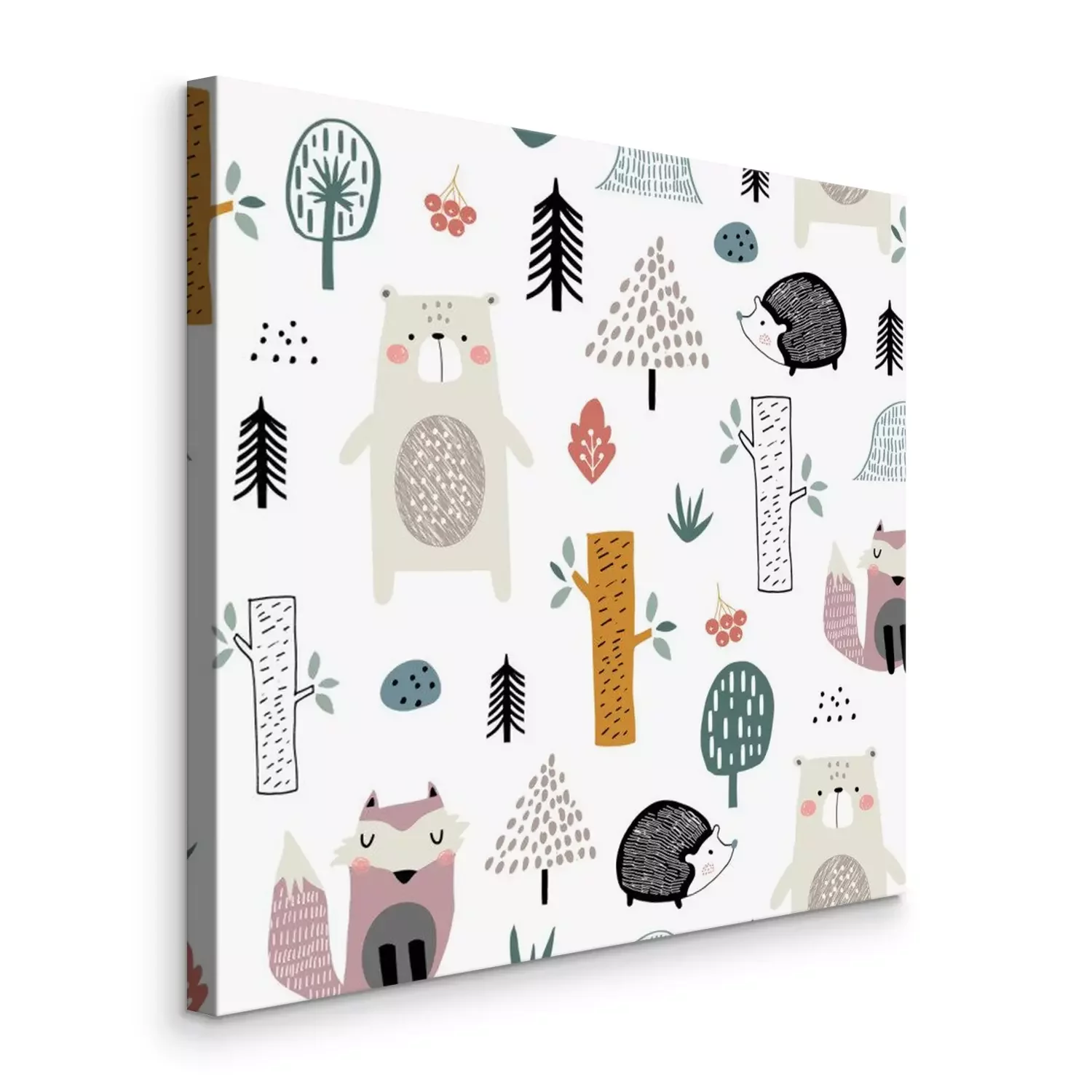 Canvas Naadloos kinderachtig patroon met leuke beer, vos, egels in het hout. Creatieve kinderen skandinavische stijl textuur voor stof, onmiddellijke verpakking, textiel, behang, kleding. Vector illustratie
