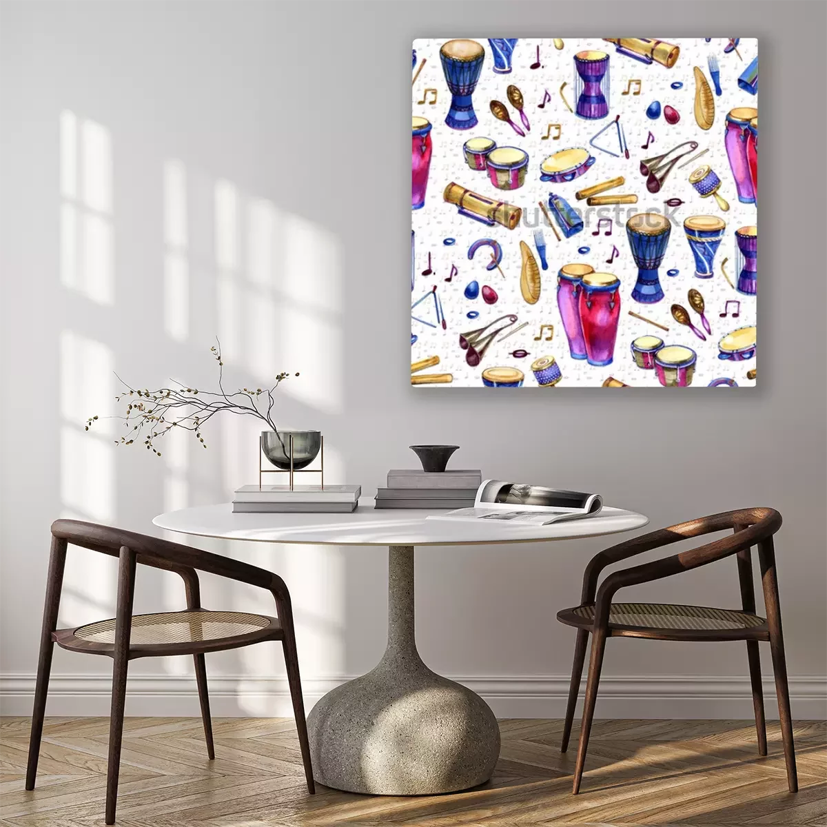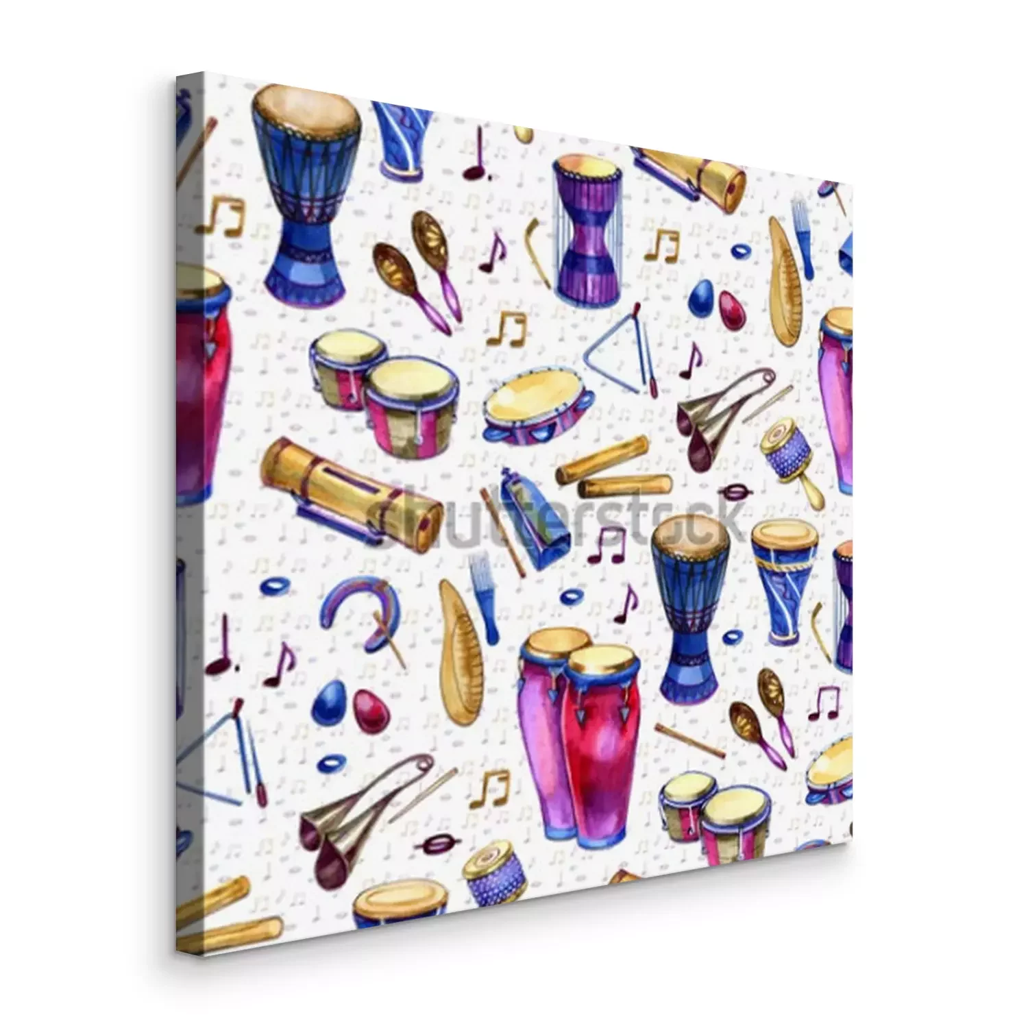 Canvas: Naadloos patroon met trommels in waterverfstijl op witte achtergrond. Percussie muziekinstrumenten. Kleurrijk ontwerp voor retro feest in Memphis-stijl. illustratie