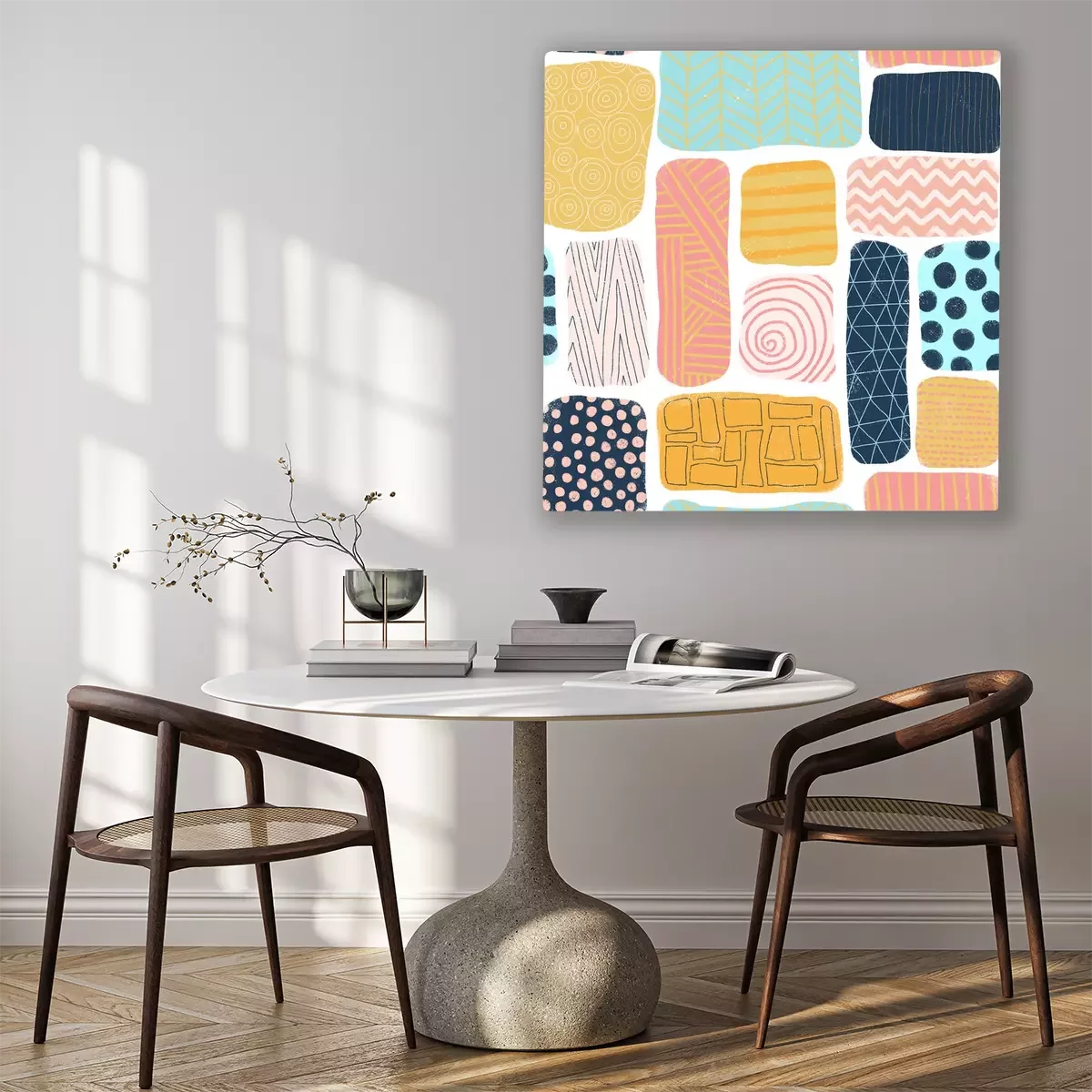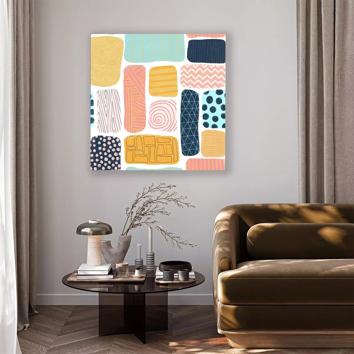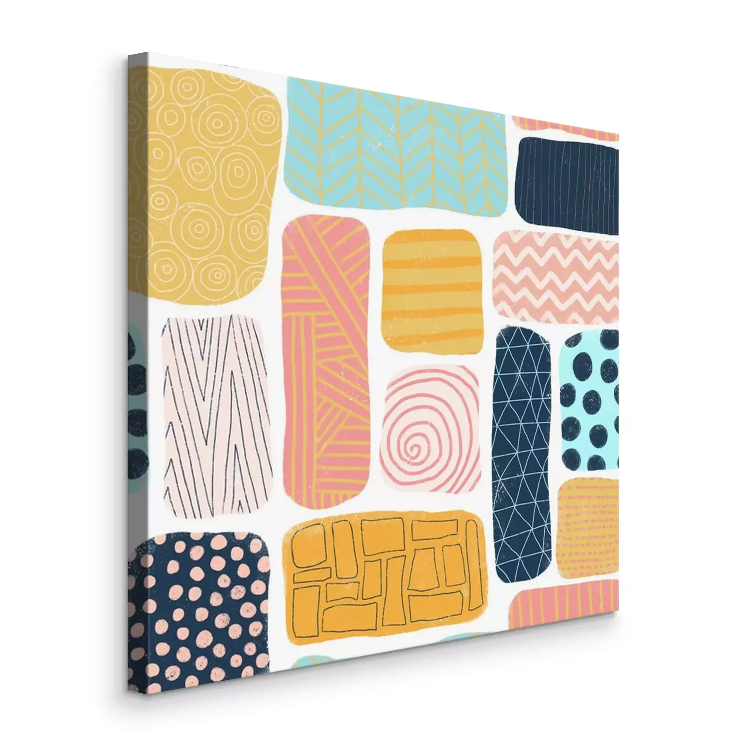 Canvas Naadloze patroon abstracte blokken. Vierkant en rechthoek doodle vormen met verschillende texturen. Mosaik puzzelstijl achtergrond blauw, goud, roze, koraal. Leuke vrouwelijke kleurrijke hand getrokke