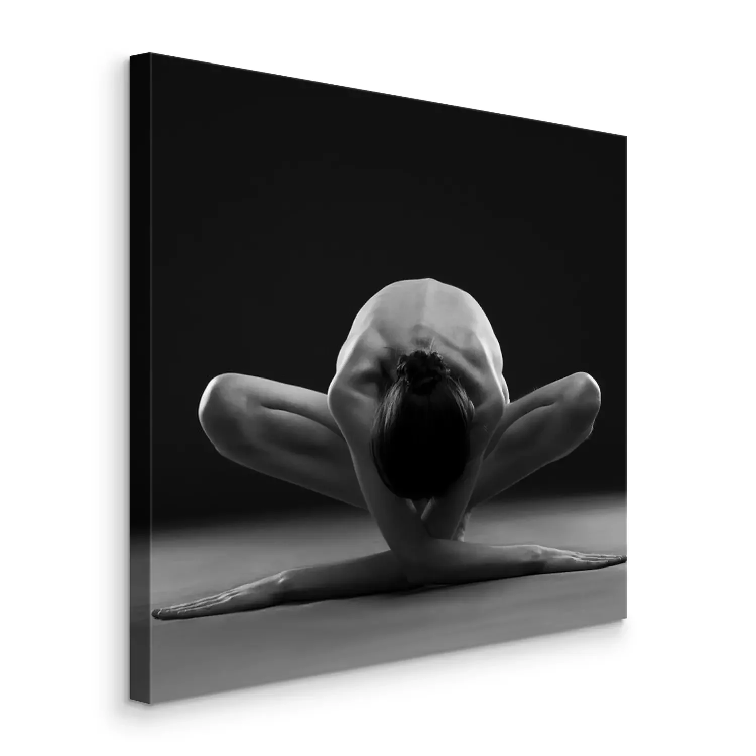 Canvas: Naakt yoga. Mooie sexy lichaam van de jonge vrouw op zwarte achtergrond