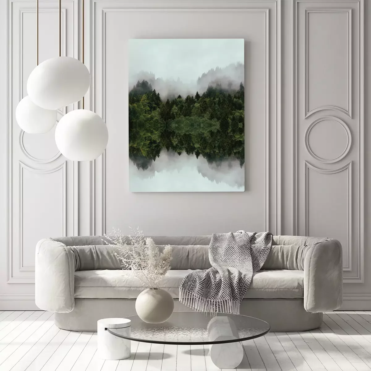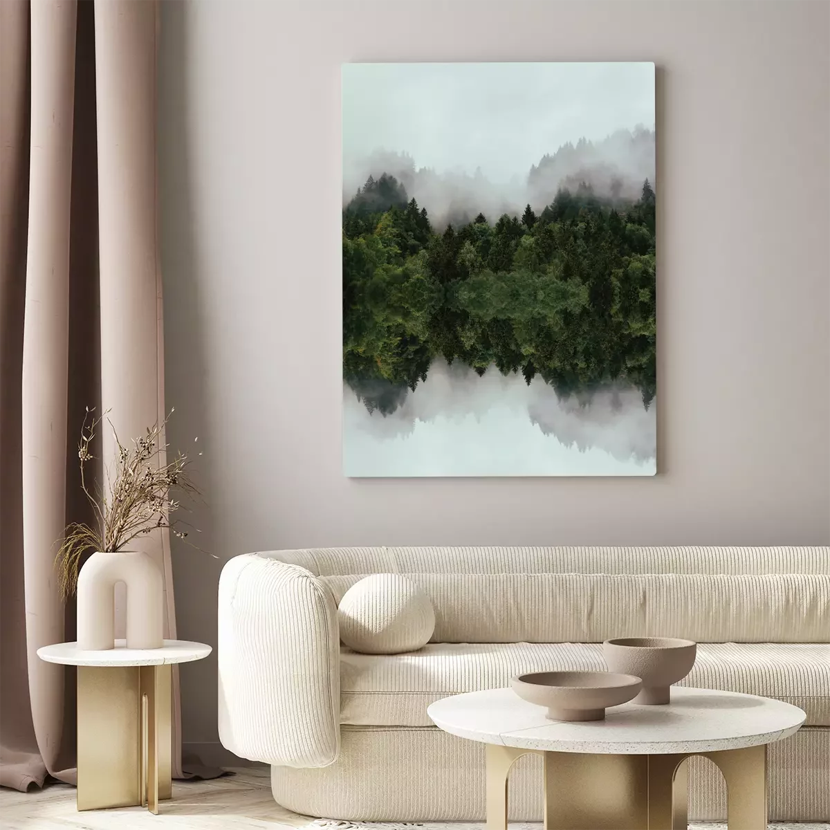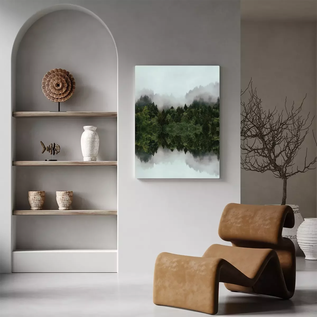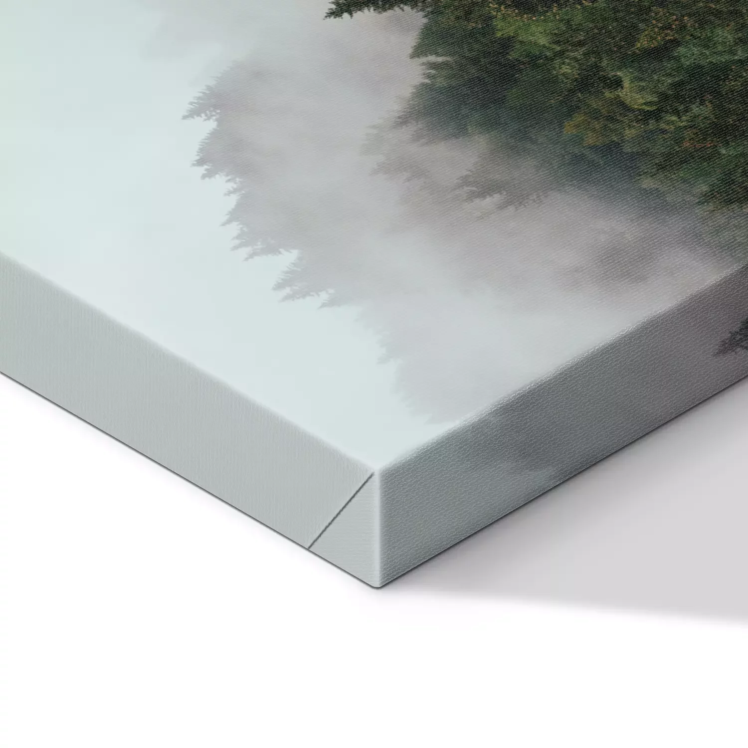 Naaldbos in de mist met een spiegelreflectie