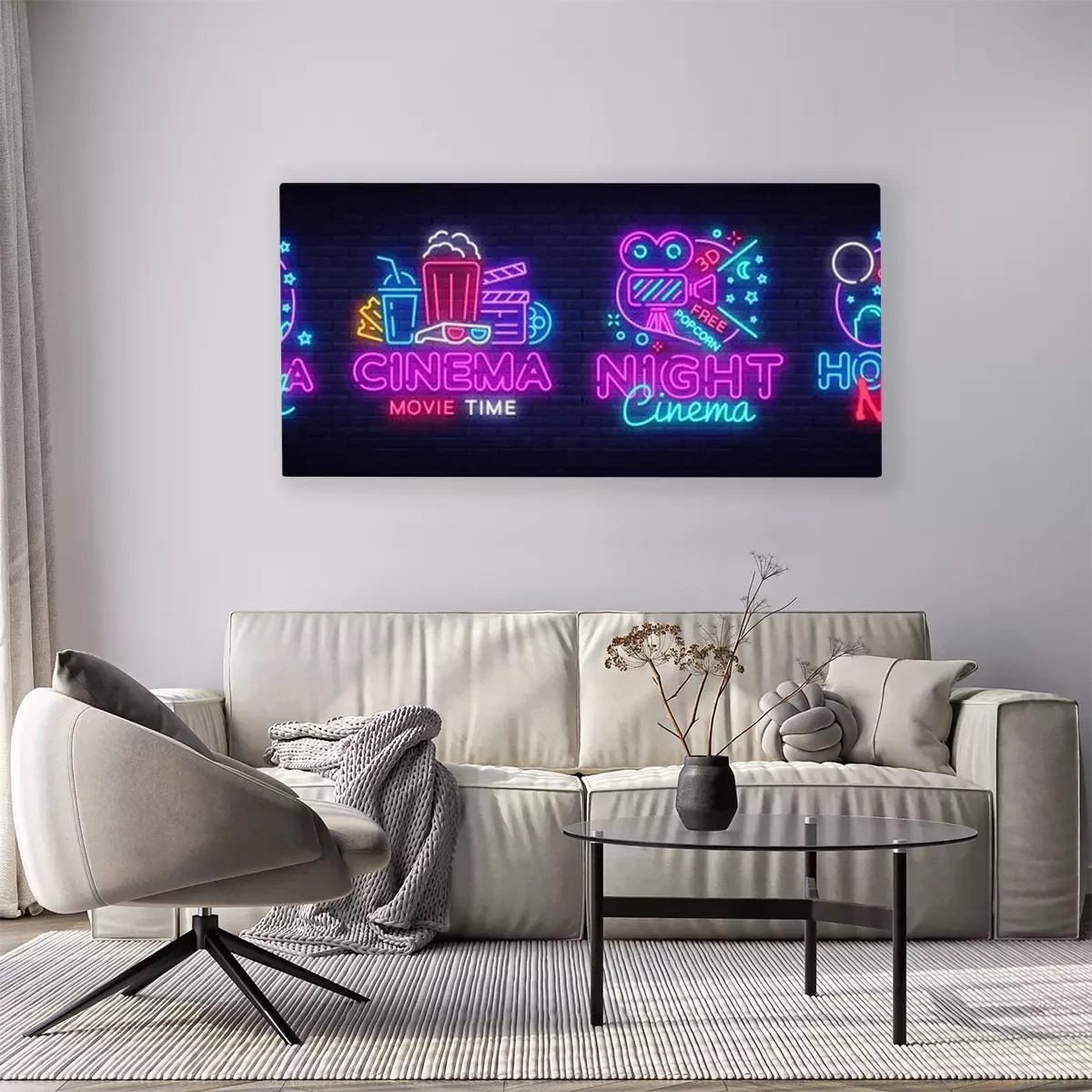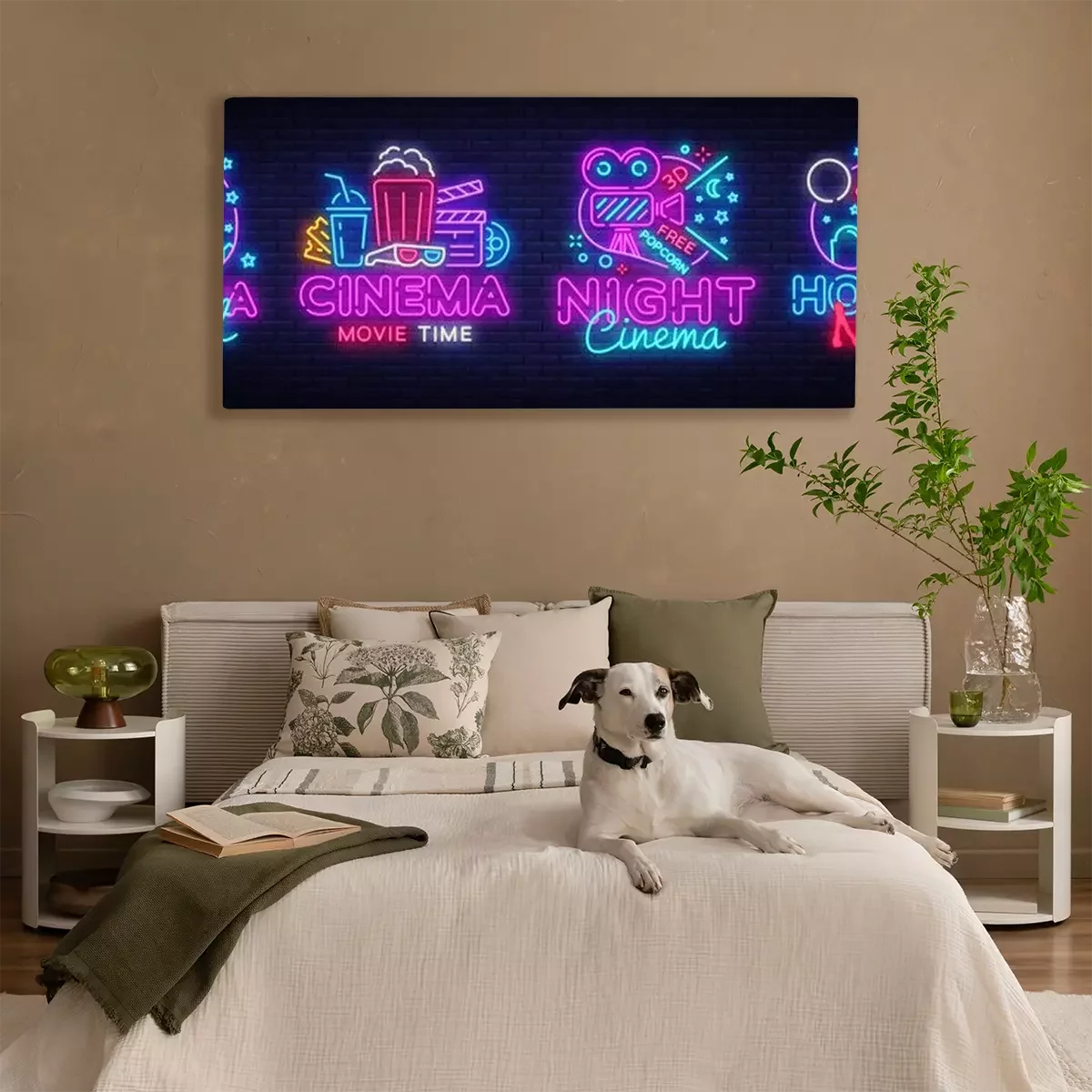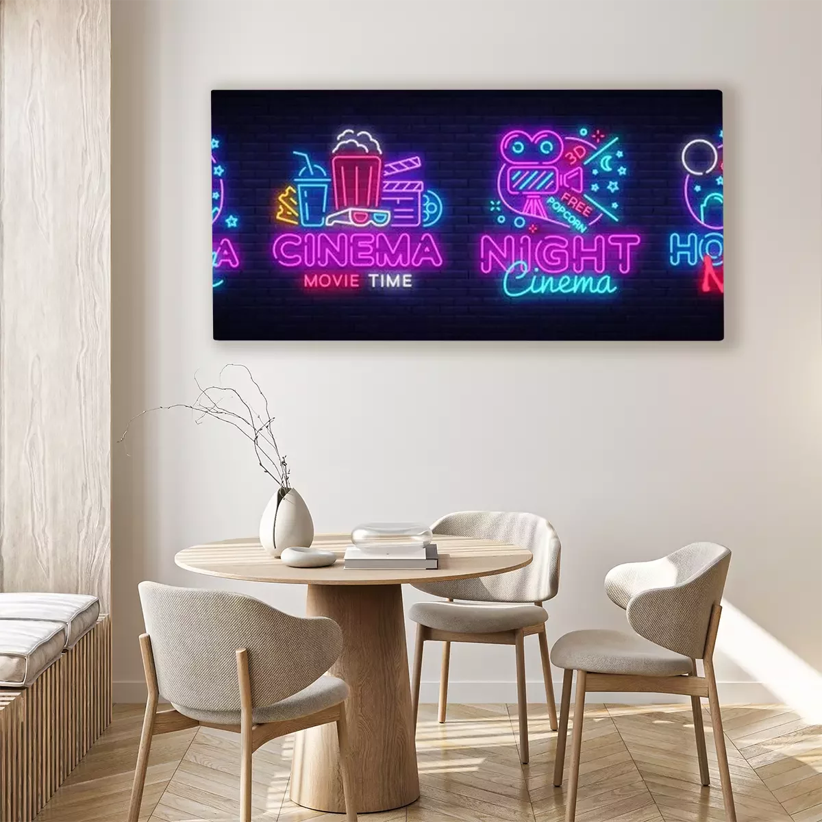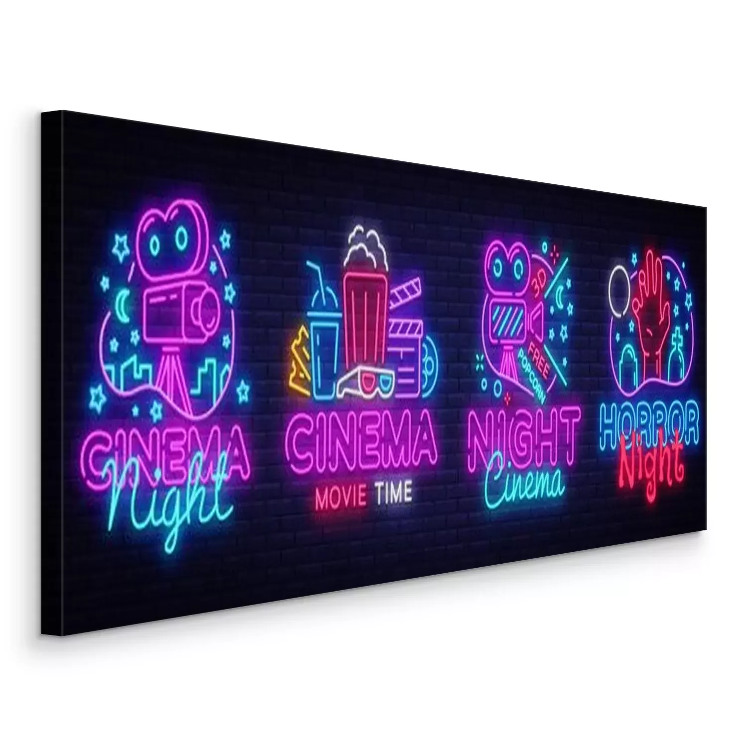 Canvas Nachtgebeurtenis van bioscoopfilms, label en logo. Cinema banner Ontwerpsjabloon, logo, embleem en label. Helder bord, nachtelijke heldere reclame. Film logo. Vector illustratie