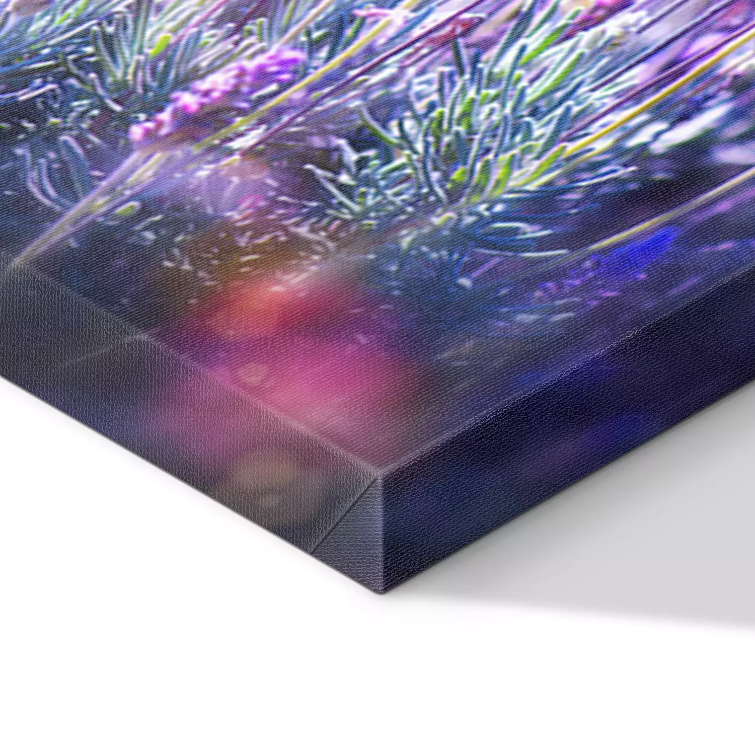 De print wordt aangebracht op hoogwaardig canvas dat op een schildersweefgetouw (spieraam) wordt gespannen. Omdat de print de zijranden bedekt, hoeft het ontwerp niet met een extra kader te worden omlijst. Wij raden ook composities aan die uit meerdere foto's bestaan en zo een coherente compositie vormen.