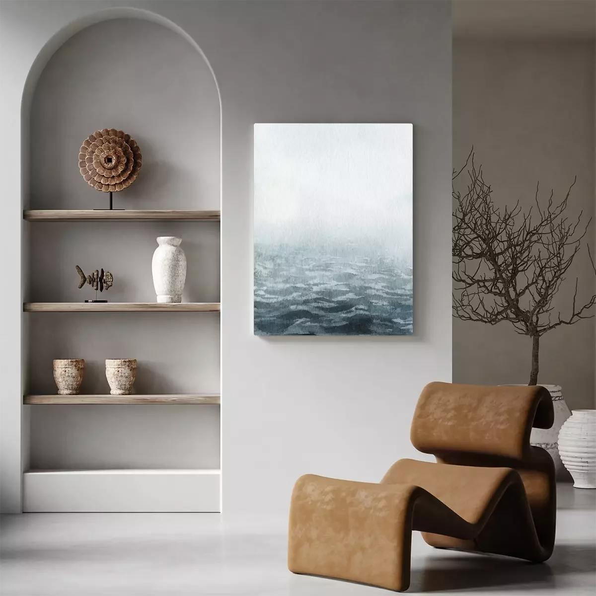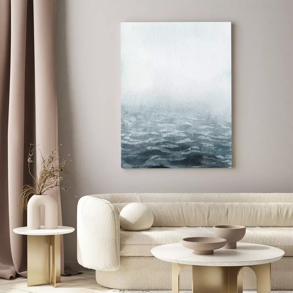 Canvas Neo-noir landscape. Blue river / lake / sea / ocean in fog - hand drawn watercolor painting in minimalist style. Pre-made scene, background.