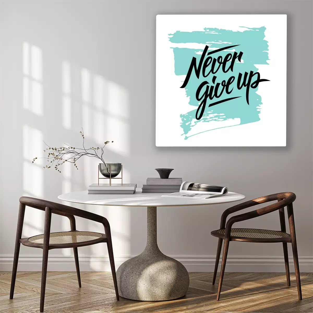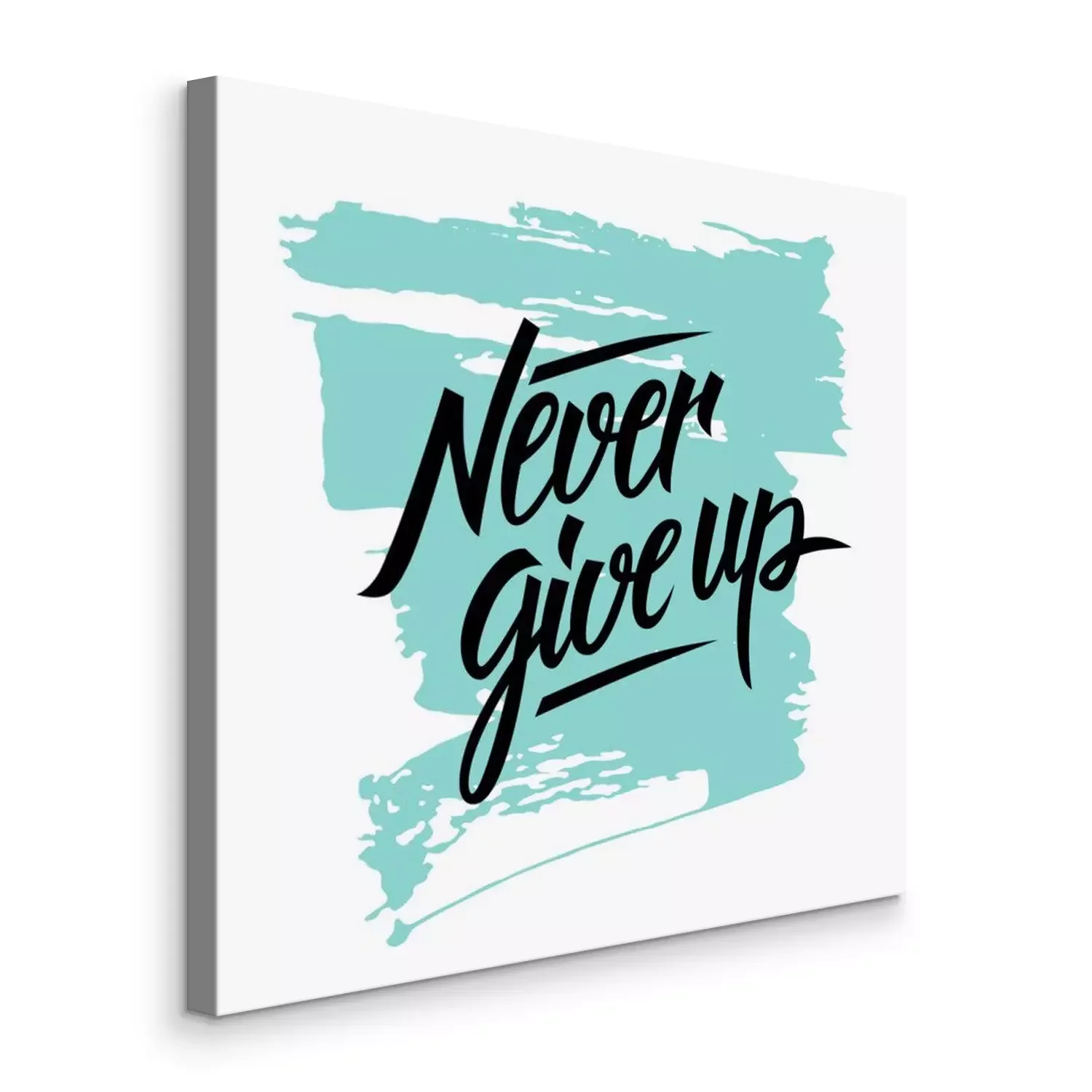 Canvas Never give up motieven citaat. Handgeschreven inscriptie met penseelstreek achtergrond. getrokken letters Hand. Vector illustratie.