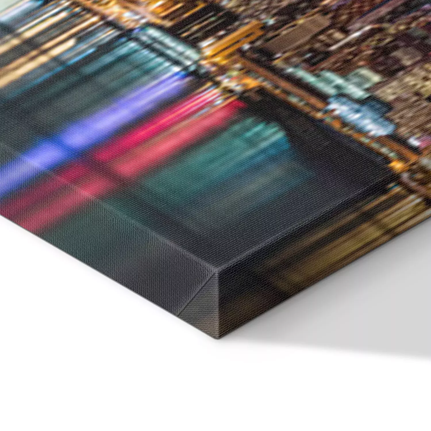 De print wordt aangebracht op hoogwaardig canvas dat op een schildersweefgetouw (spieraam) wordt gespannen. Omdat de print de zijranden bedekt, hoeft het ontwerp niet met een extra kader te worden omlijst. Wij raden ook composities aan die uit meerdere foto's bestaan en zo een coherente compositie vormen.