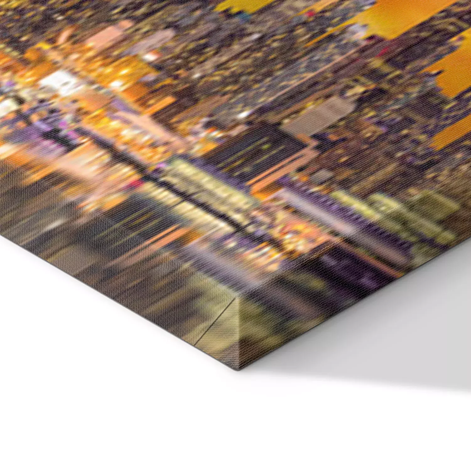 De print wordt aangebracht op hoogwaardig canvas dat op een schildersweefgetouw (spieraam) wordt gespannen. Omdat de print de zijranden bedekt, hoeft het ontwerp niet met een extra kader te worden omlijst. Wij raden ook composities aan die uit meerdere foto's bestaan en zo een coherente compositie vormen.
