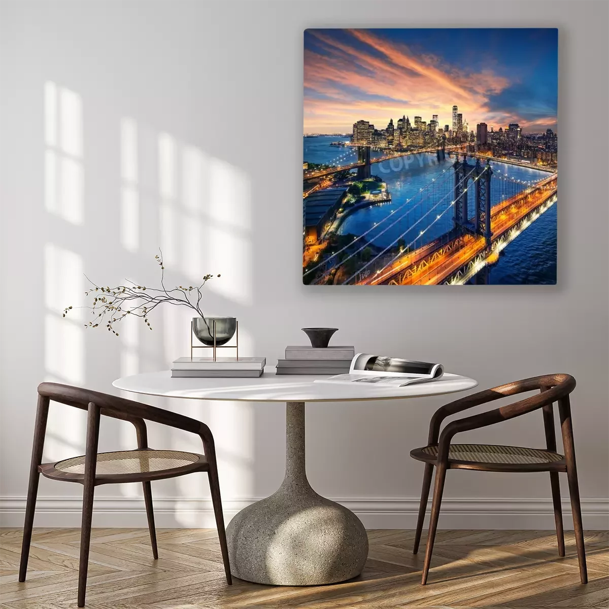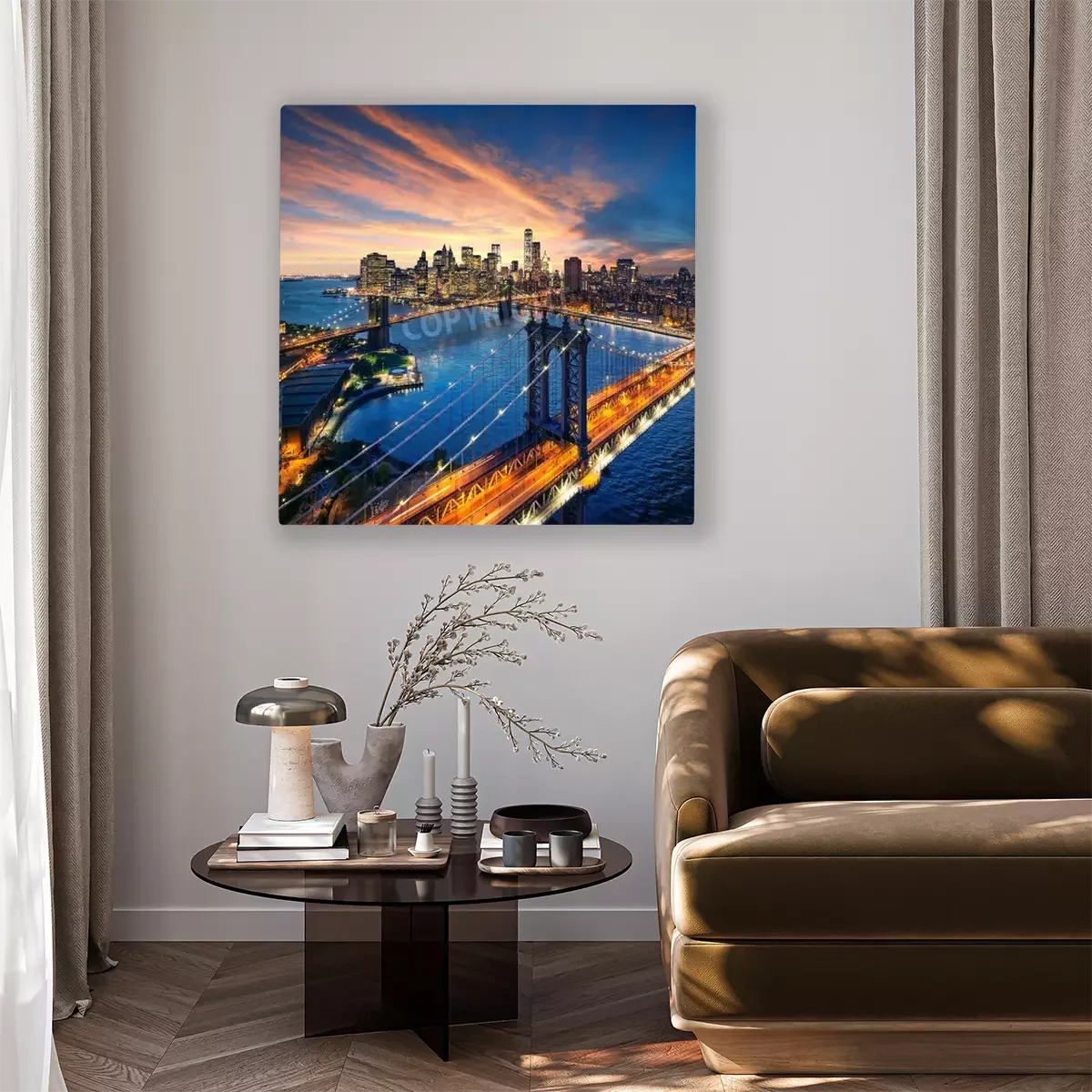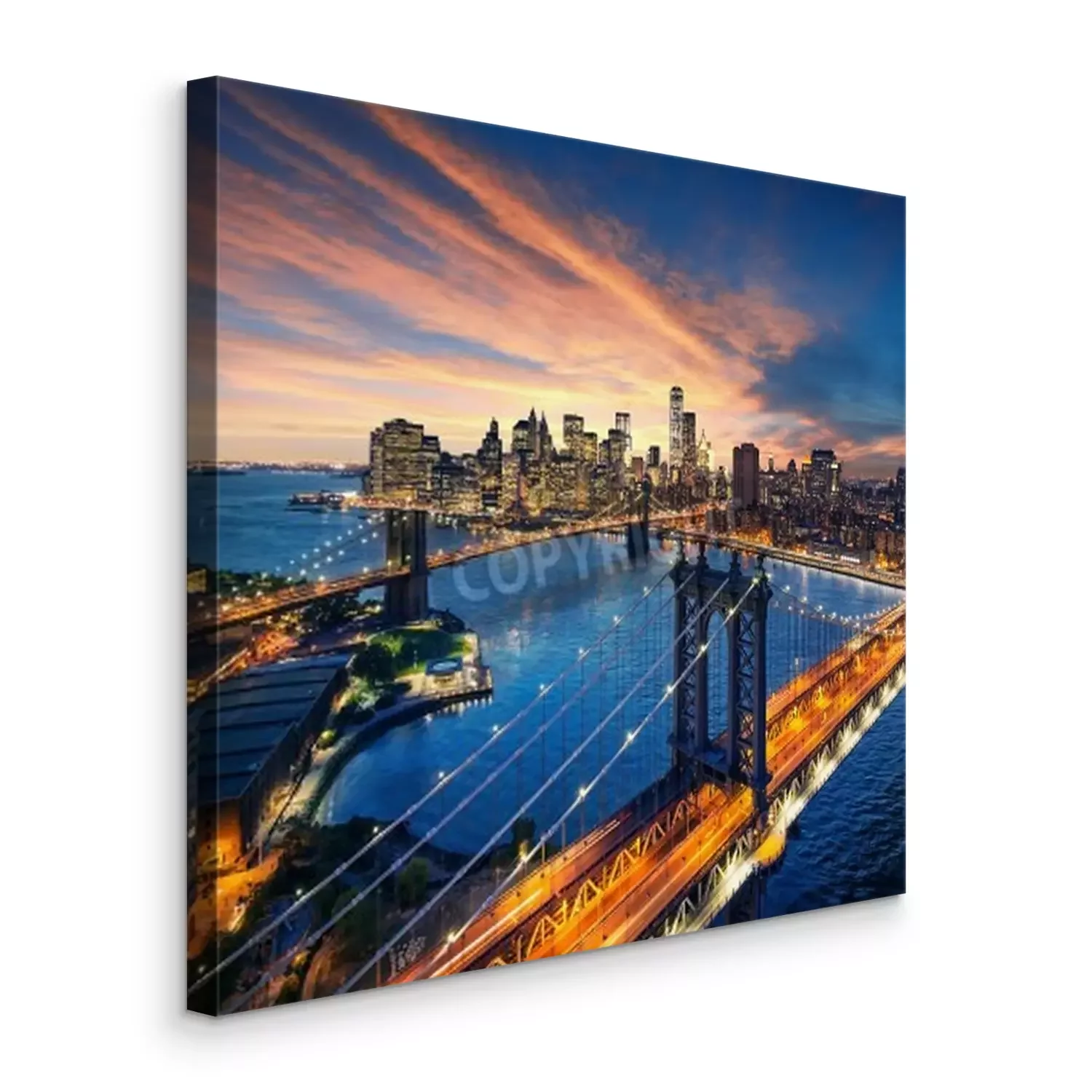Canvas: New York City - Prachtige zonsondergang over Manhattan met Manhattan en Brooklyn Bridge