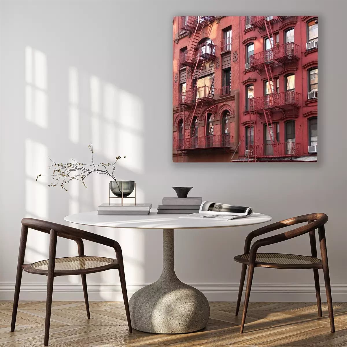 De print wordt aangebracht op hoogwaardig canvas dat op een schildersweefgetouw (spieraam) wordt gespannen. Omdat de print de zijranden bedekt, hoeft het ontwerp niet met een extra kader te worden omlijst. Wij raden ook composities aan die uit meerdere foto's bestaan en zo een coherente compositie vormen.