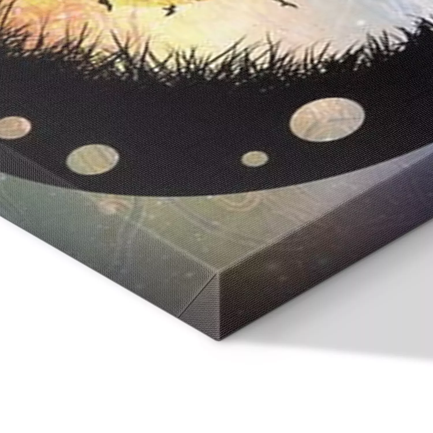 De print wordt aangebracht op hoogwaardig canvas dat op een schildersweefgetouw (spieraam) wordt gespannen. Omdat de print de zijranden bedekt, hoeft het ontwerp niet met een extra kader te worden omlijst. Wij raden ook composities aan die uit meerdere foto's bestaan en zo een coherente compositie vormen.