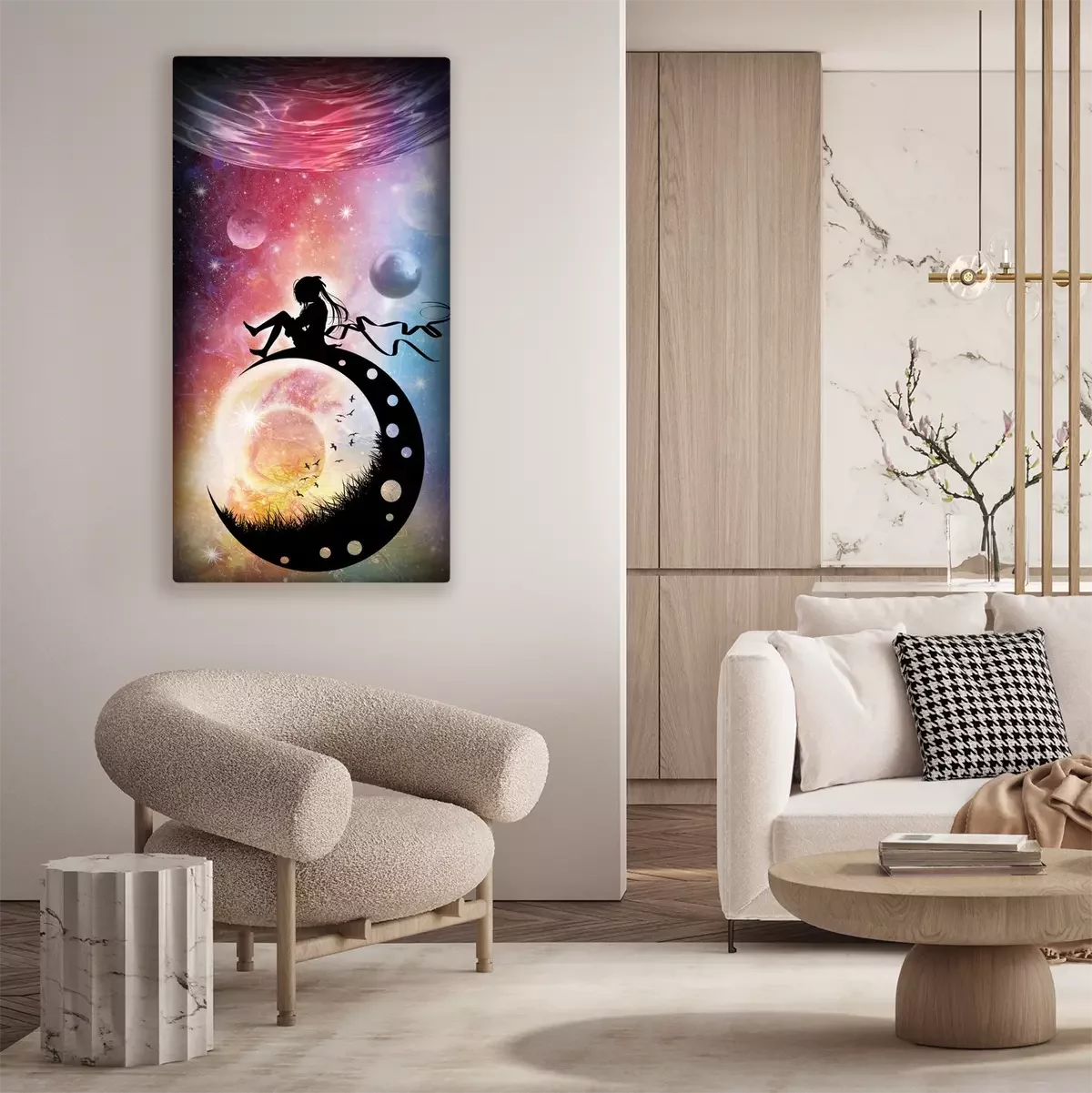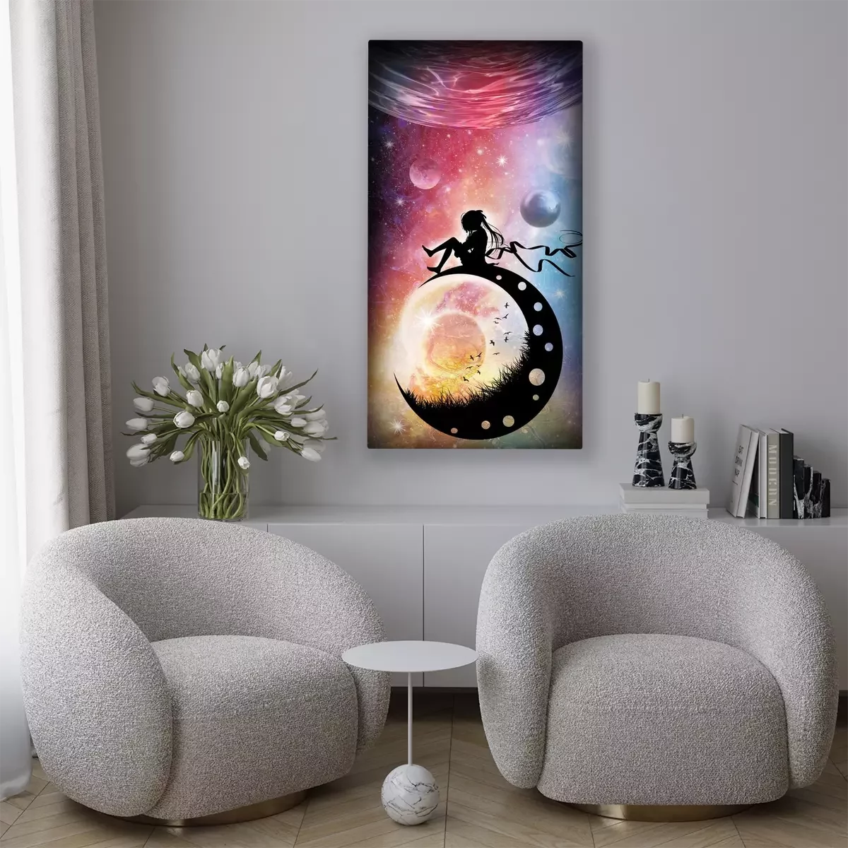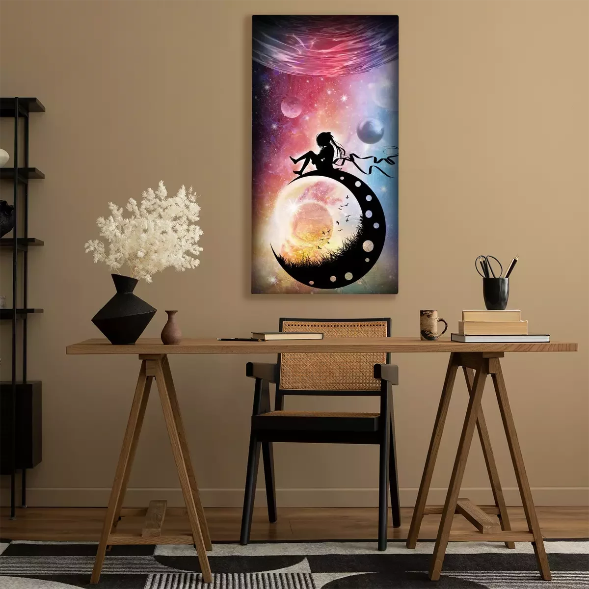 Canvas: Nieuwe wereld nieuw leven eenzaam anime meisje in de ruimte silhouet art fotomanipulatie