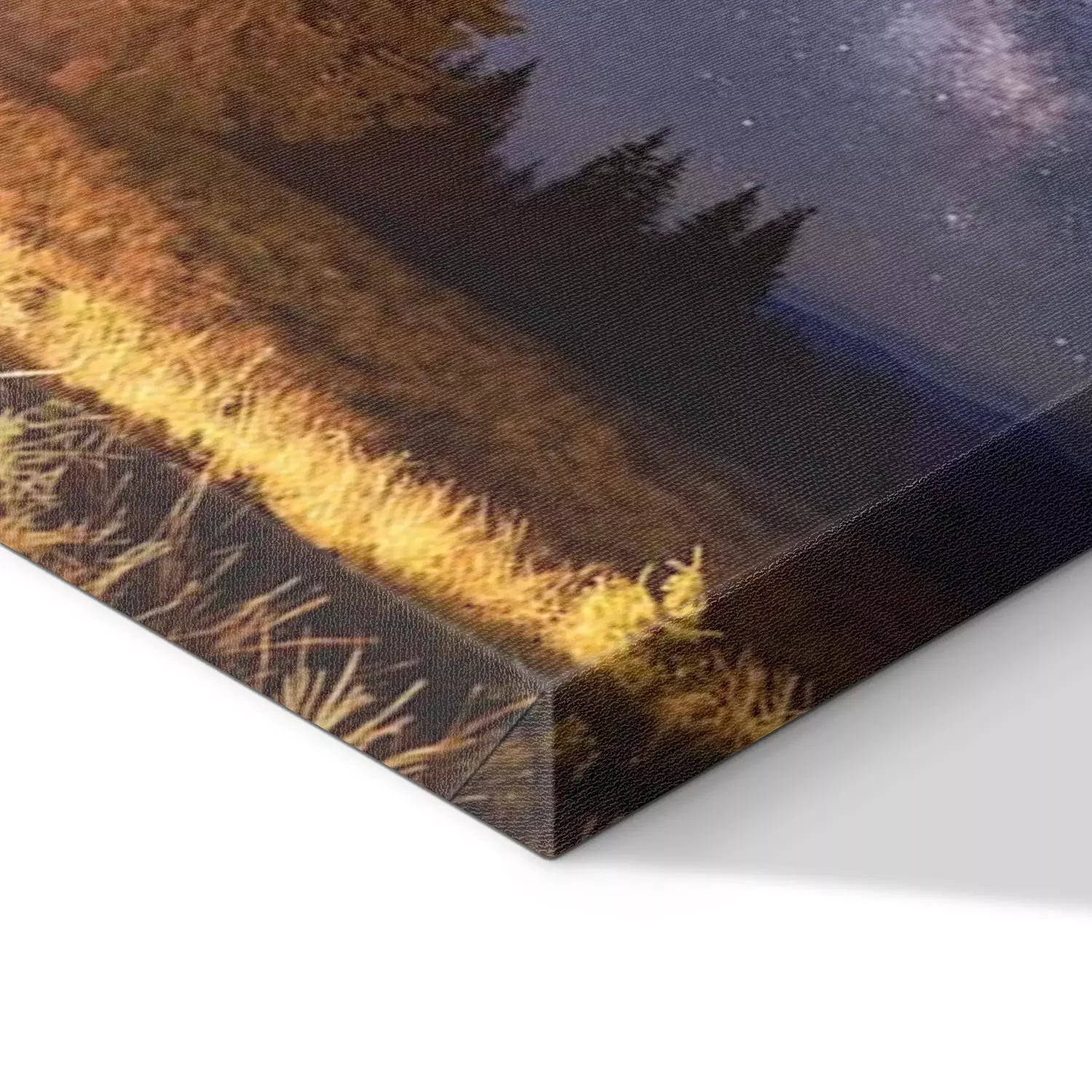 De print wordt aangebracht op hoogwaardig canvas dat op een schildersweefgetouw (spieraam) wordt gespannen. Omdat de print de zijranden bedekt, hoeft het ontwerp niet met een extra kader te worden omlijst. Wij raden ook composities aan die uit meerdere foto's bestaan en zo een coherente compositie vormen.