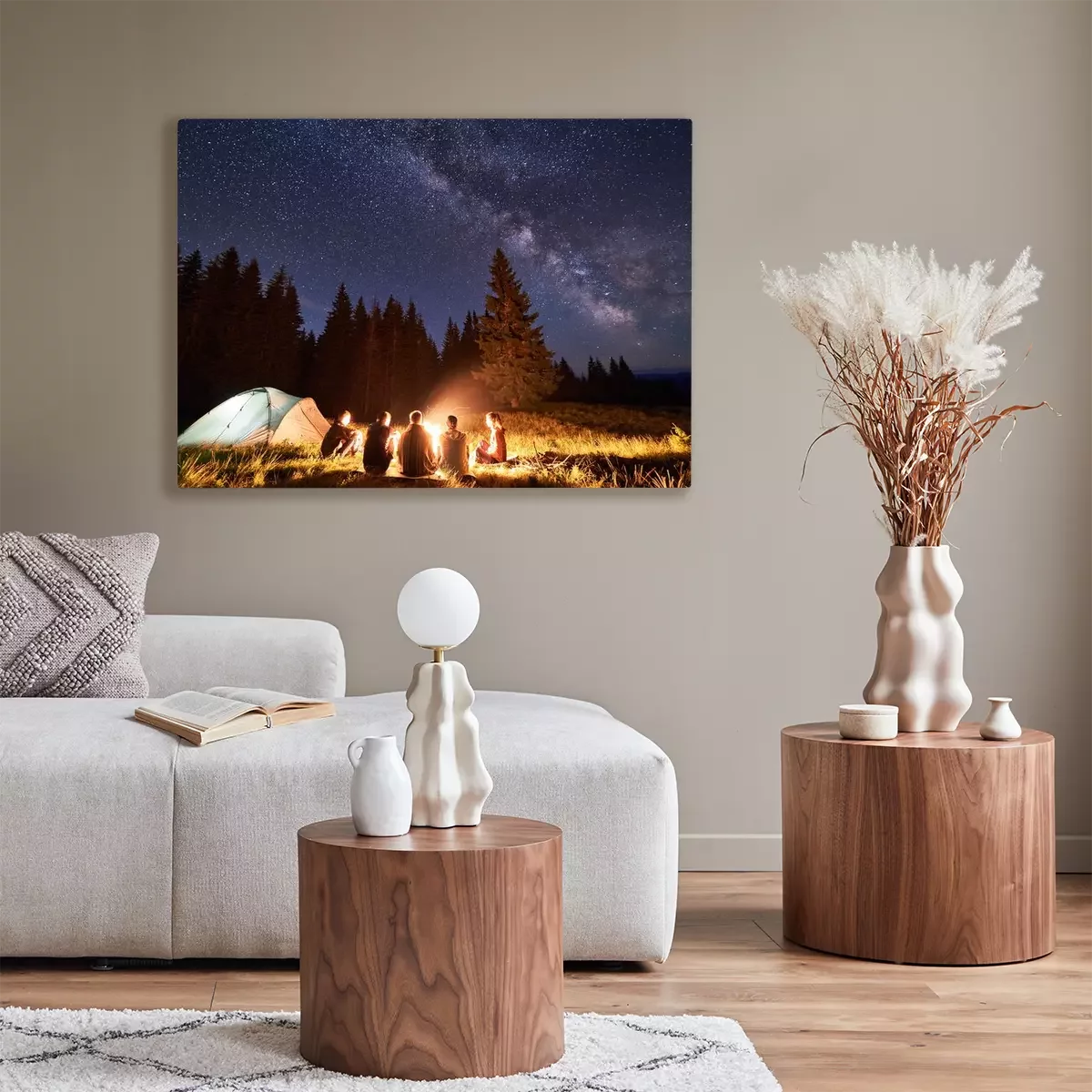 Canvas Night summer camping in the mountains, spruce forest on background, sky with stars and milky way. Back view group of five tourists having a rest together around campfire, enjoying fresh air near tent.