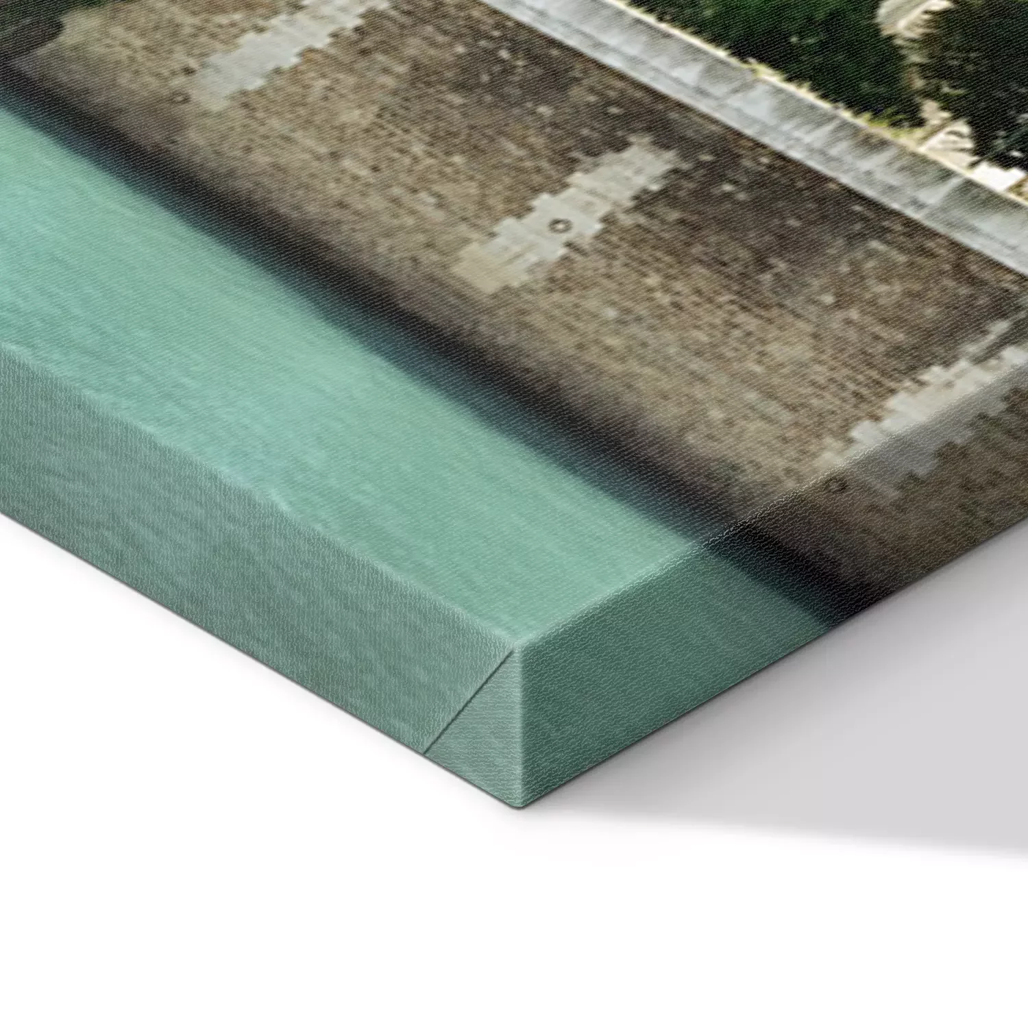 De print wordt aangebracht op hoogwaardig canvas dat op een schildersweefgetouw (spieraam) wordt gespannen. Omdat de print de zijranden bedekt, hoeft het ontwerp niet met een extra kader te worden omlijst. Wij raden ook composities aan die uit meerdere foto's bestaan en zo een coherente compositie vormen.