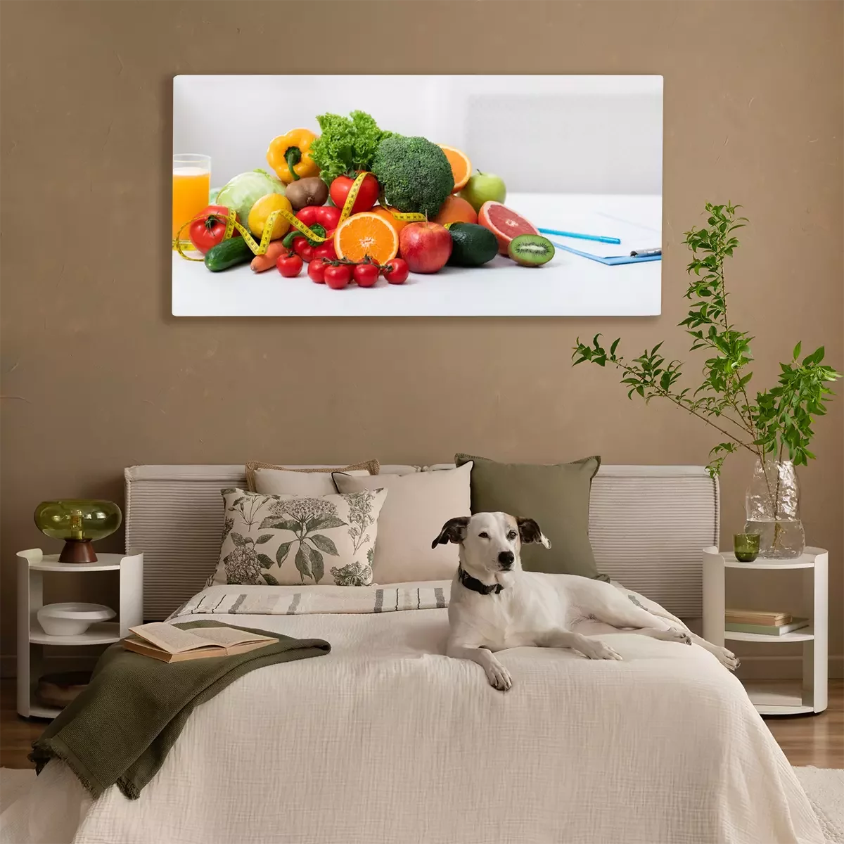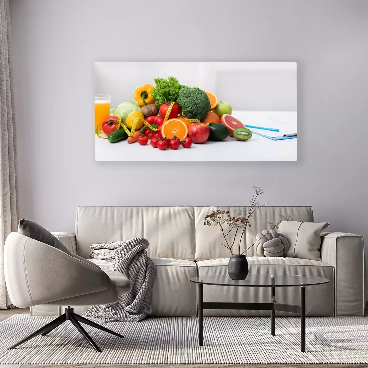 Canvas Nutritionist's workplace with fruits, vegetables, measuring tape on table