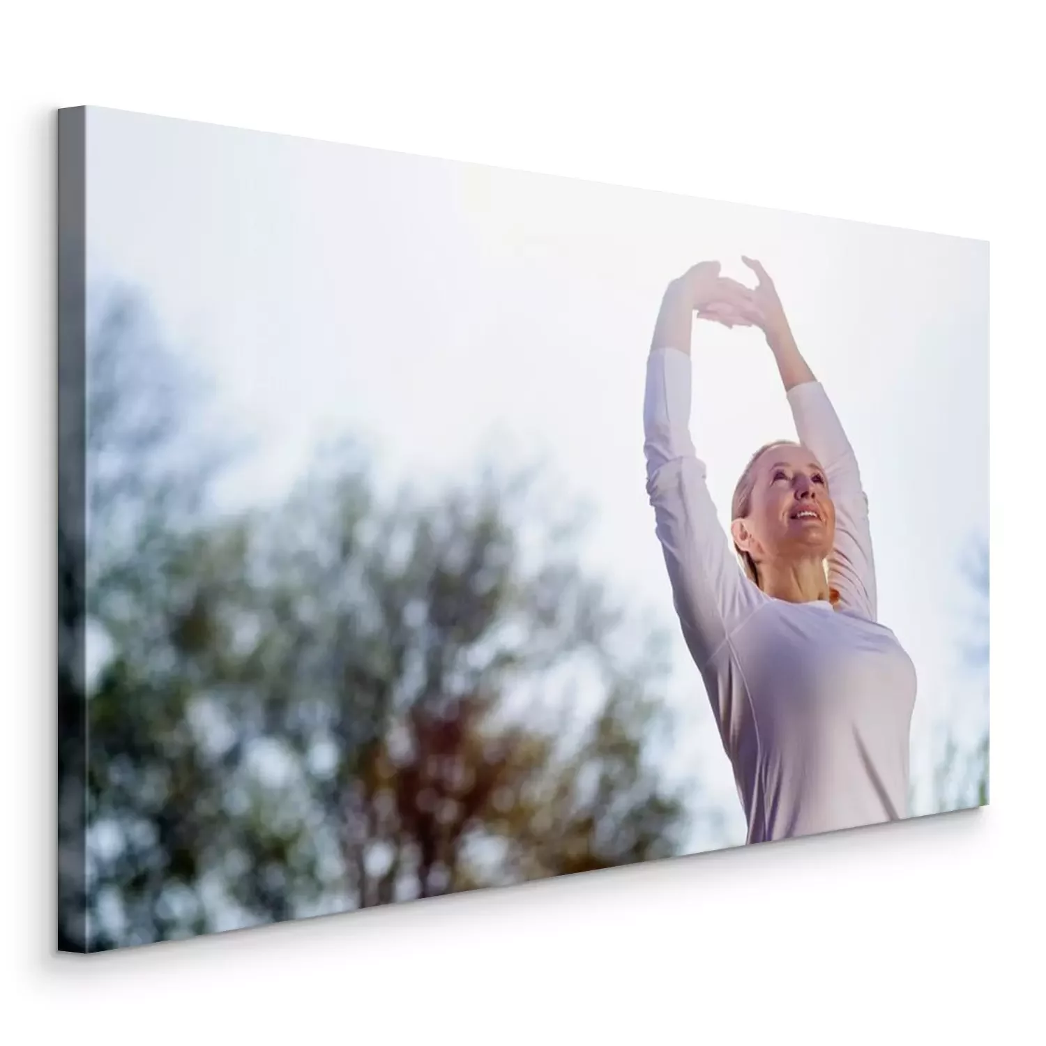 Canvas Ochtendgymnastiek. De vrolijke vrouw die van Nice haar handen tegenhoudt terwijl het doen van ochtendoefeningen