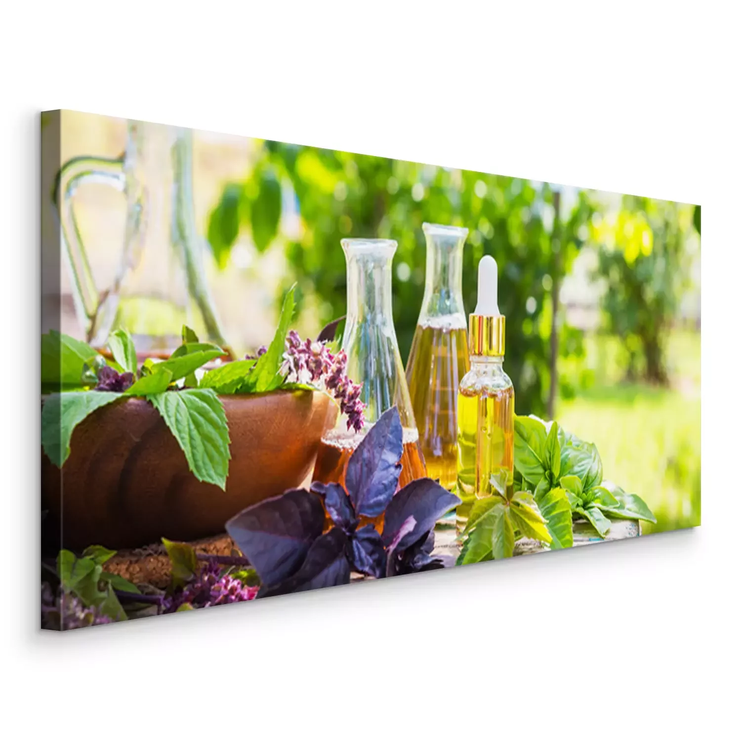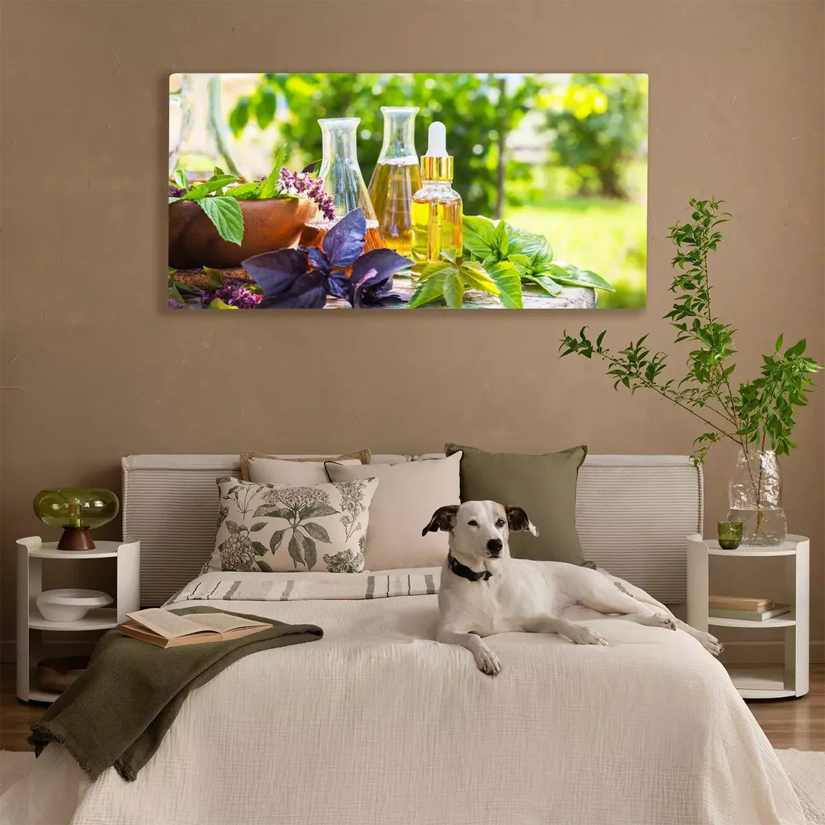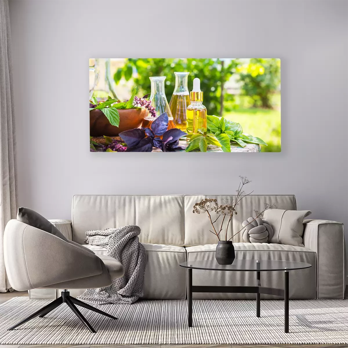 Canvas: Oil for skin care, massage from natural ingredients, herbs, mint in glass jars and test tubes on a green background in the garden on the nature, natural cosmetics