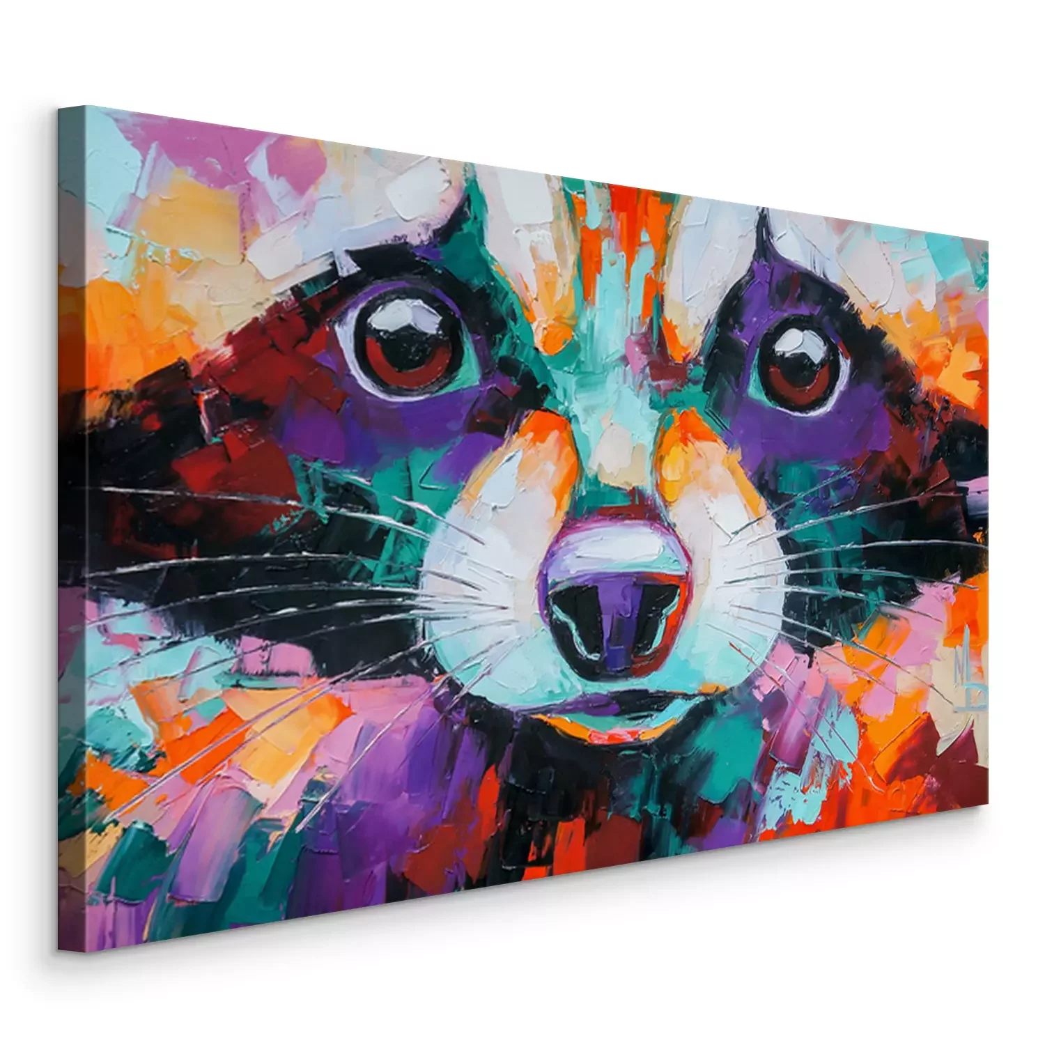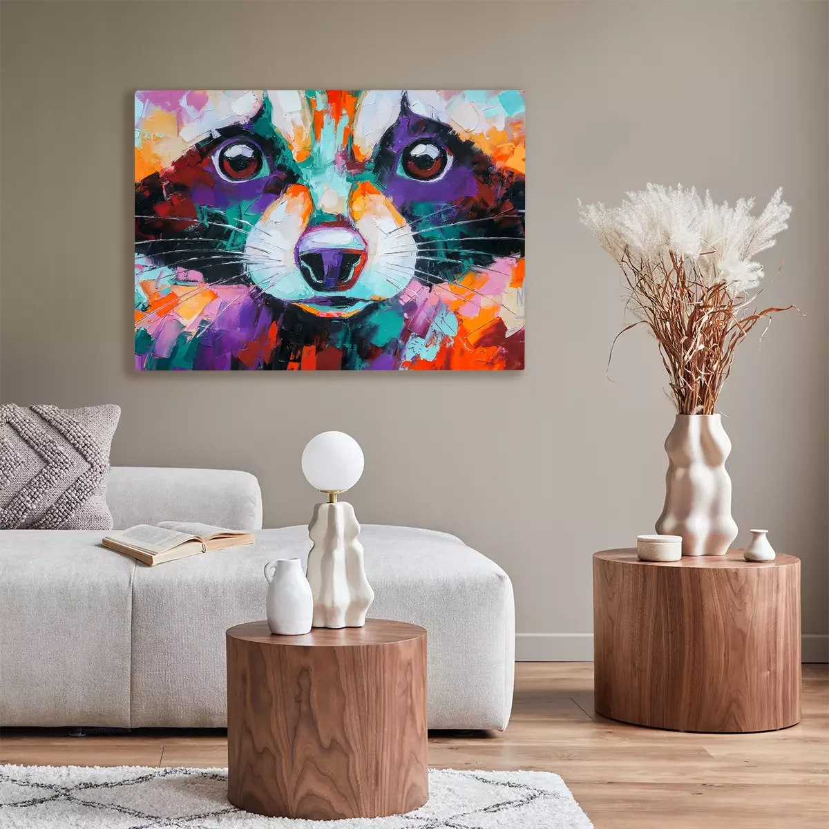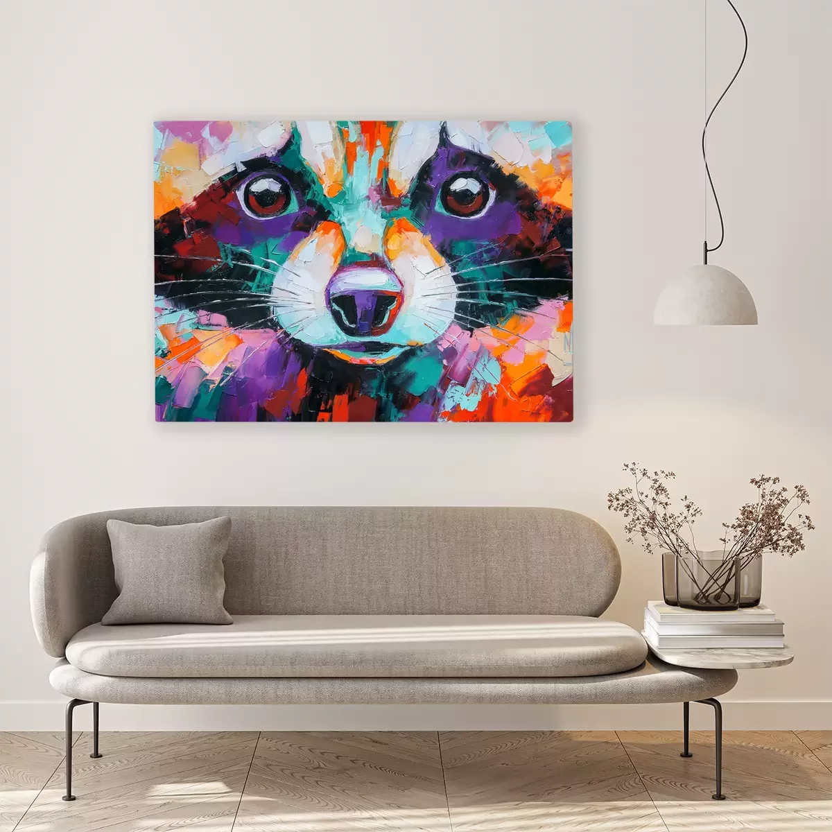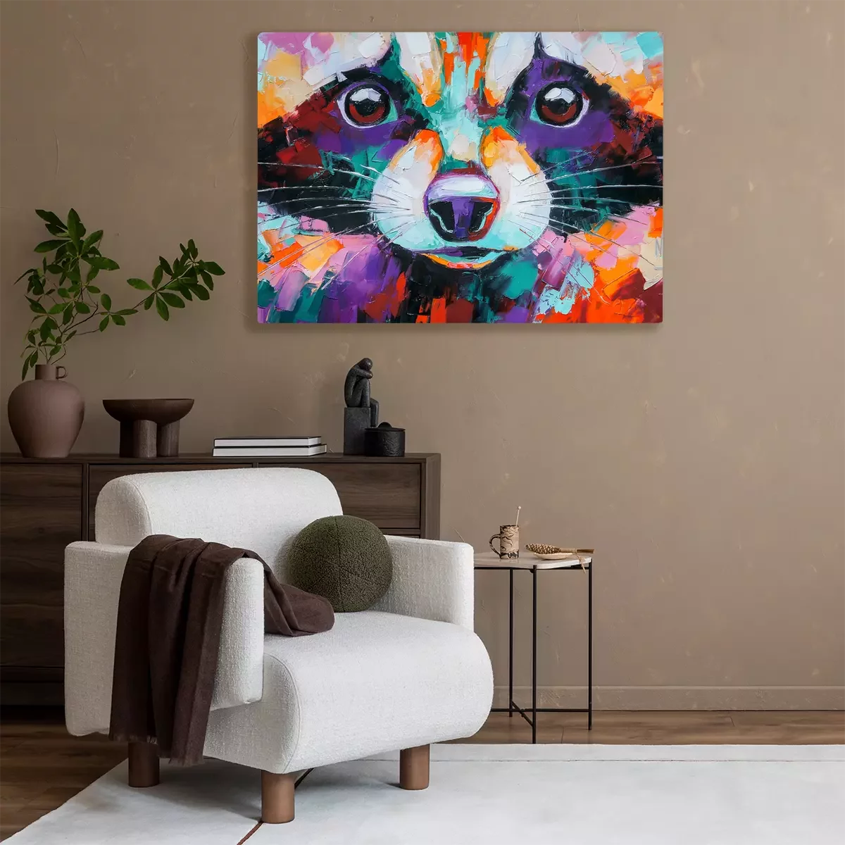 Canvas: Oil raccoon portrait painting in multicolored tones. Conceptual abstract painting of a raccoon muzzle. Closeup of a painting by oil and palette knife on canvas.