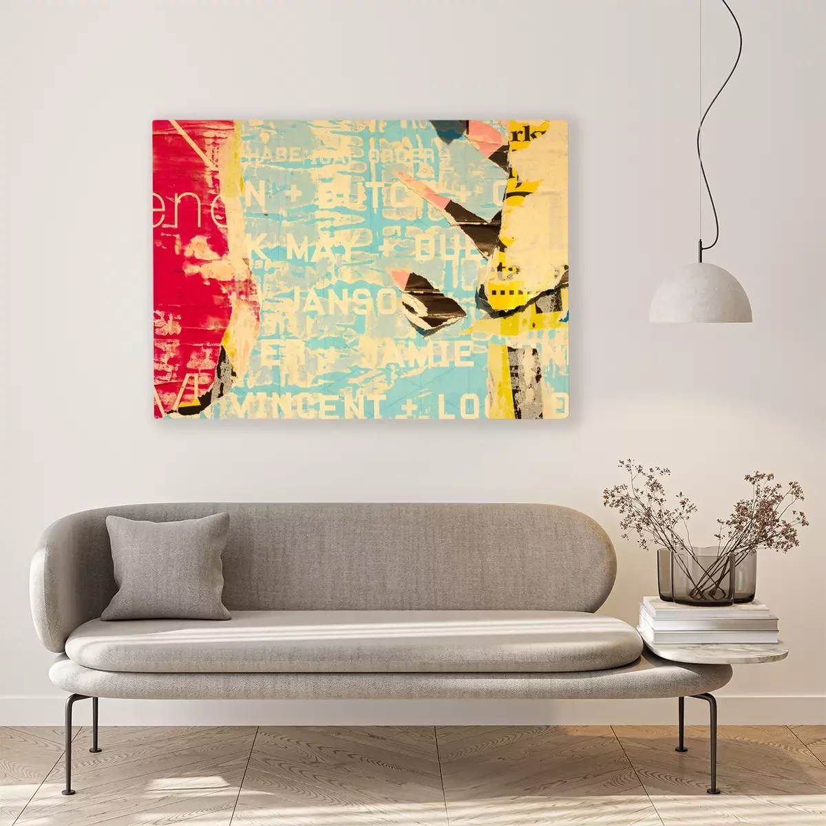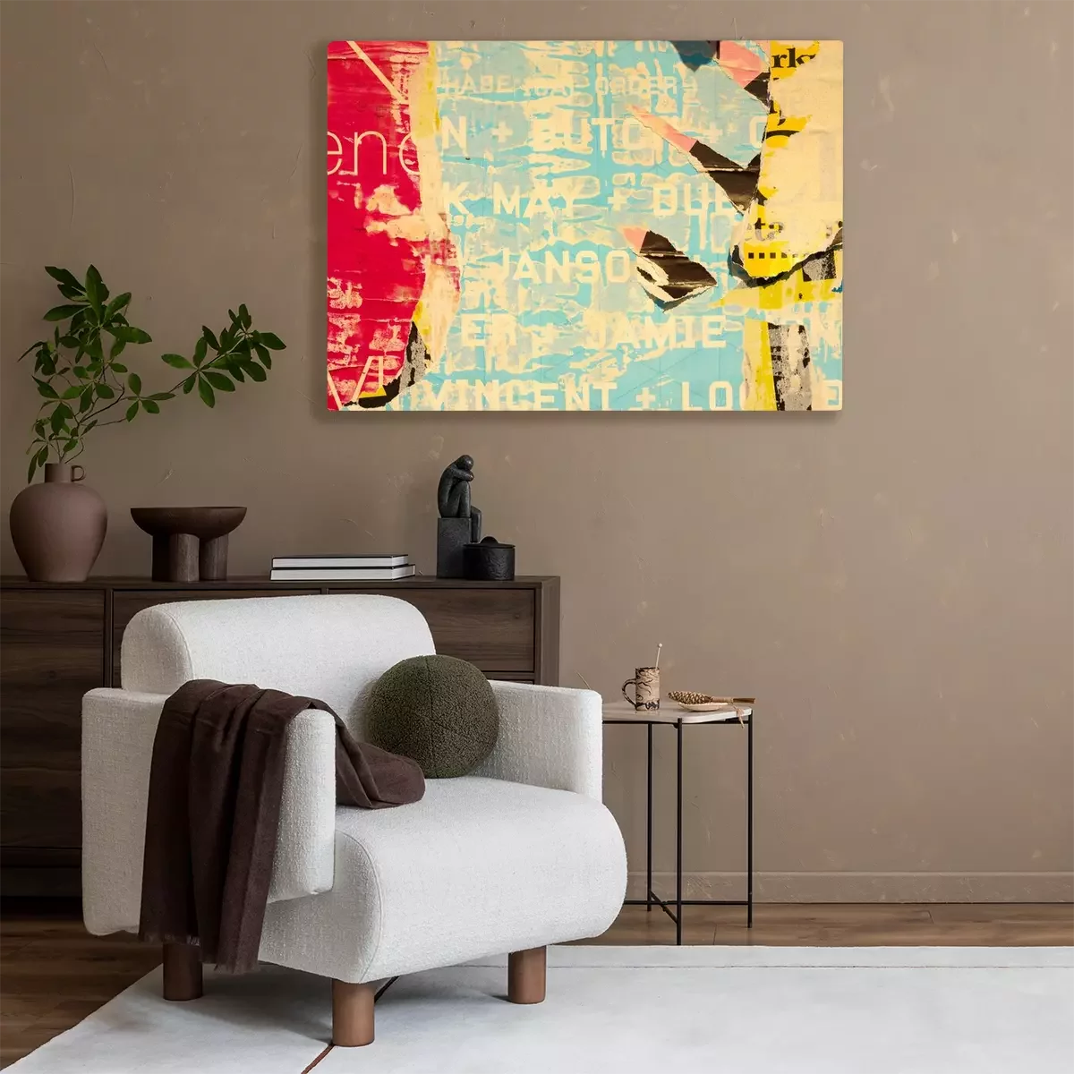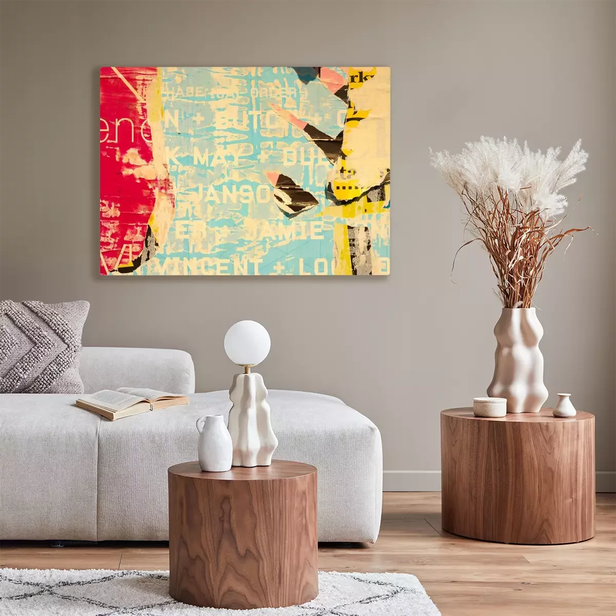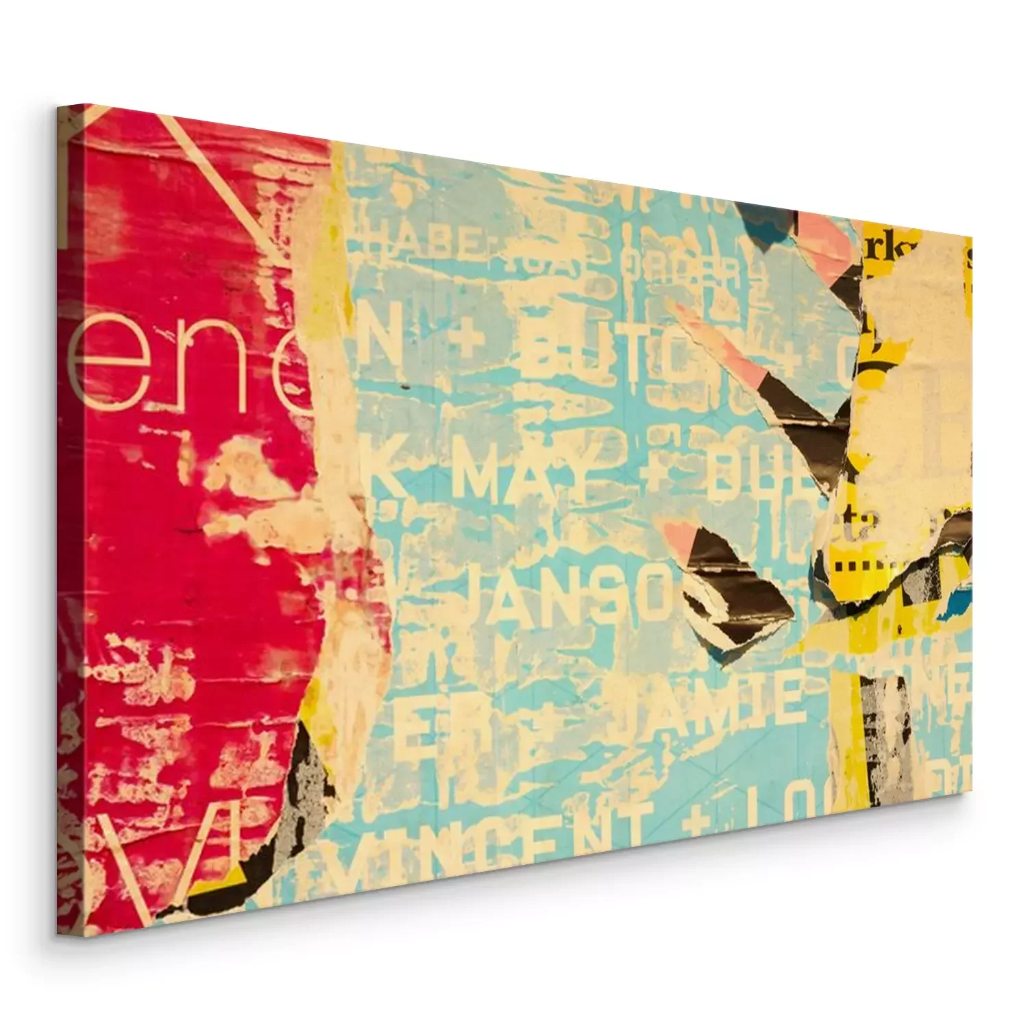 Canvas: Old grunge ripped torn vintage collage colorful street posters creased crumpled paper surface placard texture background backdrop