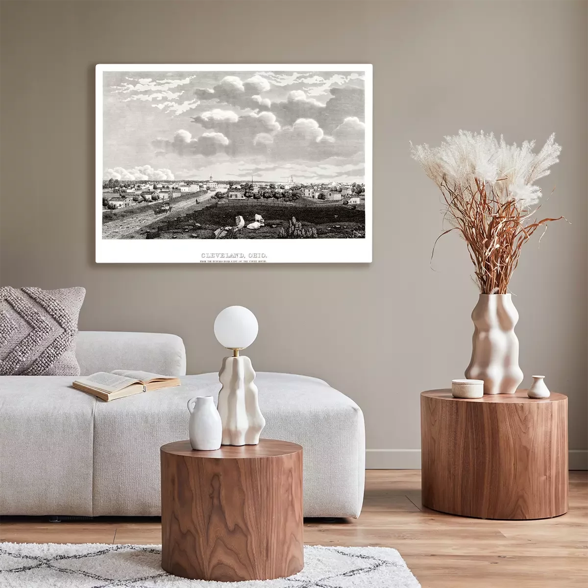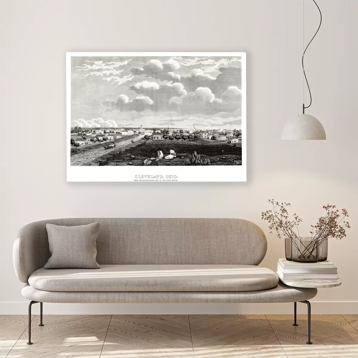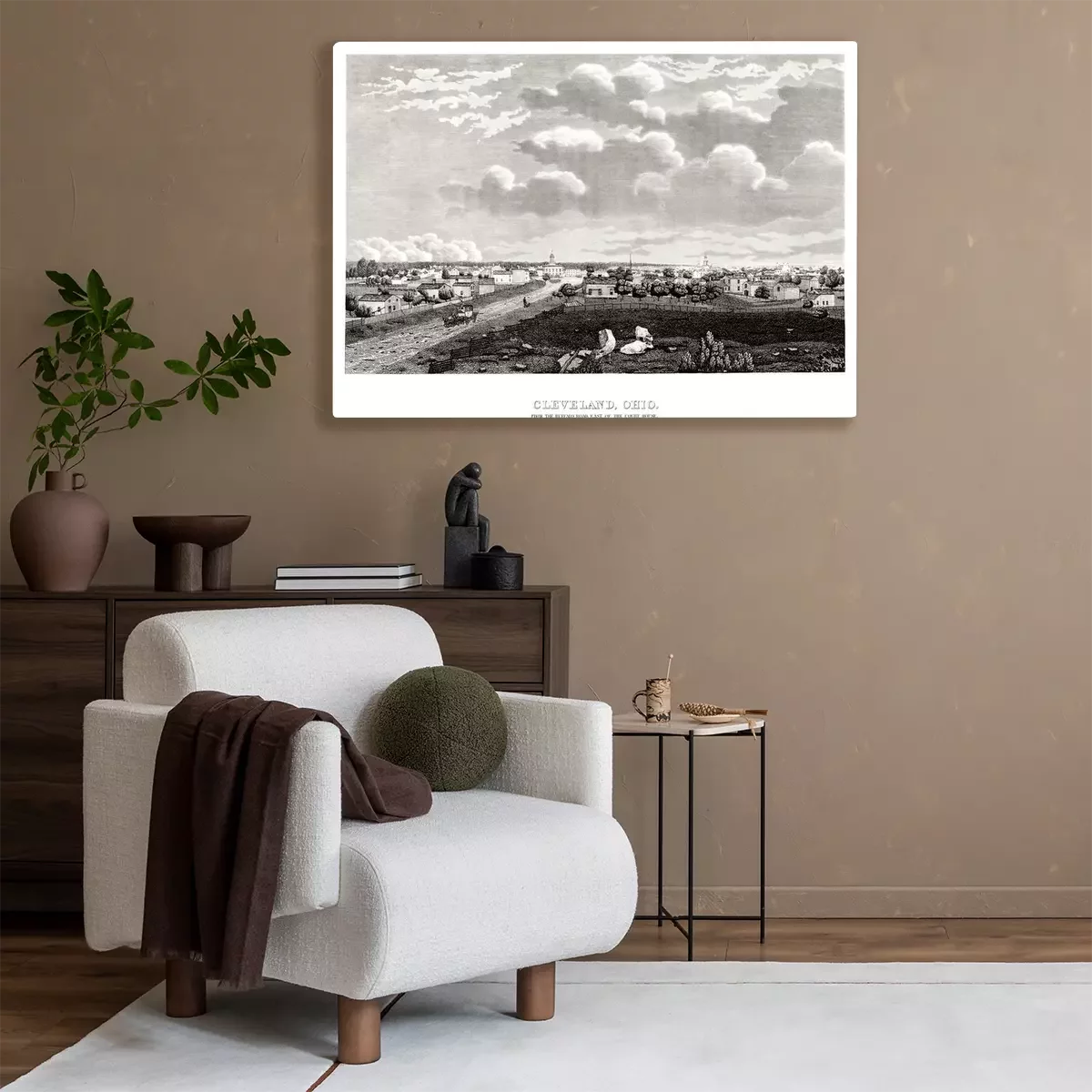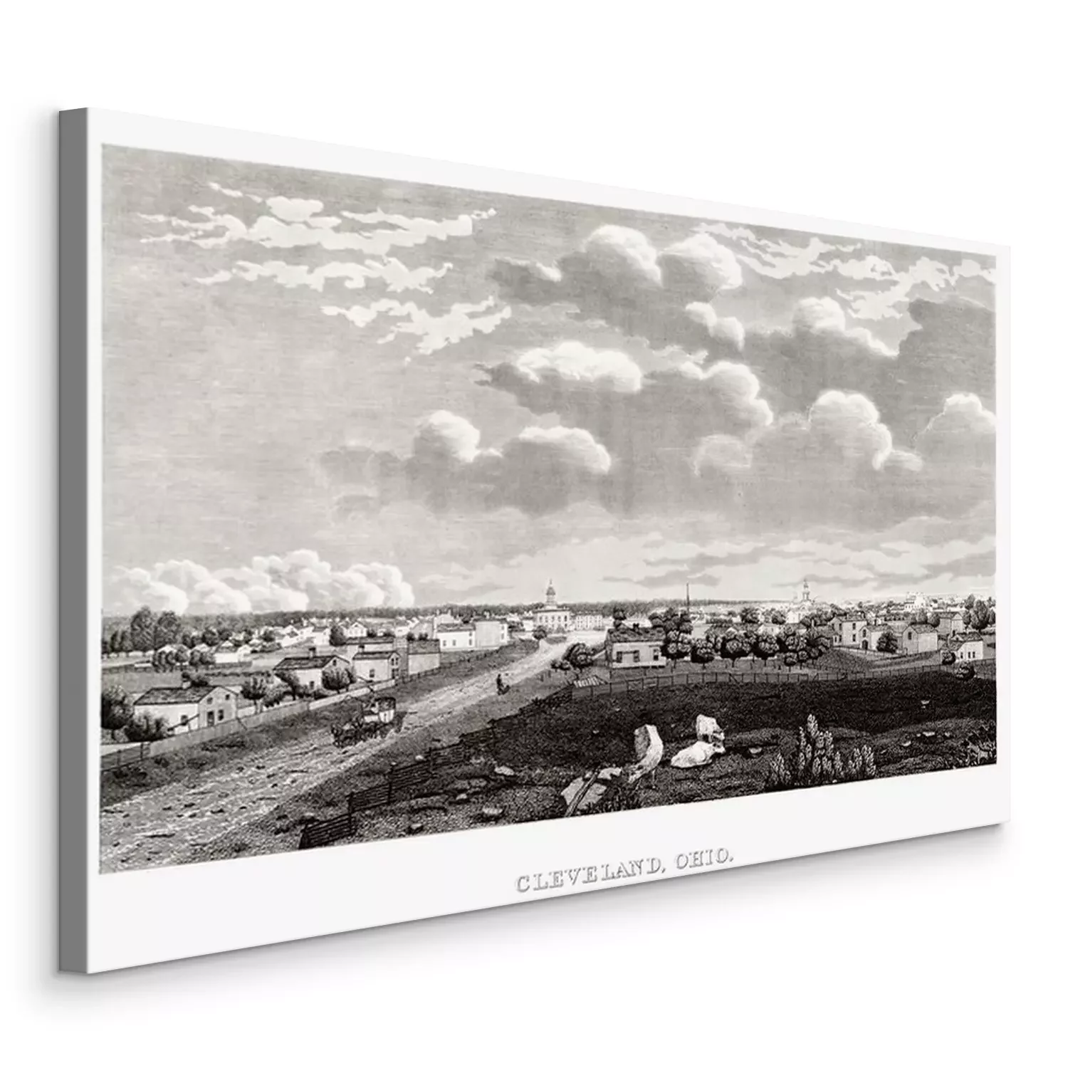 Canvas Old view of Cleveland, Ohio, from Buffalo Road to horizon. Highly detailed vintage style gray tone illustration by unidentified author, U.S., 1834