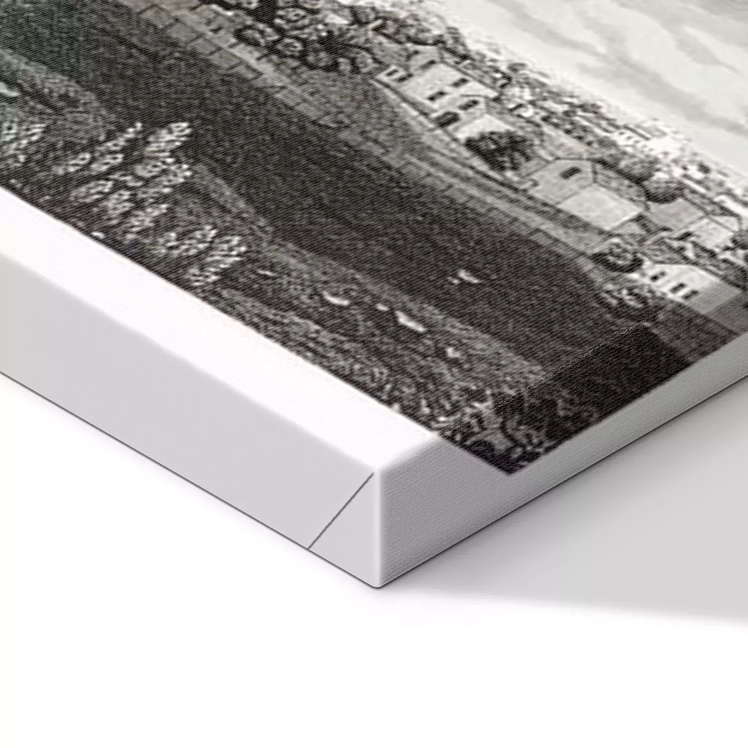 De print wordt aangebracht op hoogwaardig canvas dat op een schildersweefgetouw (spieraam) wordt gespannen. Omdat de print de zijranden bedekt, hoeft het ontwerp niet met een extra kader te worden omlijst. Wij raden ook composities aan die uit meerdere foto's bestaan en zo een coherente compositie vormen.