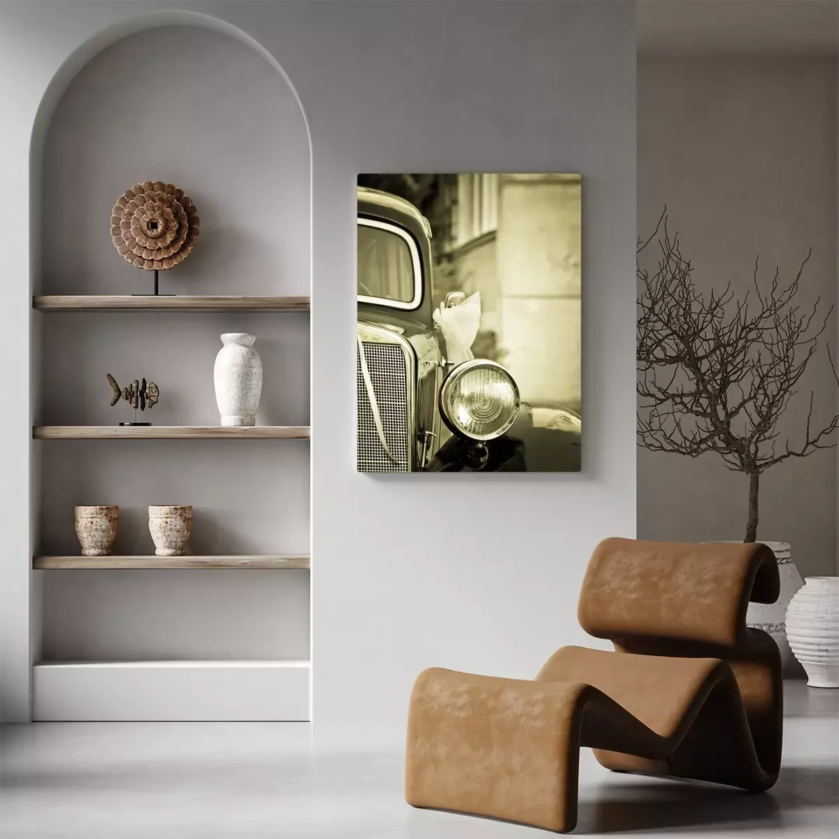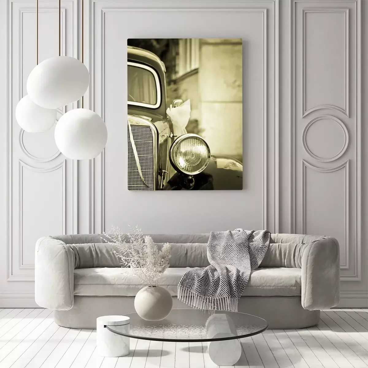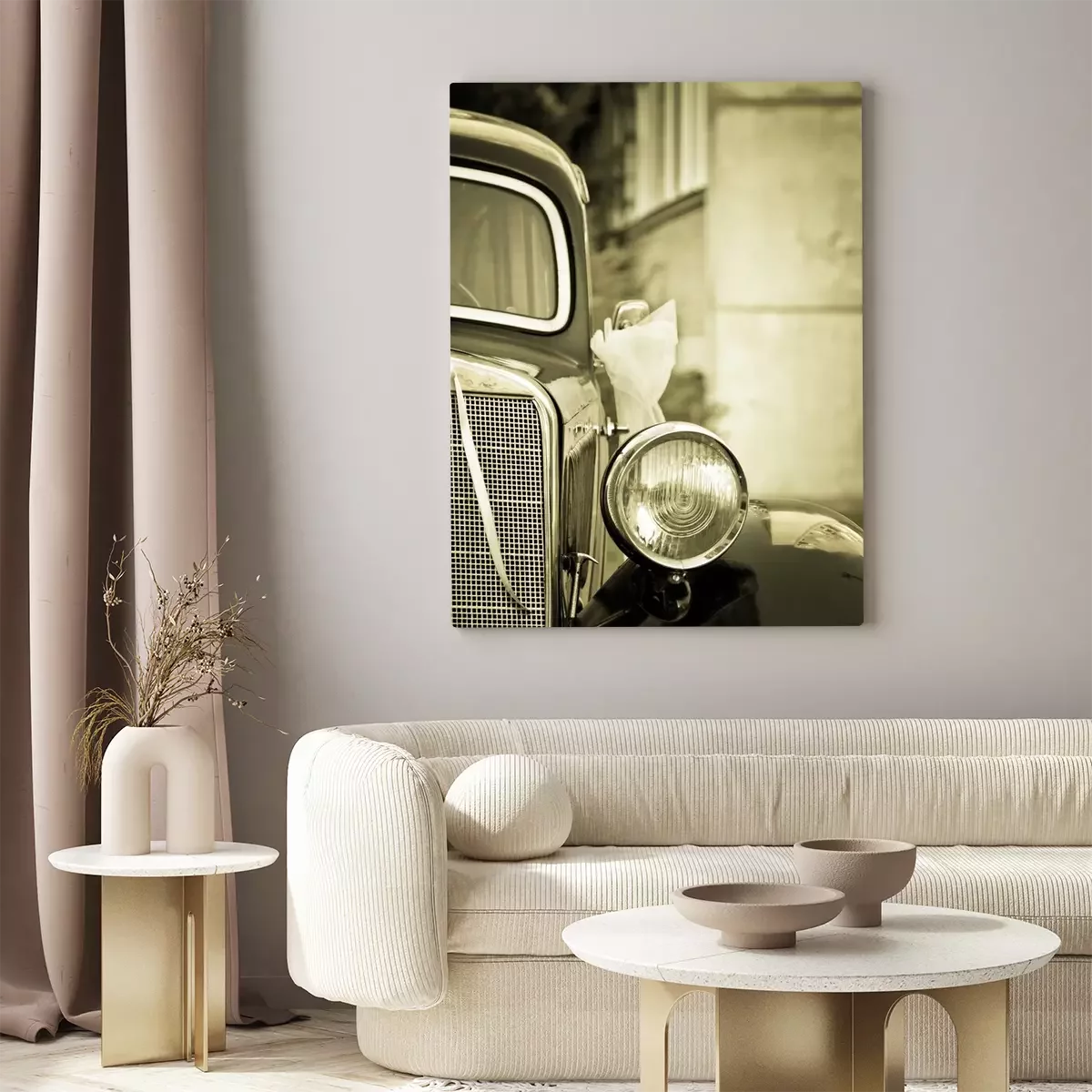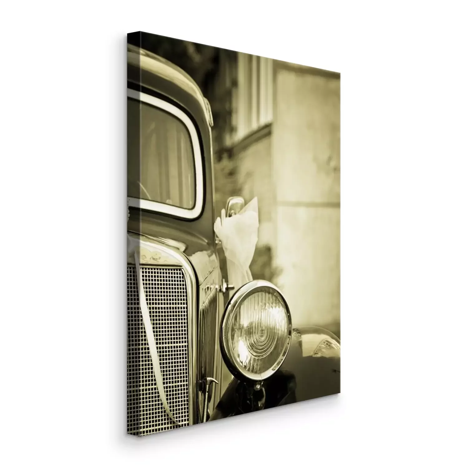Canvas Oldtimer auto met bruiloft decoratie in sepia