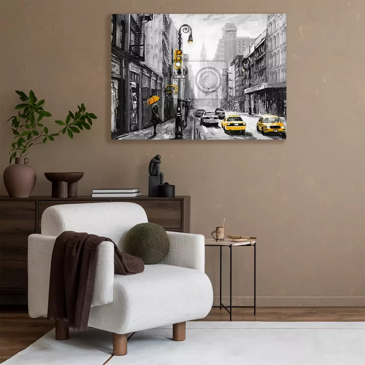 Canvas olieverfschilderij op canvas, straatmening van New York, man en vrouw, gele taxi, modern Kunstwerk, Amerikaanse stad, illustratie New York