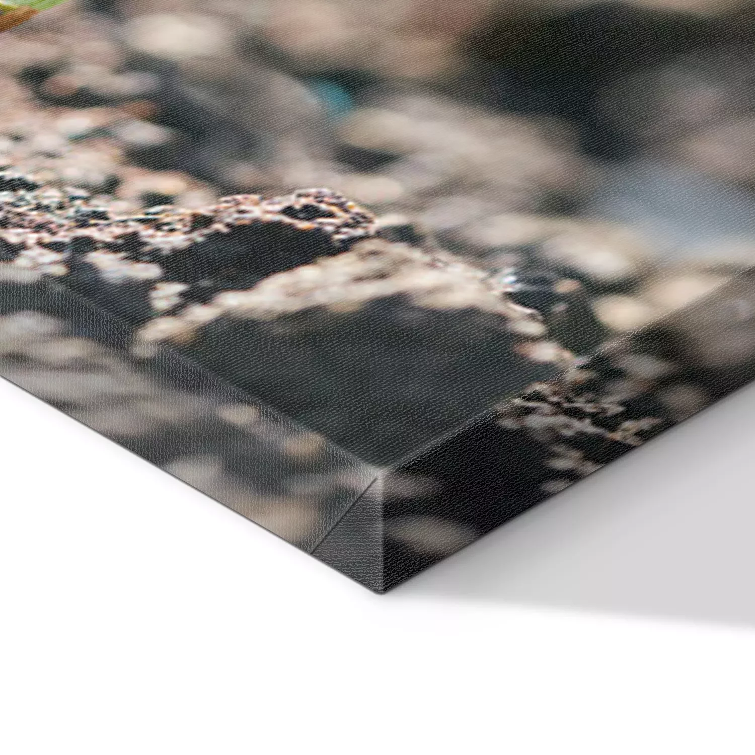 De print wordt aangebracht op hoogwaardig canvas dat op een schildersweefgetouw (spieraam) wordt gespannen. Omdat de print de zijranden bedekt, hoeft het ontwerp niet met een extra kader te worden omlijst. Wij raden ook composities aan die uit meerdere foto's bestaan en zo een coherente compositie vormen.