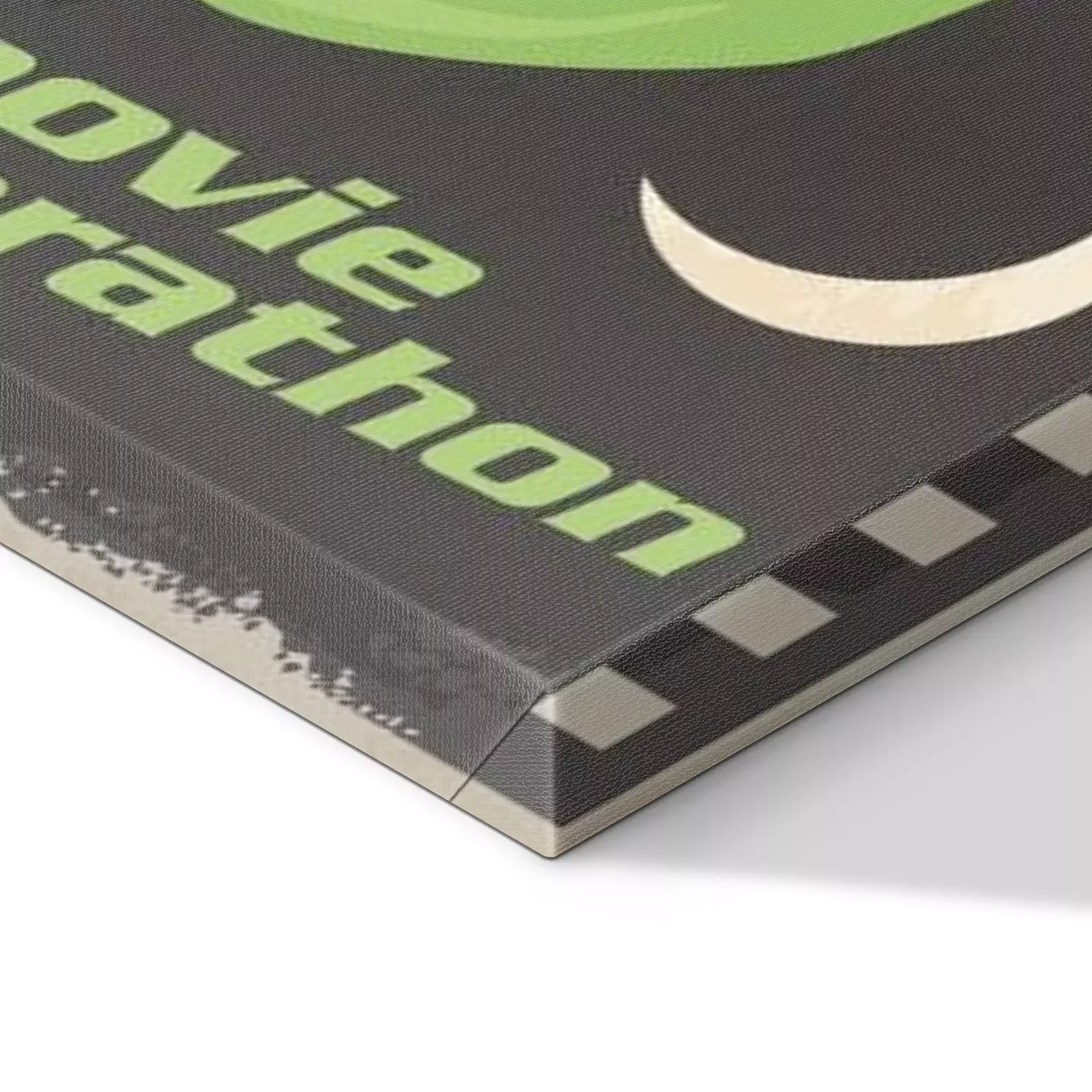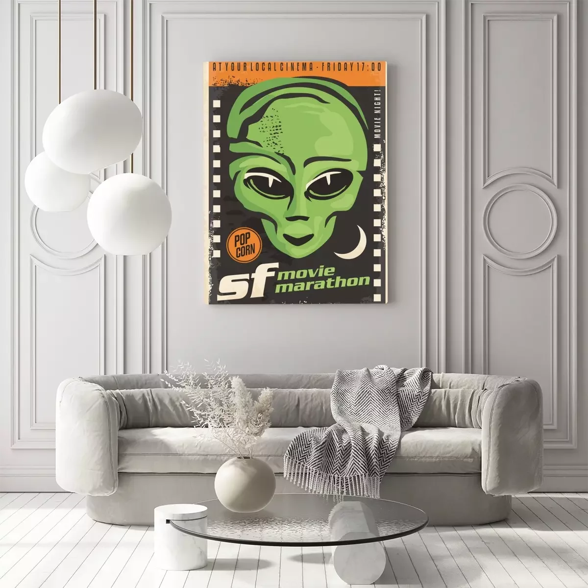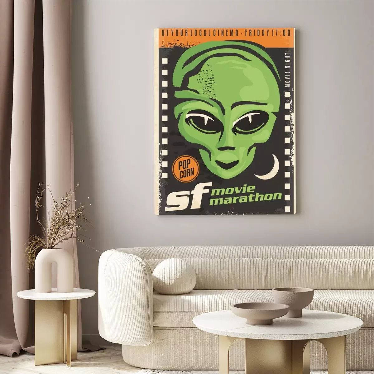 Canvas Ontwerp van de de nacht retro affiche van de science fictionfilm met vreemdeling en filmstrook op donkere achtergrond. Bioscoop evenement vintage flyer.