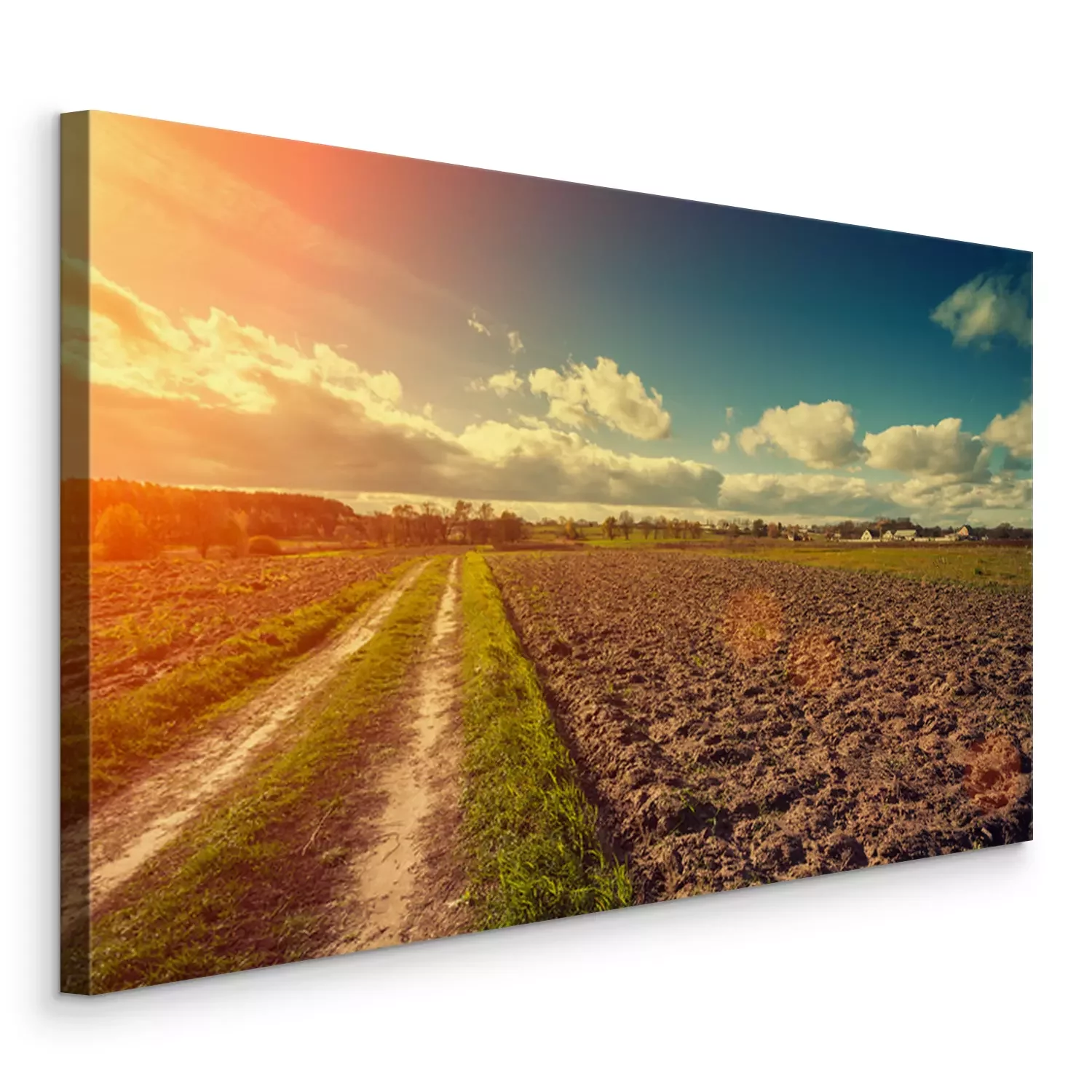 Canvas: Onverharde weg op het geploegd veld bij zonsondergang