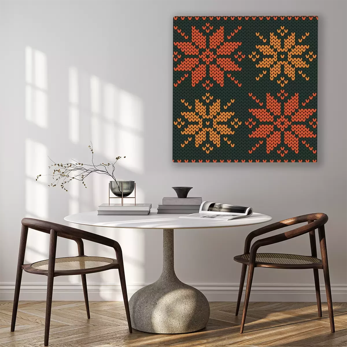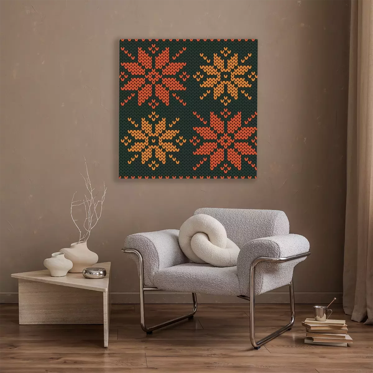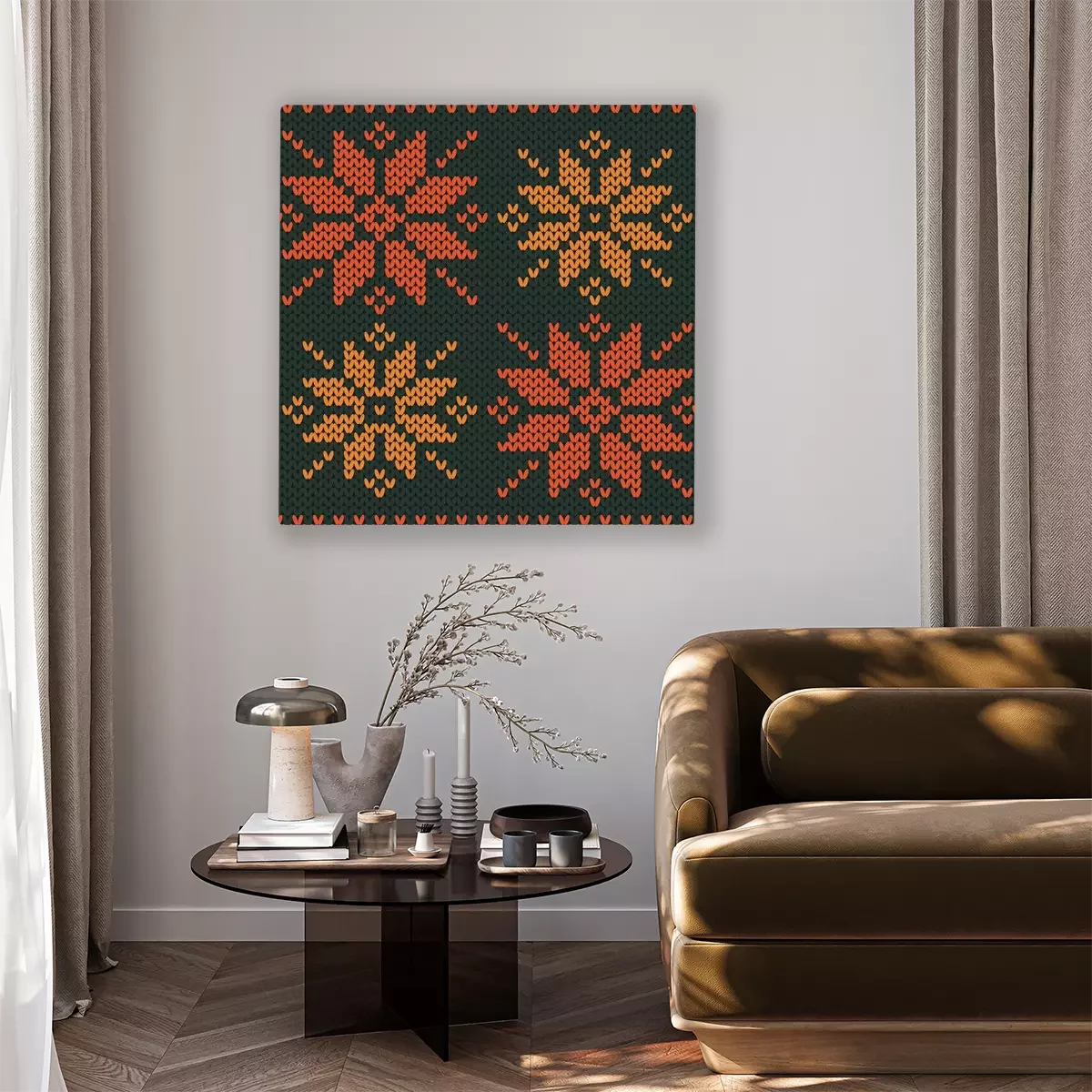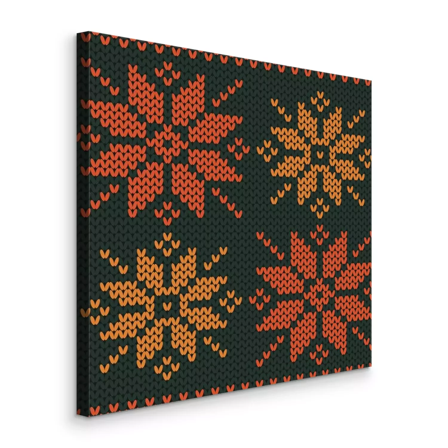 Canvas: Oranje geel gebreid sneeuwvlokken op een donkere groene achtergrond. Horizontaal naadloos gebreid patroon.