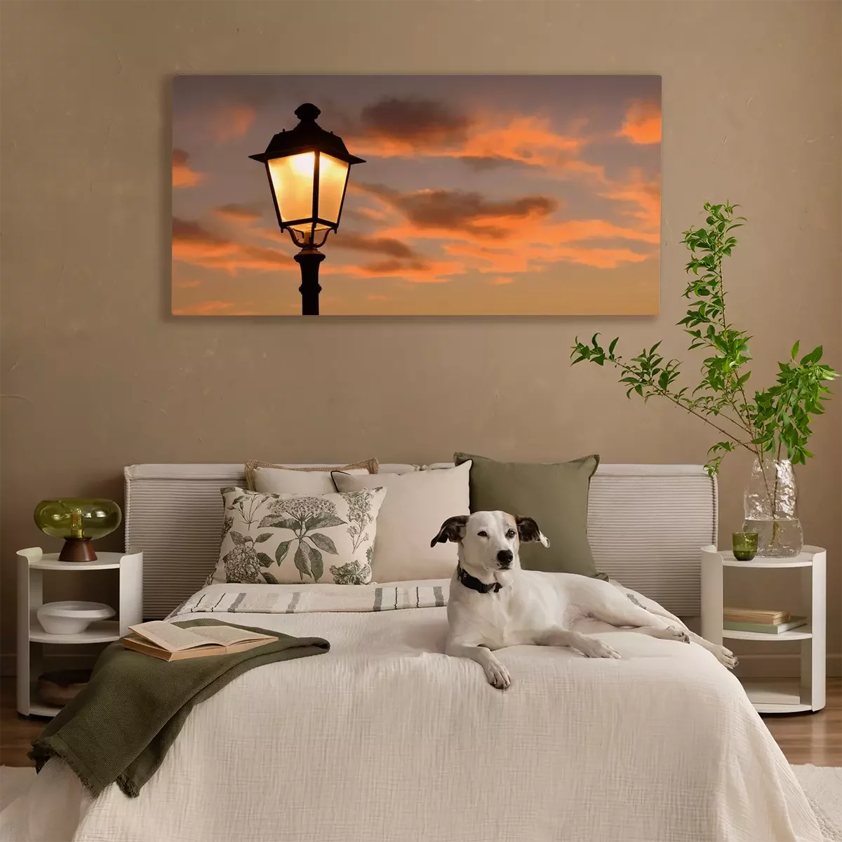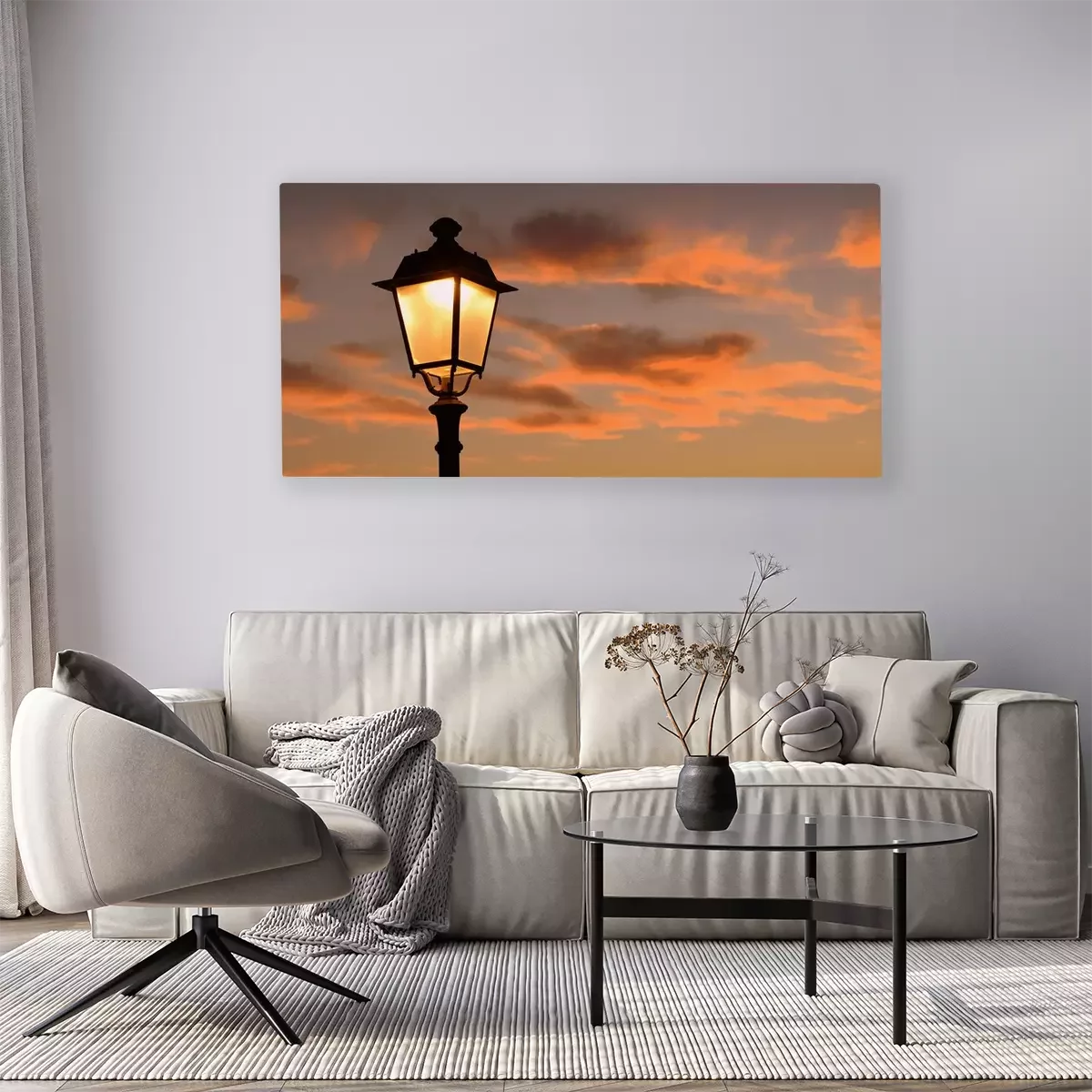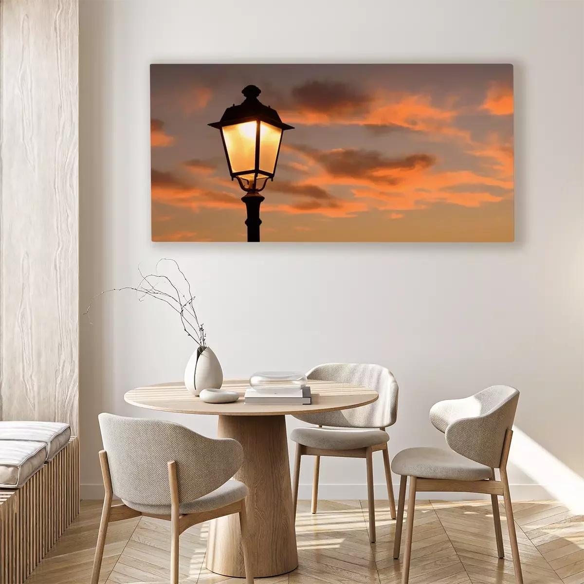 Canvas: Oranje gloeiende avondlucht, omlijst door takken en antieke lantaarn op de achtergrond
