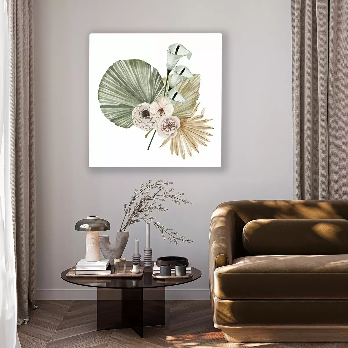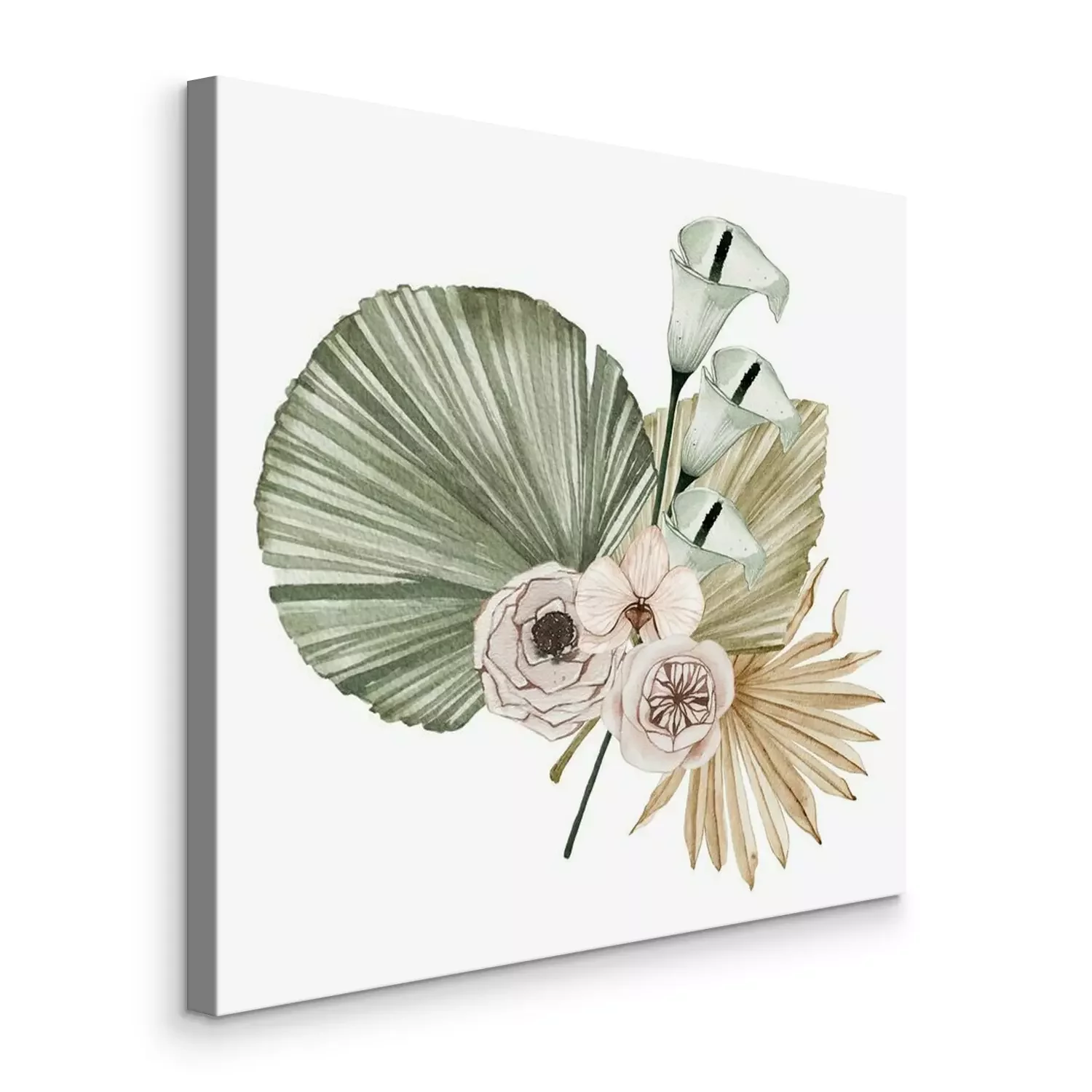 Watercolor summer floral tropical bouquet with orchid rose flowers dried palm leaves isolated. Floral spring arrangement blossom boho wedding invitation save the date card illustration
